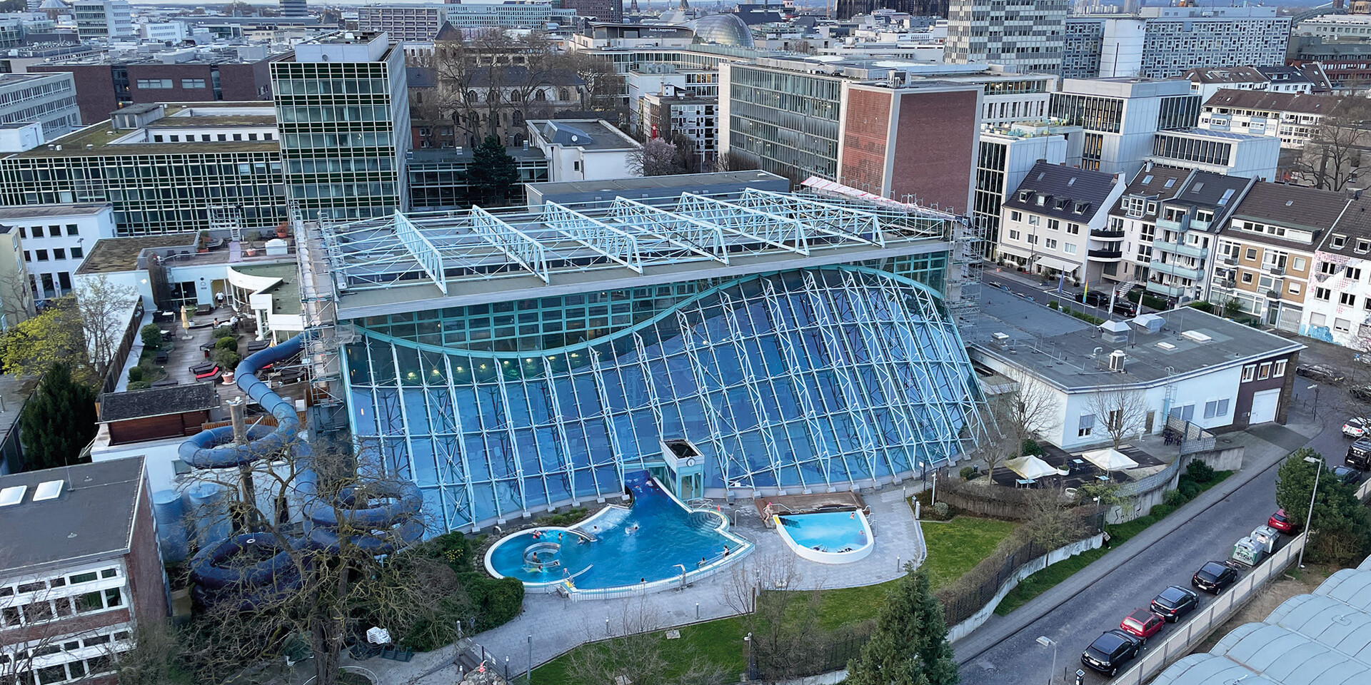 Unweit des Kölner Doms liegt eines von unseren aktuell 14 laufenden Bäderprojekten. Das Agrippabad wurde in den 1950er Jahren errichtet und von 1998 bis 2000 generalmodernisiert. Nachdem zunächst der Fokus auf der Modernisierung und Neugestaltung von Saunalandschaft und Fitnessbereich lag, folgte nun im zweiten Step der Auftrag der Köln Bäder GmbH für die Erneuerung der kompletten Südfassade. Die bislang geschwungene, schräg stehende Tragstruktur wird durch eine neue Fassade mit vorgelagerter Dachterrasse ersetzt. Diese ist zum einen deutlich leichter zu reinigen und zu warten, zum anderen entstehen dadurch neue Liegeflächen im Außenbereich. Die Baumaßnahme soll Anfang 2025 beginnen und wird unter laufendem Schwimmbadbetrieb durchgeführt.