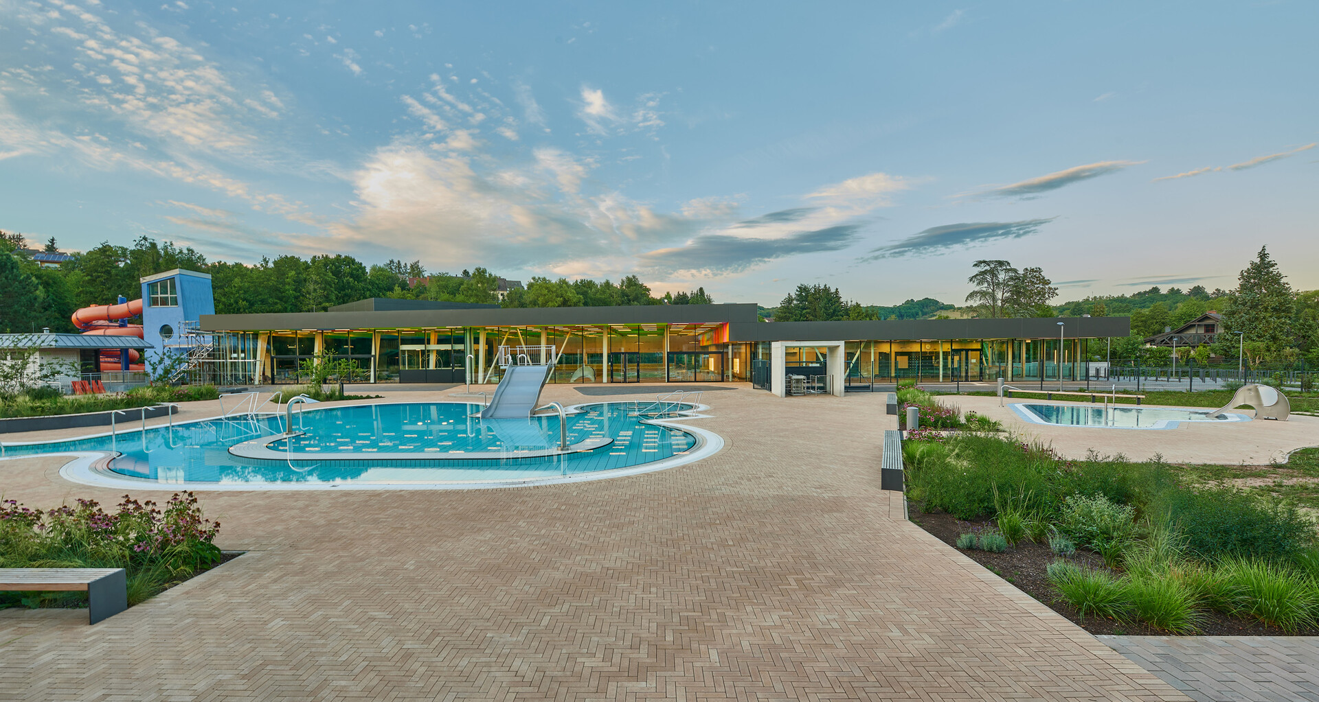 Die Sanierung des Bade- und Freizeitparks Vitalbad in Kusel im Pfälzer Bergland ist abgeschlossen. Gestalterisches Ziel war es, Hallen- und Freibad zu einer Einheit zusammenzufassen und eine attraktive Badelandschaft mit hoher Aufenthaltsqualität und eigenständigem Charakter zu entwickeln. Dabei wurden Synergieeffekte für einen wirtschaftlichen Betrieb maximal ausgeschöpft. Eine farbenfrohe Gestaltung zieht sich durch das gesamte Gebäude. Insbesondere die frische Deckengestaltung verleiht dem Vitalbad eine eigene Identität und heitere Atmosphäre.