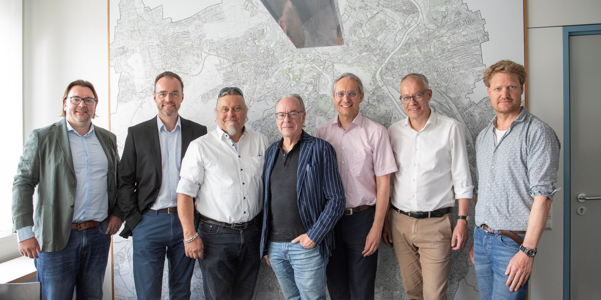 Foto Vertragsunterzeichnung von links: Elvir Komsic und Alexander Albrand, Stuttgarter Bäder; Joachim Maier, Ulle Tillmanns und Marco Lassnig von POOL out of the BOX; Peter Holzer und Hendrik Biesenbach, Hochbauamt Stuttgart (c) POOL out of the BOX
