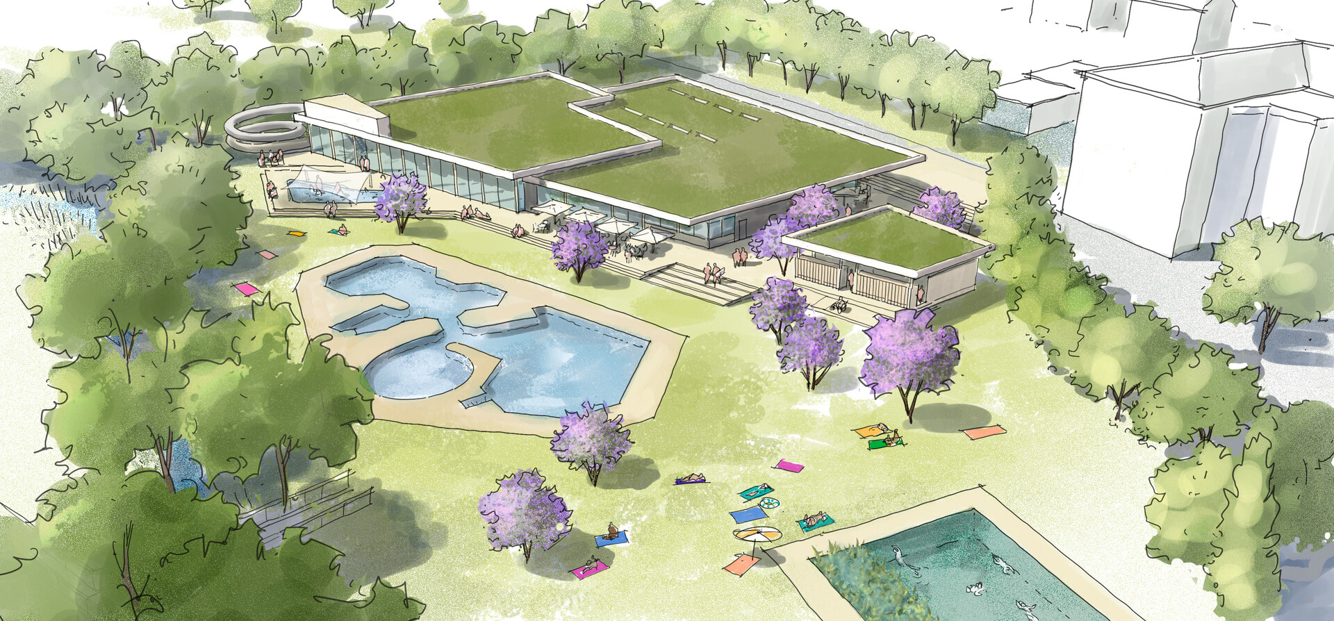 Ausgangspunkt des Konzepts ist der Ersatzneubau des durch Hochwasser beschädigten Hallenbads, das künftig gemeinsam mit dem bestehenden Freibad als effizientes Kombibad betrieben werden soll. Ein erhöhter Sockel dient als baulicher Hochwasserschutz und bildet zugleich eine terrassierte Aufenthaltsfläche, die Innen- und Außenräume eng miteinander verzahnt.
