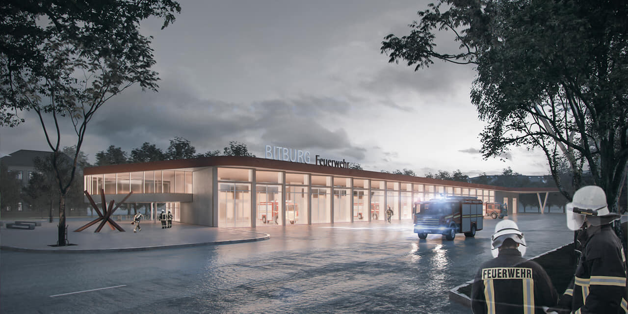 Der Wettbewerb für das neue Schutzzentrum in Bitburg ist entschieden – 4a Architekten haben gemeinsam mit Transsolar KlimaEngineering eine Anerkennung erhalten. Das langgestreckte Feuerwehrgebäude mit dynamischer Bauform wurde in Holzhybridbauweise geplant. Mit seiner schwungvollen Gestaltung nimmt es eine Sonderstellung im städtebaulichen Umfeld ein und wirkt identitätsstiftend.