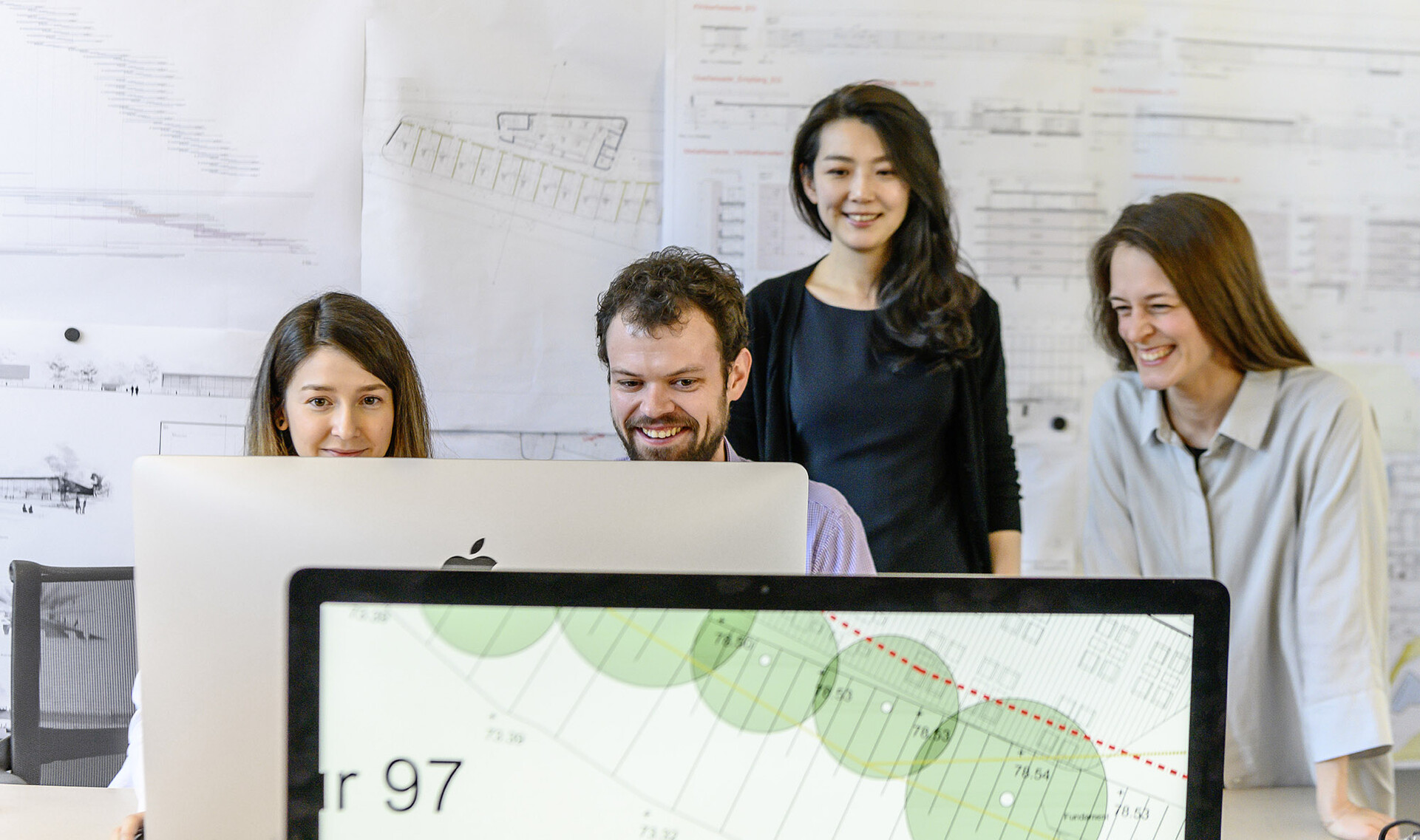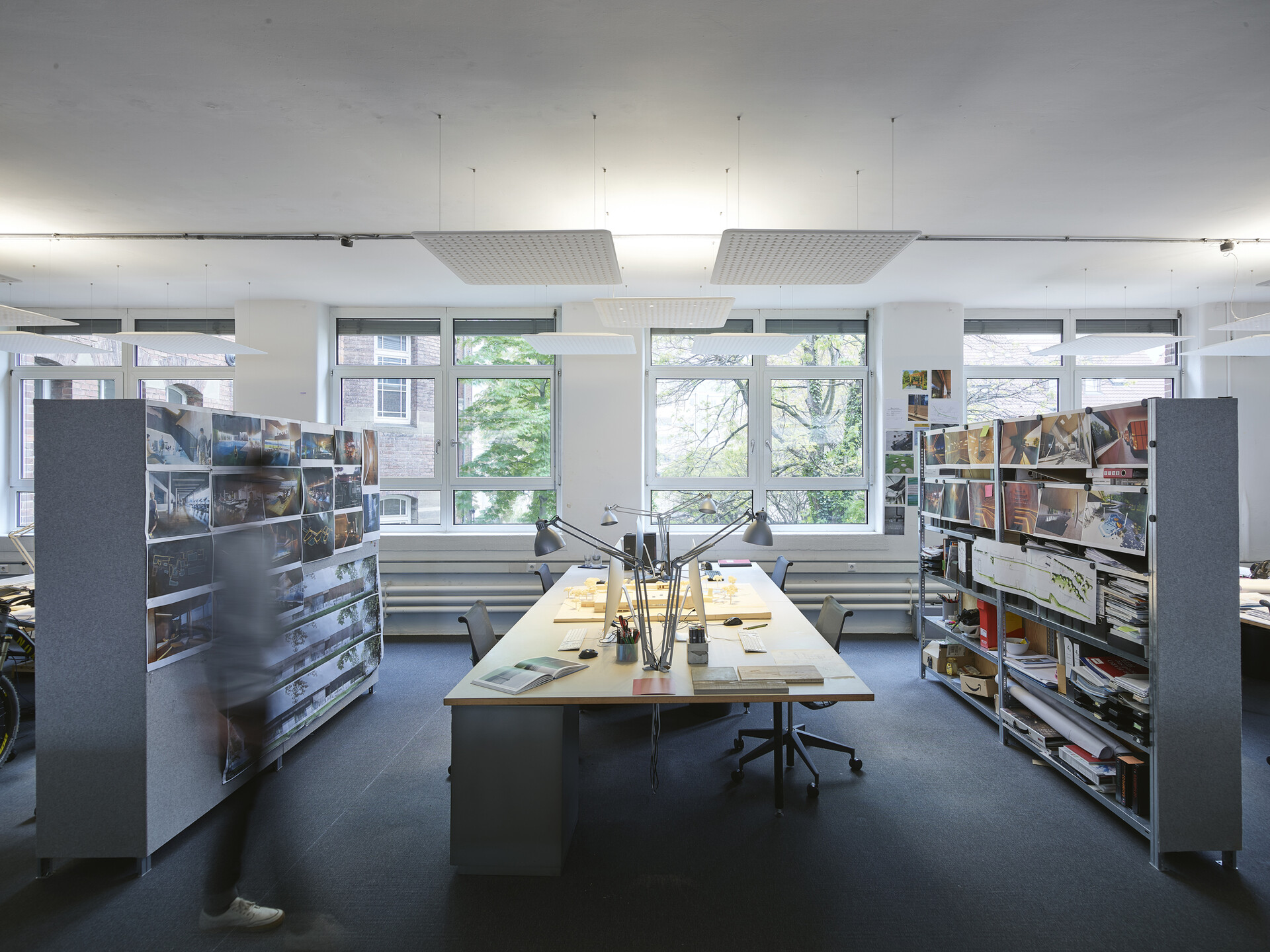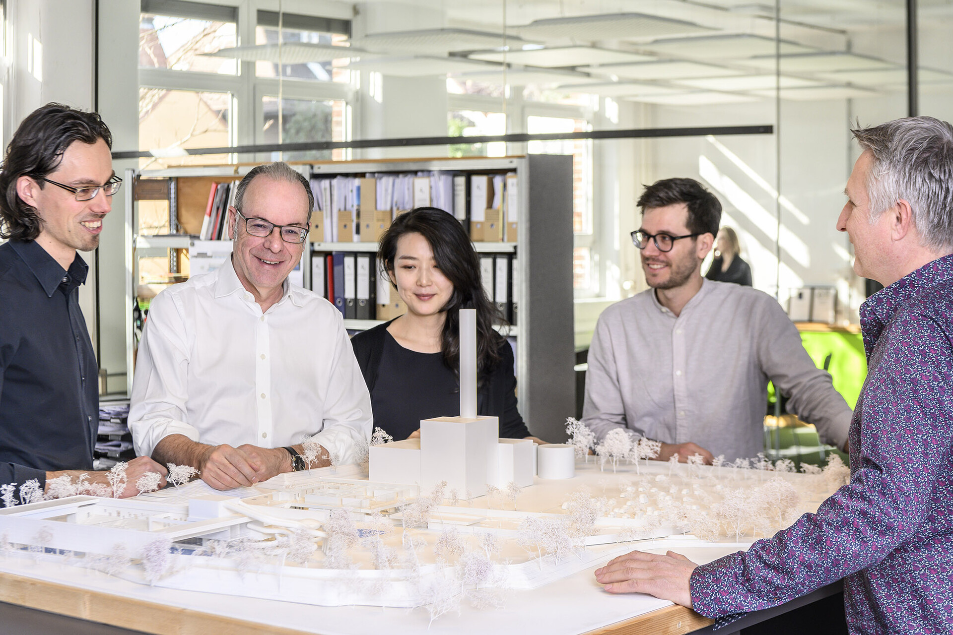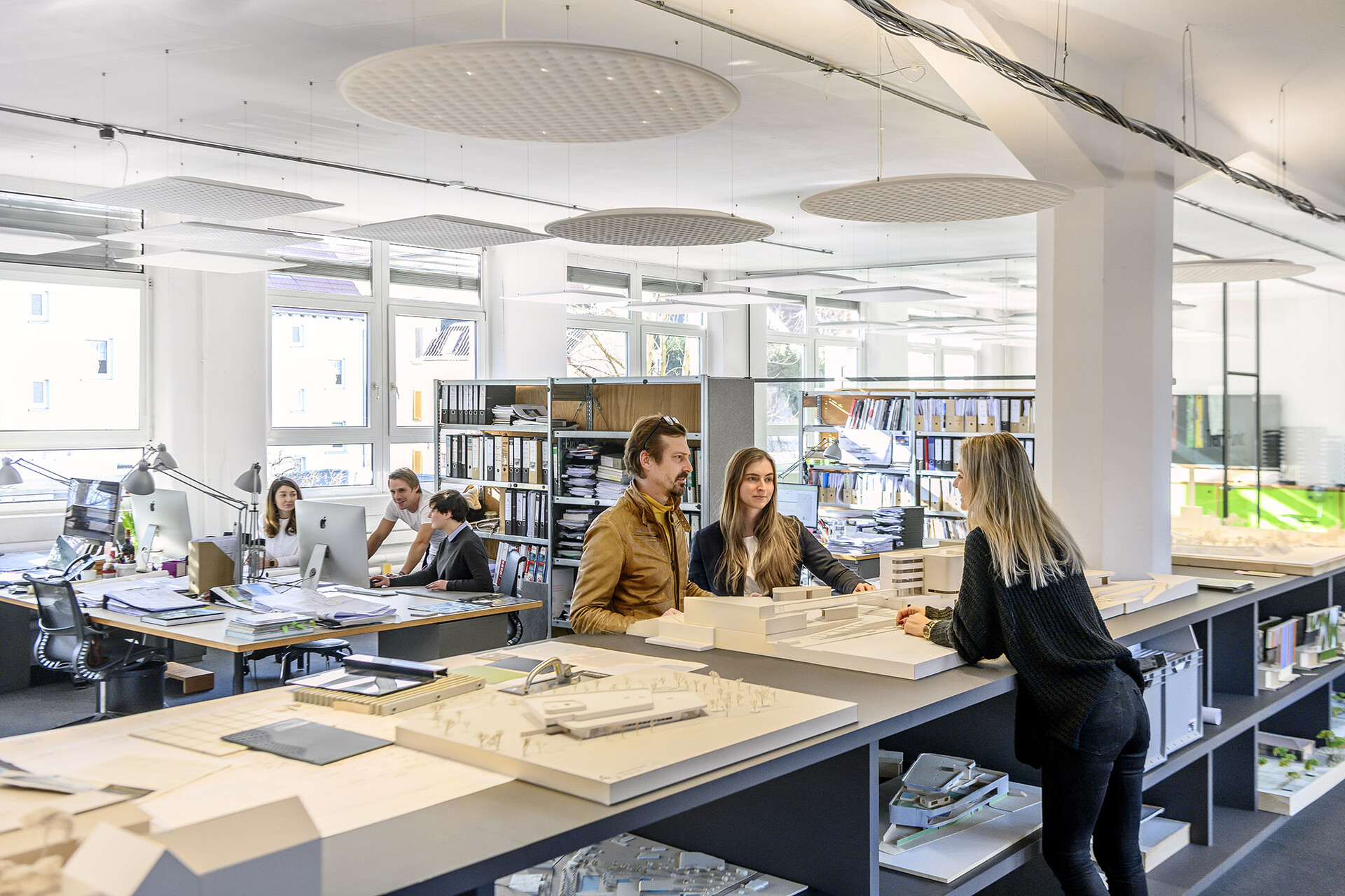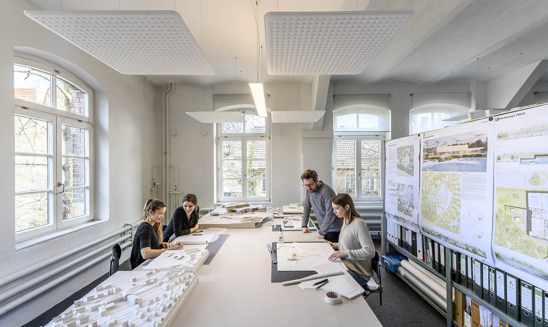 ...„Ihr Büro haben sie in Stuttgart-Bad Cannstatt in einer Etage von „Prima Donna“, der ehemaligen „Wilhelm-Mayer-Ilschen Korsett- und Trikotagenfabrik“ eingerichtet, eine Art Kreativquartier, in dem Grafiker, Musiker, Kommunikationsagenturen und Medienproduzenten zuhause sind. Es gibt reichlich Platz hinter den alten Backsteinfassaden, ein Loft, das auch ein paar spontan angetackerte Pläne nicht übel nimmt. In jedem Raum stehen Modelle, meist ganze Badelandschaften samt Umgebung. Wo sich früher die Näherinnen drängten und ordentliche, steife Leibchen fertigten, wird heute luftige, offene Architektur entwickelt. Einmal hat sie ihr früherer Chef im neuen Büro besucht und bemerkt, der Teppichboden sei zu schwarz. Das war Günter Behnisch. Bei ihm hatte alles begonnen."