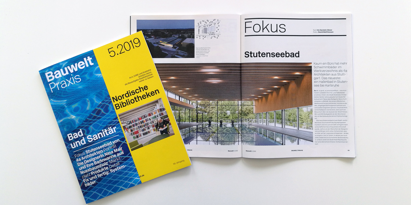 The architecture magazine Bauwelt reports in the issue 5.2019 about our latest swimming pool project, the indoor swimming pool in Stutensee. Strictly developed with a pointed pencil according to economic aspects, the author Iris Darstein-Ebner says that it nevertheless meets the needs of the citizens. Why this is so: Read for yourself