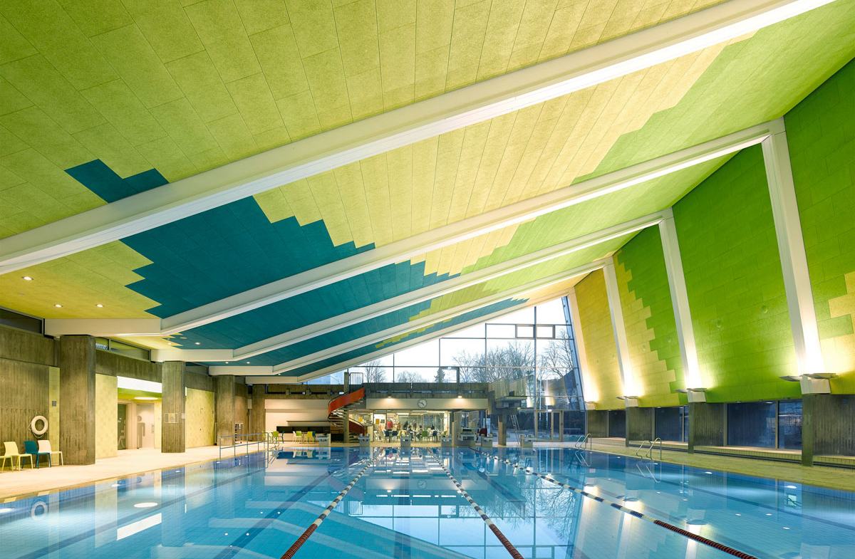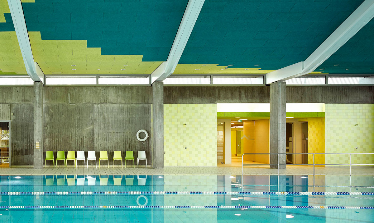The WOOD WOOL AWARD™ is given by the Danish company Troldtekt A/S in recognition of contemporary buildings in which lightweight wood-wool boards support and enhance architectural expression. In the "Other manufacturer" category the use of lightweight wood-wool boards in the refurbishment of the Leonberg sports centre won over the jury consisting of internationally recognised architects. The material was used in the project not only for its excellent properties with regard to acoustics and durability but equally with regard to its potential for structuring the colour design. The coloured panels lend a particular atmosphere to the spaces and moreover form part of the sports centre’s routing system.