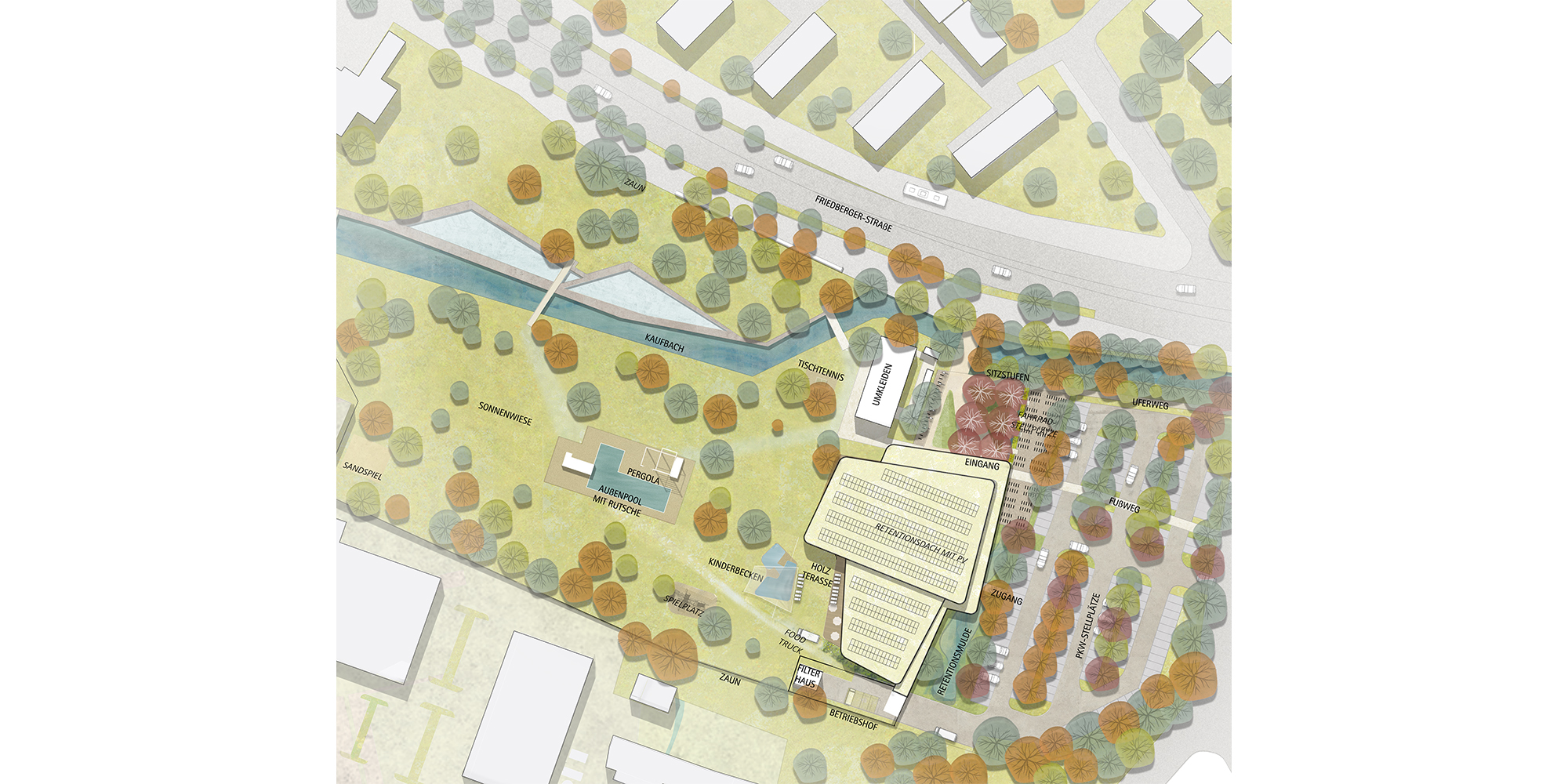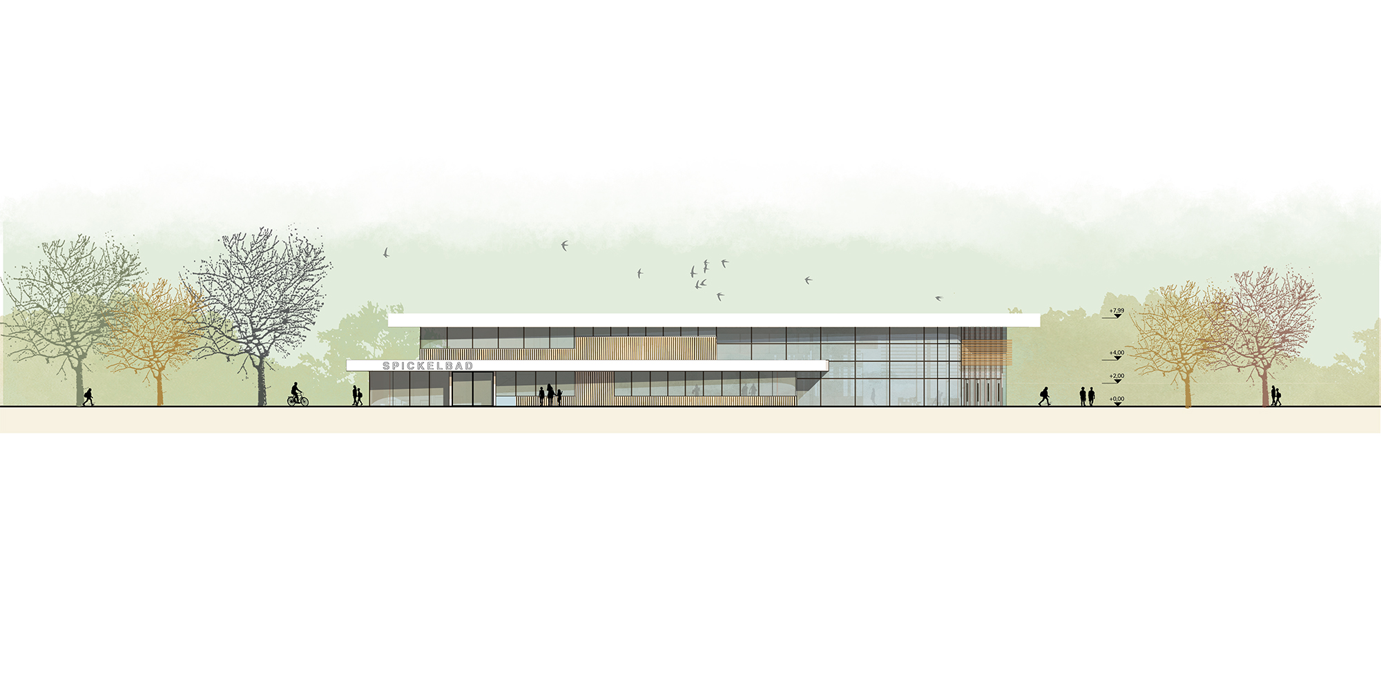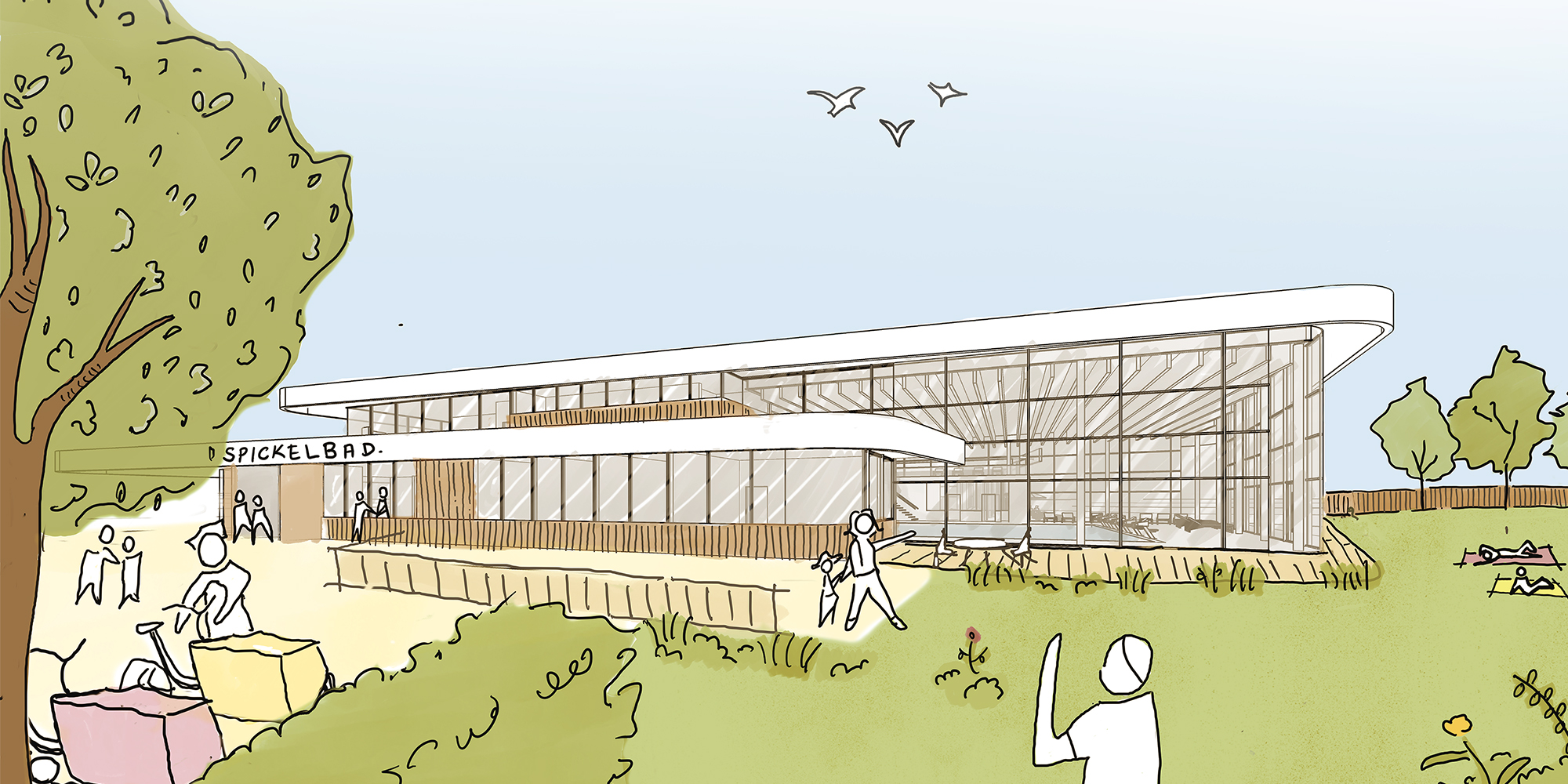 Nach über fünfzig Jahren Betriebszeit soll das Spickelbad durch einen Neubau ersetzt werden. Das Spickelbad liegt unmittelbar am Fribbe-Freibad und bietet dadurch eine einzigartige Schwimmatmosphäre zwischen Innen- und Außenraum. Der Entwurf nutzt diese besondere Lage und öffnet sich mit einer transparenten Westfassade zum Gelände des Fribbe-Freibads. Der Baukörper mit abgerundeten Ecken bildet einen sanften Kontrast zur geradlinigen Geometrie des Kaufbach-Kanals und vermittelt eine weichere, fließende Architektursprache. Besonderer Wert wird auf Nachhaltigkeit gelegt: Geplante Photovoltaikanlagen und begrünte Dächer tragen wesentlich zu Energieeffizienz, Klimaschutz und einer ökologisch hochwertigen Gestaltung bei.
