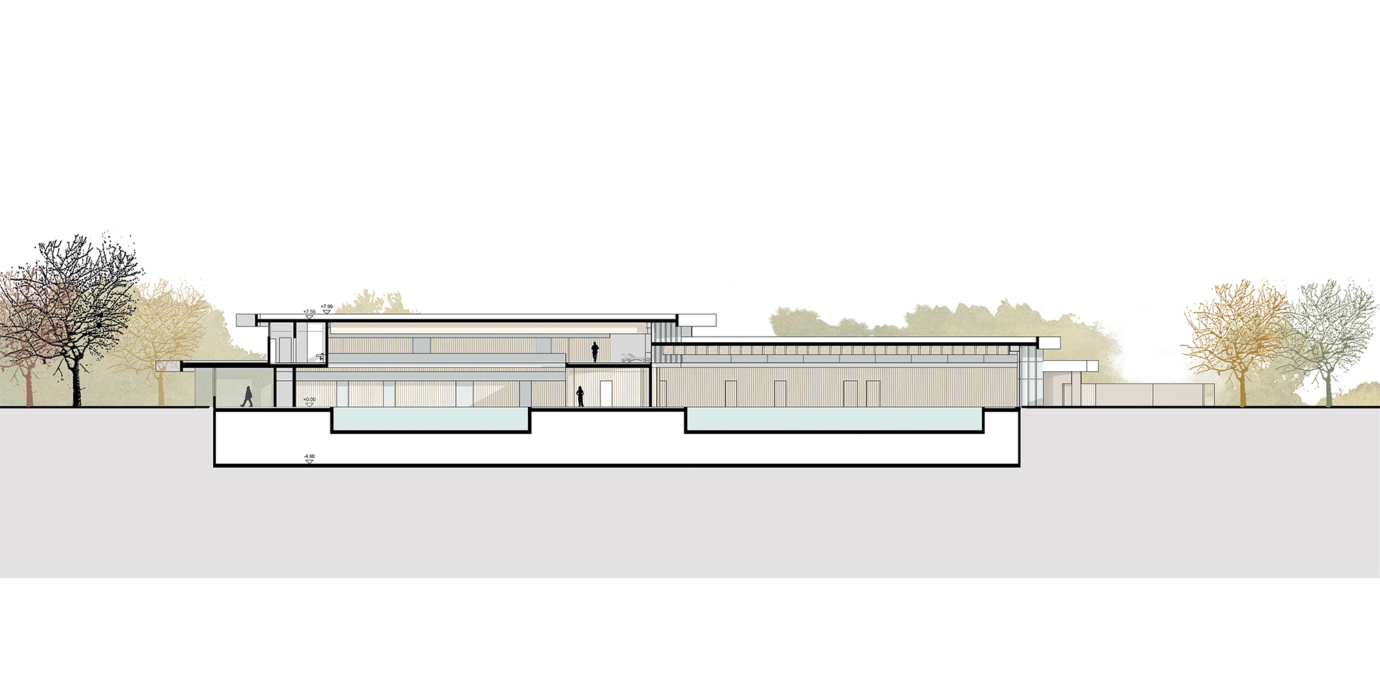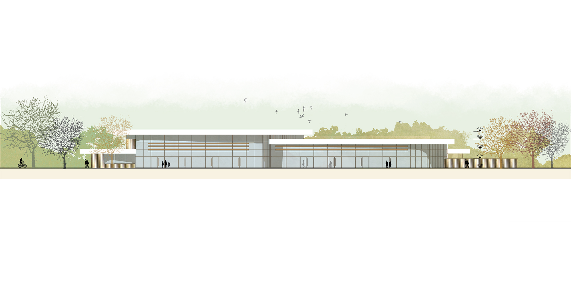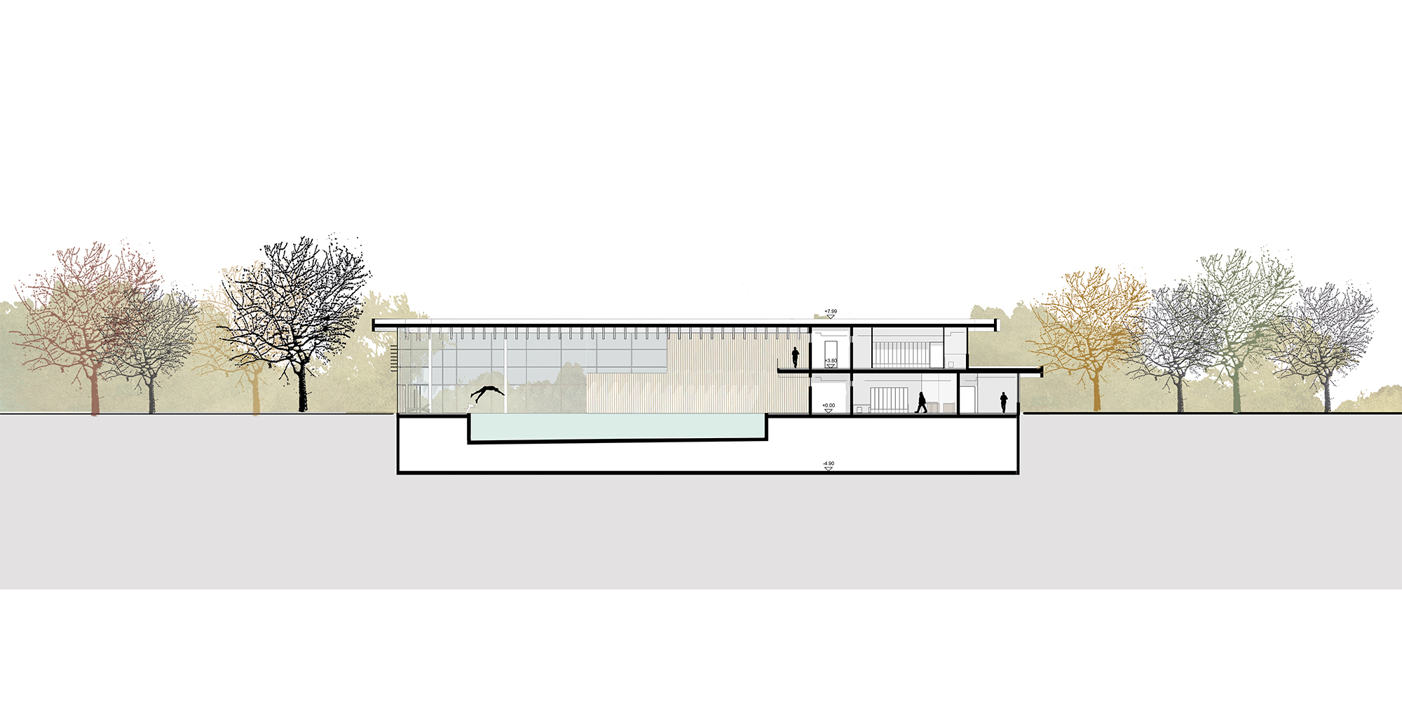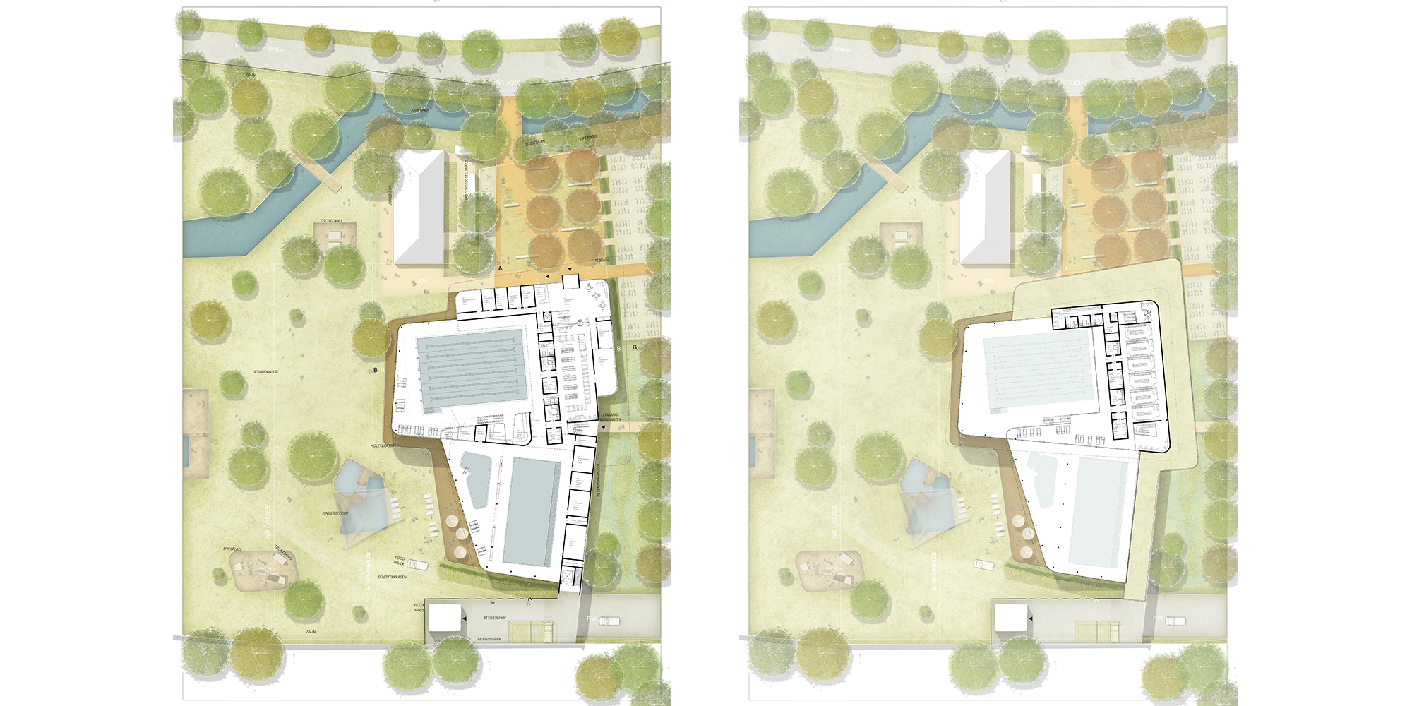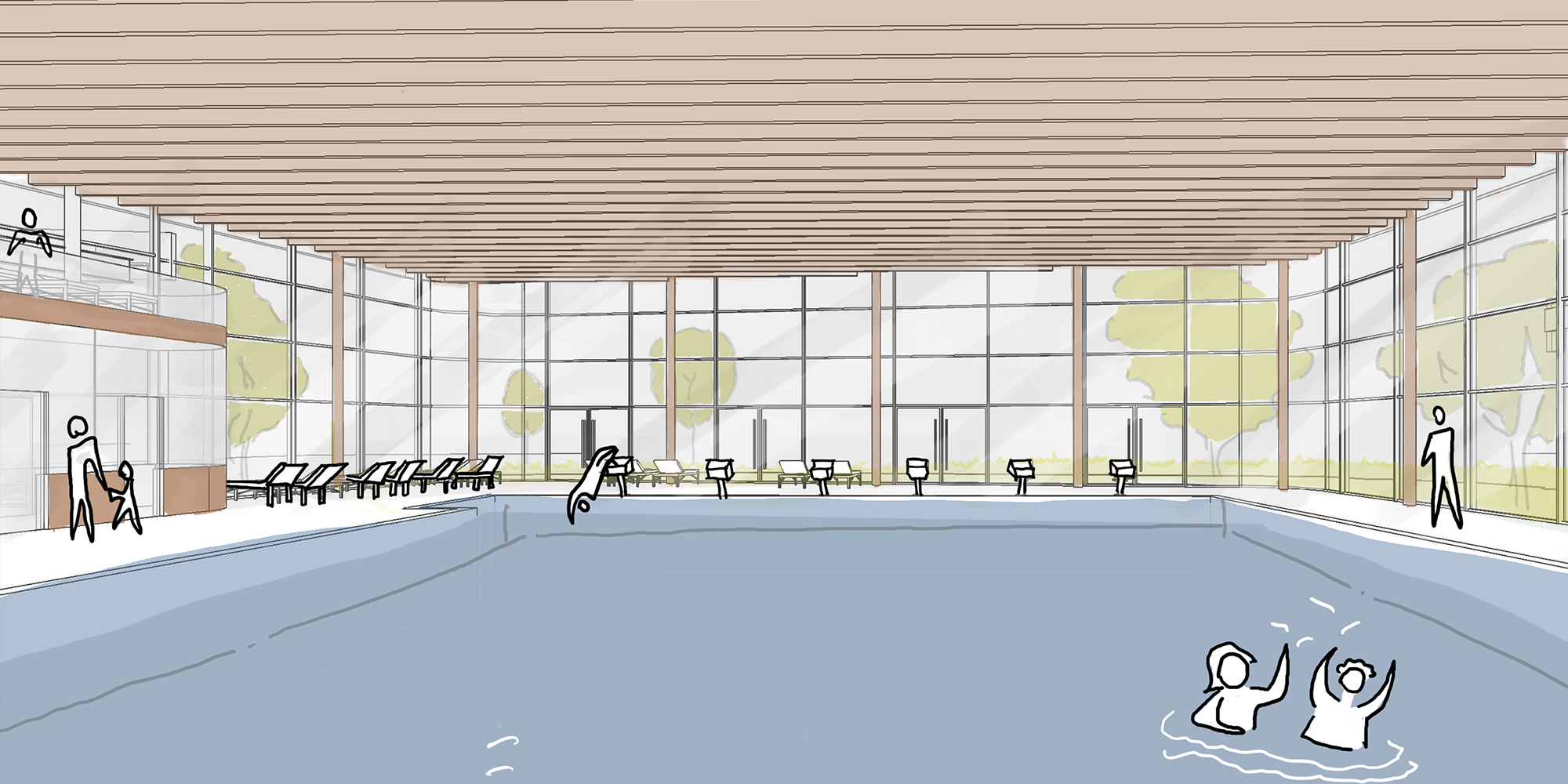 Das Hallenbad ist in drei Baukörper gegliedert. Der erste und höchste Baukörper überspannt das 25-Meter-Sportbecken und beinhaltet die dafür erforderlichen Obergeschosse. Der mittlere Baukörper umfasst das Lehrschwimmbecken sowie den Kinder- und Aufenthaltsbereich; er öffnet sich sanft in die Freianlagen und bildet die räumliche Verbindung zwischen Innenraum und Außenraum. Im niedrigsten, eingeschossigen Baukörper sind die Eingangshalle sowie die Nebenräume angeordnet. Diese klare Dreiteilung erzeugt eine differenzierte, architektonisch prägnante Gebäudefigur, die sowohl funktional als auch wirtschaftlich überzeugend ist. Durch die räumliche und akustische Gliederung der Badebereiche werden Sport- und Familiennutzung klar getrennt. Über eine Galerieebene im Hallenraum entstehen zusätzliche Liege- und Aufenthaltsbereiche mit Blick in die Schwimmhalle, die die Aufenthaltsqualität für die Besucher*innen deutlich erhöhen.
