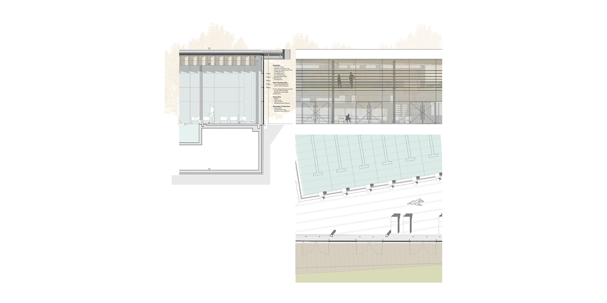 Das Tragwerk des Gebäudes wird als Holz-Hybridbau geplant. Das Ziel des Entwurfs ist es die wichtigen Anforderungen an eine nachhaltige und gleichzeitig dauerhafte Bäderplanung zu vereinen. Das Untergeschoss, Beckenkonstruktionen und andere hochgradig Wasserbeanspruchte Bauteile wie Sanitärbereiche, werden in Stahlbetonbauweise ausgeführt. Durch eine optimierte Bemessung und sinnvolle WU-Planung werden Beton- und Betonstahlmengen soweit reduziert wie möglich. Der Boden der Umkleidebereiche im OG wird als HBV-Decke geplant. Sämtliche andere Decken und Dächer werden in reiner Massivholzbauweise realisiert. Für die weitgespannten Dächer über den Badehallen wird eine sehr materialsparende und gleichzeitig kompakte Rippendecke gewählt. Diese besteht aus schlanken BSH-Rippen mit nur 12cm Breite, die in einem Abstand von ca.80cm angeordnet werden. Die oberseitige 60mm Brettsperrholzplatte wirkt im Verbund mit den Rippen und garantiert damit eine sehr effektive und wirtschaftliche Konstruktion. Die modularen Rippenelemente werden im Werk vorgefertigt und stellen damit hohe Qualität und eine schnelle Montage sicher. Ausbaugewerke wie ELT und abgehängte Decke können bereits im Werk vorinstalliert werden. Dadurch kann auf ein aufwendiges Raumgerüst verzichtet werden. Umlaufend an der Fassade dienen reduzierte Stahlträger als Auflager für die Holzrippenmodule. Diese Randträger befinden sich oberhalb der Abhangdecke und treten daher nicht in Erscheinung. Als Dachstützen werden schlanke und dauerhafte Stahlrundrohrstützen gewählt, um zum einen eine möglichst freie und luftige Durchsicht der Glasfassade zu erlauben andererseits, um Dauerhaftigkeitsproblem durch Spritzwasser, wie es bei Holzstützen der Fall wäre, zu vermeiden. Für die Ausführung der Stahlbetonkonstruktionen wird ein Recyclingbeton mit zusätzlich CO2-armen Zuschlagsstoffen gewählt. Der CO2 Beitrag des Massivbaus kann so zusätzlich zu konstruktiven Maßnahmen um ca. 40% reduziert werden. Der grundsätzlich hohe Holzanteil durch die Holz-Hybrid-Konstruktion wirkt sich zudem sehr positiv auf die CO2-Bilanz des Gebäudes aus.