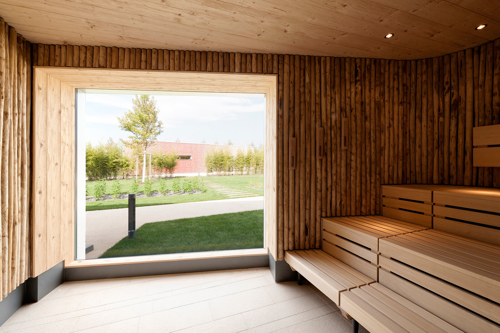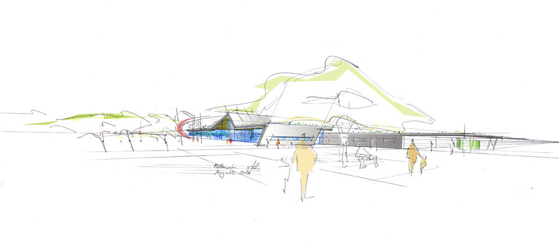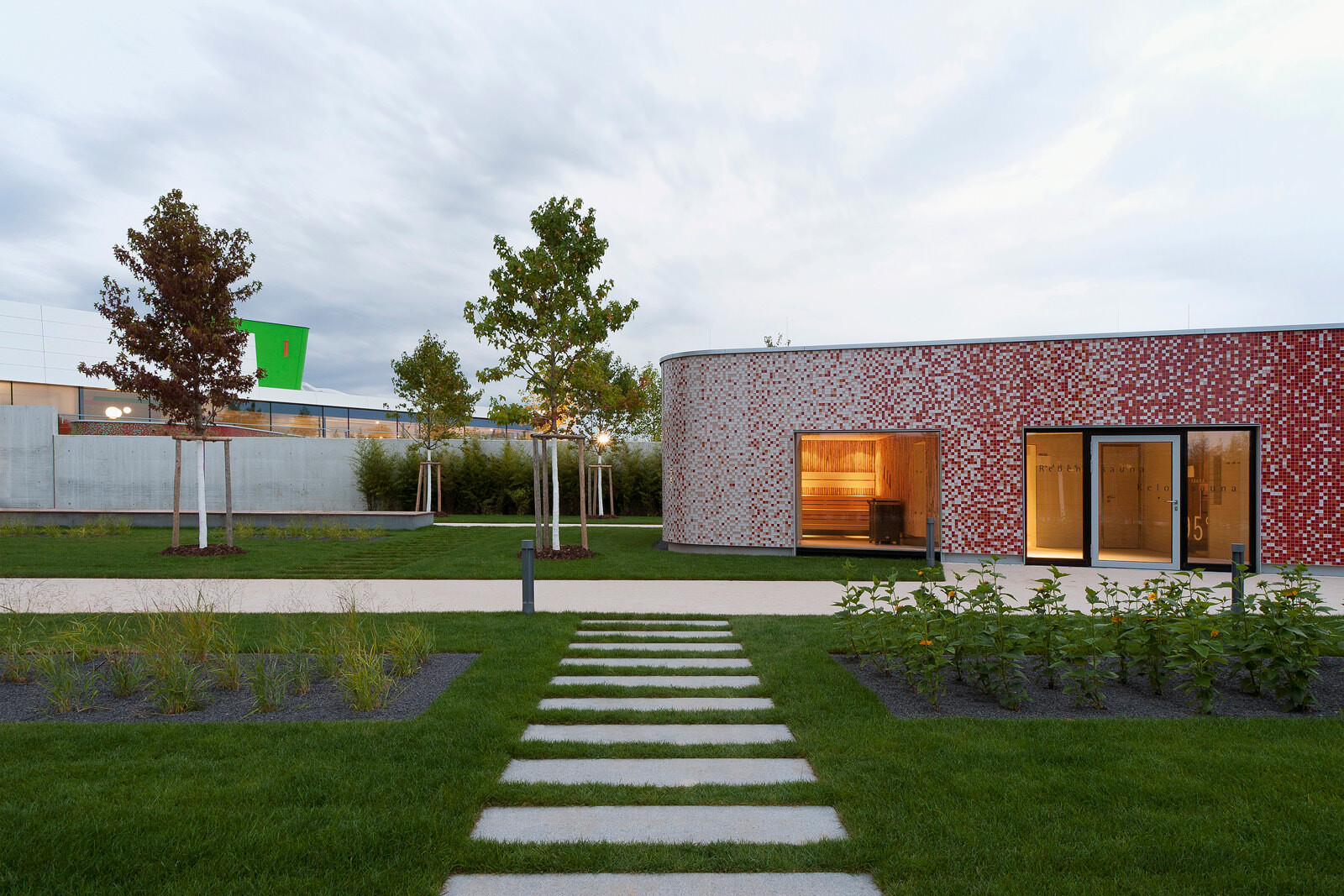 The F.3 aquatic centre combines three separate areas – the sports area with indoor pool and open-air pool, the adventure pool and the sauna world. These areas have been transferred into a flowing form that gently blends into the landscape and picks up on regional aspects in both shape and design. The location on the western edge of the town of Fellbach near to the Kappelberg was the starting point and the guiding theme in shaping and designing the new amenities. As one of the well-known vineyards in the region, the Kappelberg and the theme of wine provided the basis for the architectural concept. To formally incorporate the building into the landscape, the linear vineyard structures were laid onto the plot as fields. The material and colour design is also in keeping with the guiding principle of the architecture. The central design element are mosaic tiles which reflect the changing seasons.