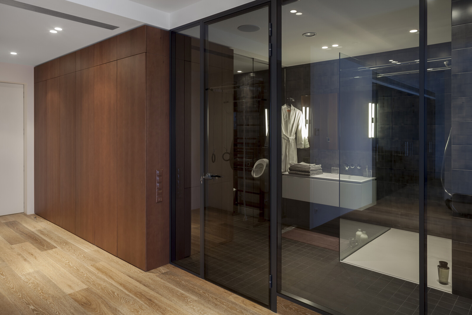 This spacious apartment is located in a residential high-rise building in the Moscow district of Skolkovo. In accordance with the client’s request for spaciousness, five separate living units were combined into a single apartment on one storey. In order to make use of the areas in accordance with the desired requirements, the entire layout needed to be completely reorganised based around the load-bearing walls. New dividing walls and openings in the original structure enabled the rooms to be optimally coordinated while avoiding long corridor zones. The spatial concept comprises the following functions: Separate private areas for the clients, one of which containing an integrated sauna area, a living room with a dining area and kitchen, a children’s area and a utility area. The centrally arranged living and dining area has a bio-fireplace and seawater aquarium and serves as a link between the individual functional areas. The clients’ private rooms are located on one side while the children’s area and the utility area are arranged on the other. Each room was designed and furnished individually to suit its intended purpose. Here too, the shared living and dining area has been given a unifying function with regard to the choice of colour and material with subtle, well coordinated colours and selected materials creating a pleasant atmosphere. The oak-parquet and natural-stone flooring forms a discreet backdrop for the high-quality furnishing of the rooms. One wall in the entrance area is covered with greenery up to the ceiling and provides an eye-catching feature. While the private area for the female client has been designed in warm earthy tones – her bathroom, for example, has been executed in sandstone – the male client’s retreat is dominated rather by cool shades. While intensive colours and colour gradients come into play in the children’s area, the design of the staff’s rooms is rather reserved. Much of the furniture in the apartment was designed by 4a Architekten and produced in local workshops. The combination of these furnishings with selected designer furniture forms a lively mix of elegance and originality.