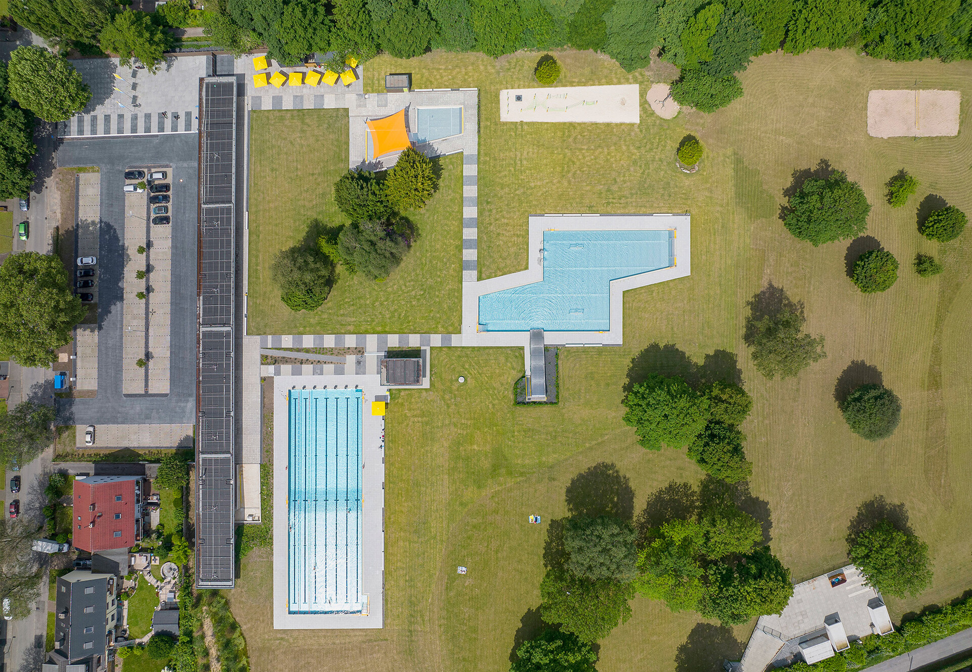 The Werne open-air swimming pool in Bochum, dating from the 1930s, is due for fundamental renovation. In addition to the pool renovation and the construction of a new children's area, a new open-air pool building with changing rooms, sanitary facilities, administration as well as storage and technical areas is planned as a prefabricated timber construction. A new bathing supervisor and a nappy-changing room with a children's toilet round off the programme. In the course of the renovation, the water areas will be reduced by about half and the concrete pools will be replaced by stainless steel pools that are more economical to maintain. The existing wide wave water slide will be retained and attached to the new pool. In the interior and exterior areas, mainly sustainable, robust and natural materials are used, such as the prefabricated wooden elements of the facade. The valuable tree population of the bathing garden will be preserved as far as possible.