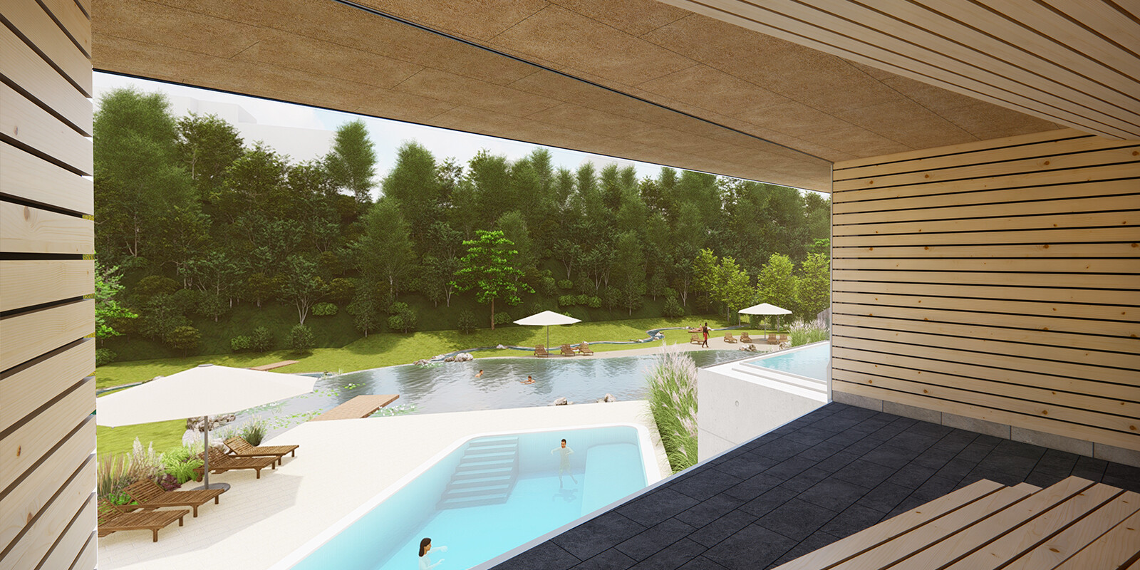 The new Heloponte II leisure complex is to replace the existing building complex from the late 1970s in the spa town of Bad Wildungen. The new building is designed as a combined family and leisure pool and includes an indoor and outdoor swimming pool area as well as a sauna facility. The aquatic centre is for school and club sports, but at the same time offers a comprehensive range of bathing facilities for all generations. A special feature is an unheated natural swimming pond with about 500 square metres of water in the outdoor area of the sauna garden.
