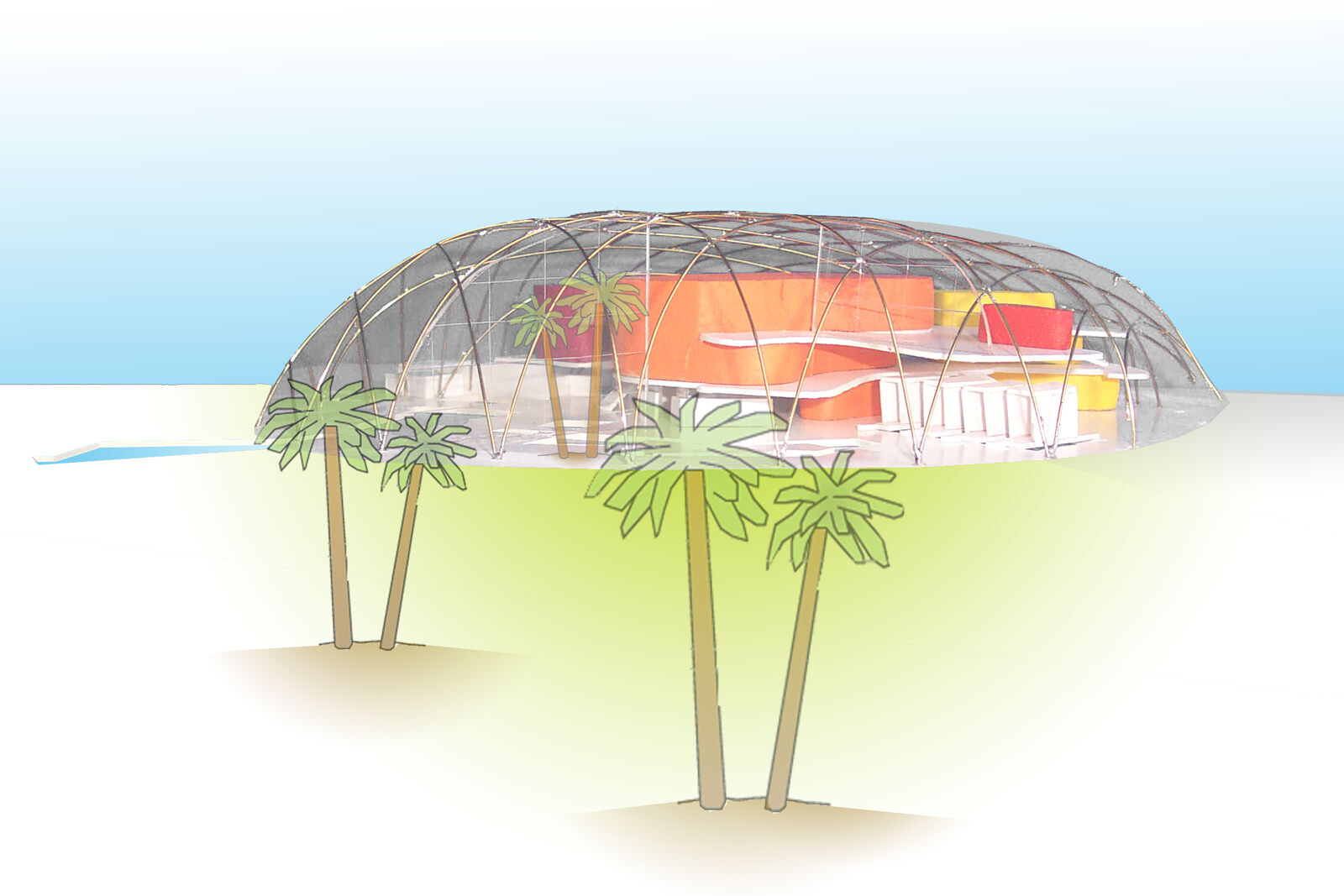 The large, conchiform shell contains the three main areas of the Shineville Resort: the landscaped bathing area, the conference centre and the tropical garden. The bathing area extends over 6,000 m² offering thermal and seawater pools, sauna and SPA areas, as well as a restaurant. The conference and thermal bath areas face the tropical garden. The hotel area is annexed to the "Muschel" ("Shell") thermal bath.