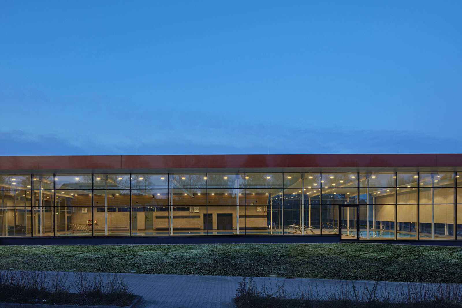 The site for the new pool is located on the northern outskirts of the city of Riedlingen, in the immediate vicinity of the school campus with a middle school and a grammar school. The indoor pool will be used primarily by schools and clubs with provision for additional use by the public. The building is set on a slope and towards the northeast it forms a two-storey construction. An exterior staircase leads the visitor from the car park straight to the upper main entrance. From the entrance area on the ground floor, ceiling-high glass façades allow a clear view into the swimming area, creating a dialogue between arriving visitors and swimmers. The ground floor is clearly structured and into four zones: entrance hall, changing rooms, connecting sanitary area and swimming hall. The swimming hall is glazed up to the ceiling on three sides, giving rise to a generous feeling of space. Wooden decking will be provided in front of the narrow side of the building to the southeast, allowing views across the neighbouring open spaces. With its uniform façade, the ground floor forms an eye-catching structure. The changing materials towards the basement and the overhung barefoot walkway give the ground floor a floating appearance.
