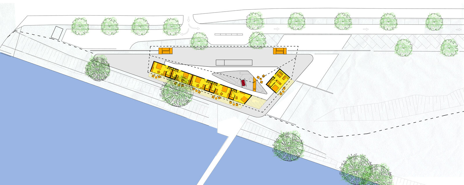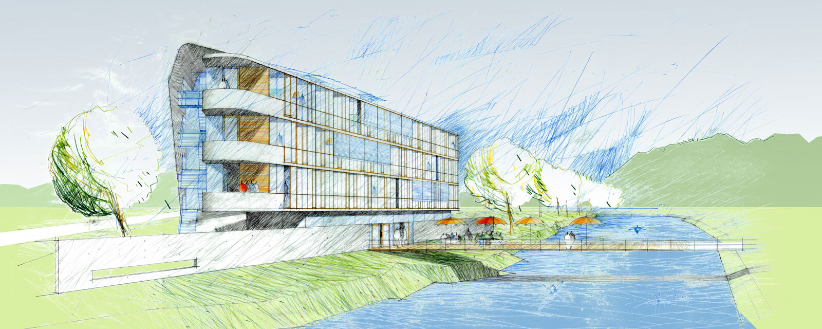 The site on which the hotel is to be realized is located on the banks of the river Danube opposite Tuttlingen Guildhall. The distinctive triangular shape of the building develops from its urban setting. The ground floor comprises general function areas such as the reception, restaurant, bar and kitchen, along with conference rooms. The central element of the front lobby is a glass-roofed open-plan atrium which extends over four storeys, generously providing the interior with daylight. The hotel rooms are arranged over three storeys around this atrium with views of the guildhall, the Danube and the Leutenberg. In addition, hotel suites with roof terraces and a fitness and sauna area are located on the top floor.