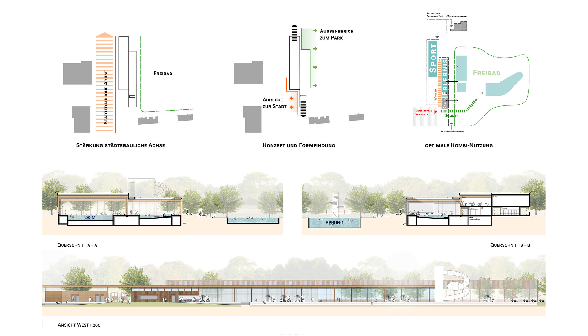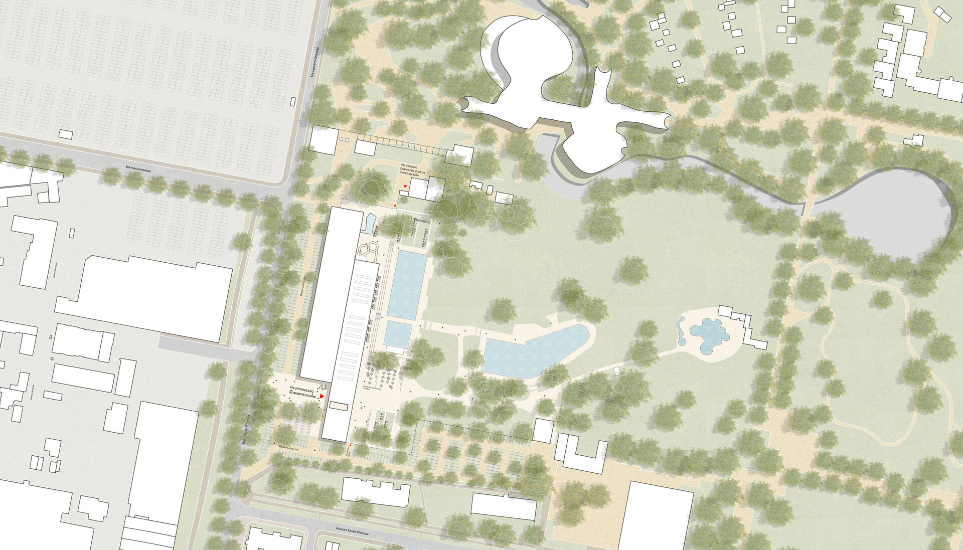 The new construction of the combination bath forms a calm and clear large form, which positions itself powerfully and identity-forming in the urban space. The two elongated building blocks along Max-Joseph-Strasse are slightly displaced from each other and form a striking opening for the new extended Herzogenried combination bath. The interior of the building reflects the zoning into sports and family areas. Visually, acoustically and also climatically, two zones are being created that take into account the respective uses. The adventure and leisure facilities are arranged in connection with flanking, spacious rest areas in the eastern hall facing the outdoor pool. The restaurant and the seating area are within view and have a direct relationship to the outside space. The sports pools are located in the western part of the hall and enable athletes and school classes to use the swimming and course pool in an undisturbed, concentrated manner. The light-flooded atmosphere as well as the views and references to the green open space present everywhere ensure the high quality of stay in the entire pool. Wood is used as an essential component of the material concept for the facades and the supporting structure.