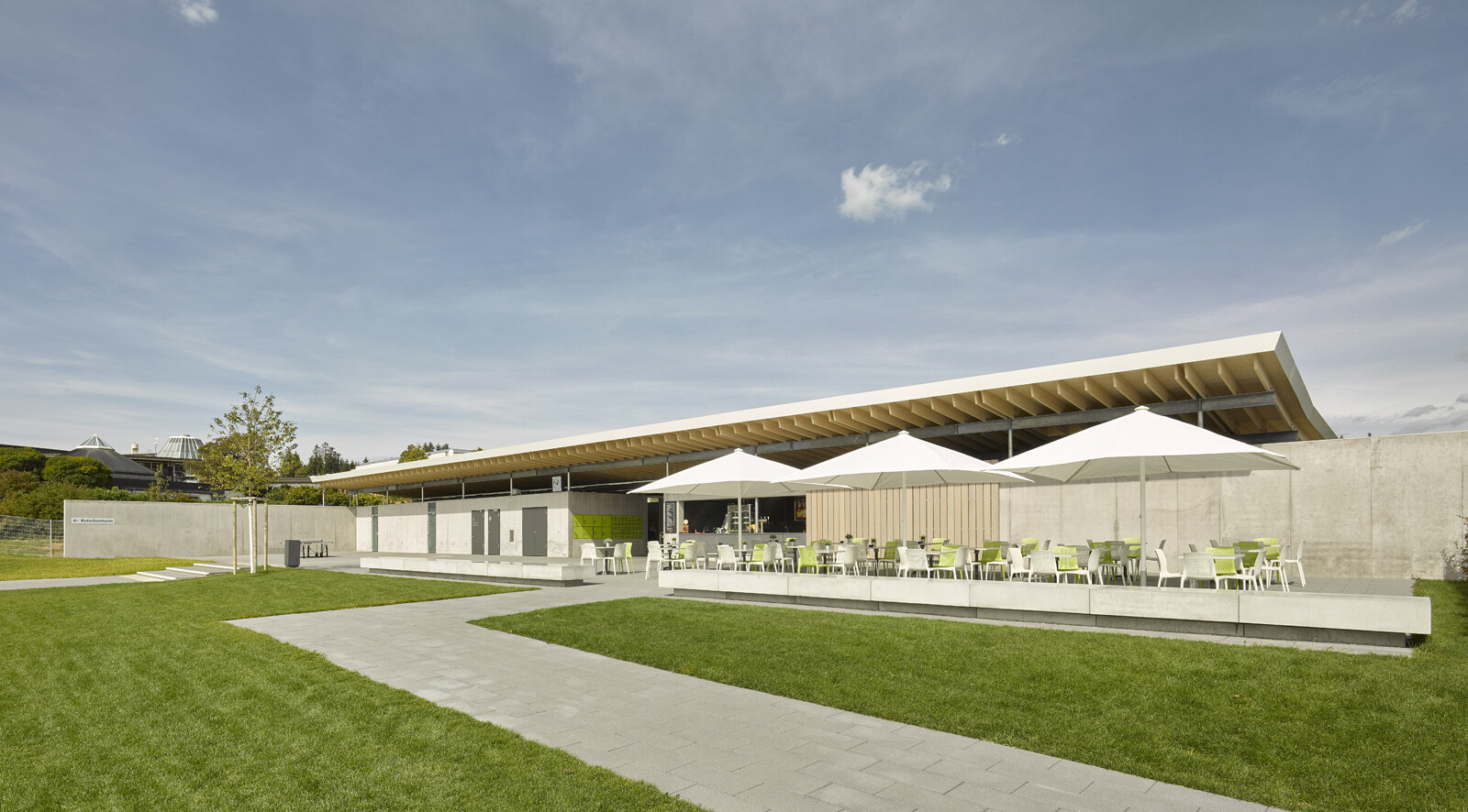 Following the redevelopment of the adventure area and the construction of a new slide tower, the range of bathing facilities at Freudenstadt Panoramic Baths has been extended with an outdoor pool. Visitors can swim 50-metre lengths here in a combined swimmers’ and non-swimmers’ pool and enjoy wonderful views of the Black Forest. A separate children’s paddling pool, a playground and a beach volleyball court along with dining facilities add to the leisure activities on offer. The new operations building with its suspended roof contains the changing rooms, sanitary facilities and the outdoor pool area with a pay-desk area on the ground floor. The swimming pool technology is located in the basement.