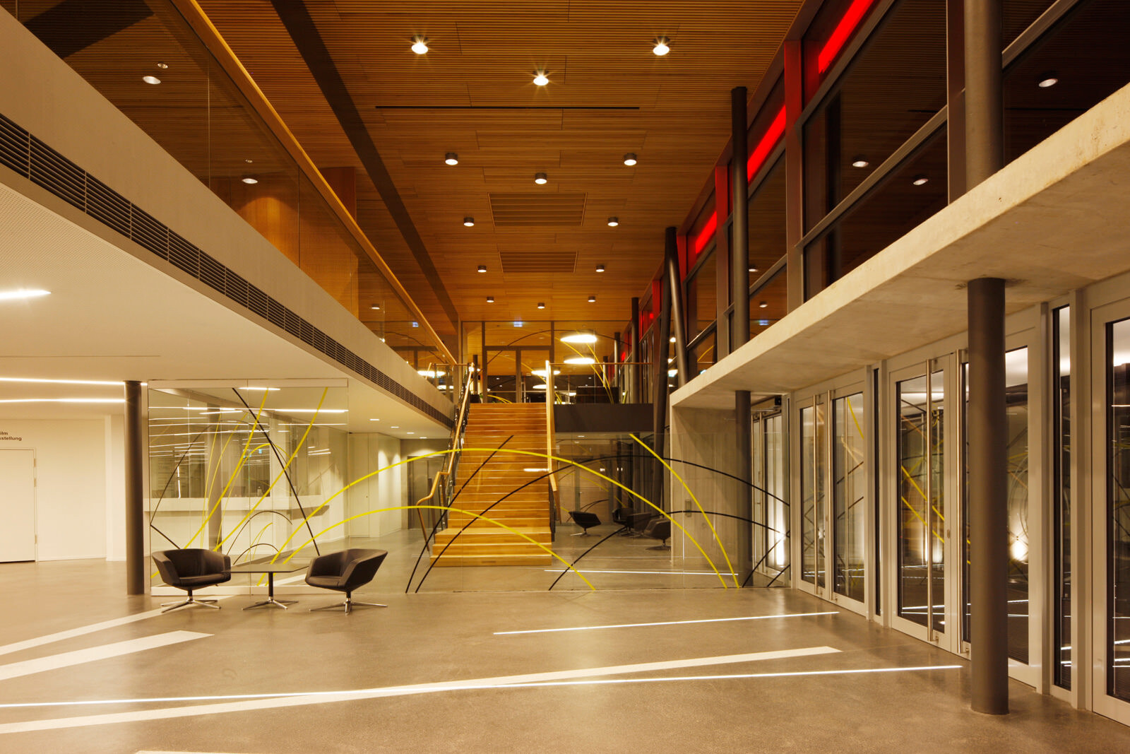 The aim of the redevelopment was to adapt the Civic Hall to today’s functional requirements regarding public buildings and to upgrade its architecture. The central components of the redevelopment were the foyer, the Small Hall, the restaurant and the conference rooms, while the Large Hall required no refurbishment. A great challenge lay in combining the old with the new in such a way as to create a unity of design – parts of the new functional areas are interlocking with the existing fabric of the building, so giving rise to fluid transitions. The exterior of the Civic Hall was given a completely new appearance: The two-storey glass façade of the entrance hall with its striking folded shape delineates an expressive edge to the building and indicates transparency and openness towards the town. This redevelopment meets the latest technical and energy standards: despite being significantly extended in terms of area, it excels in lower energy consumption.