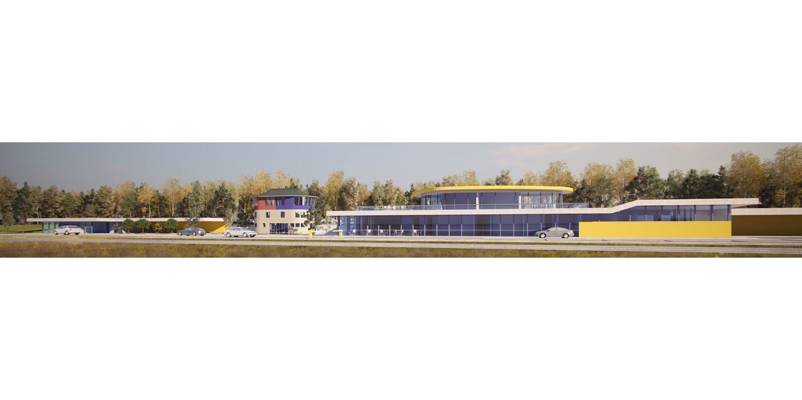 The aim of redesigning the ADAC traffic training facility on the Solitude-Ring was to optimise the running of road safety training and to improve the facility’s entire infrastructure. In order to achieve this, the development must be reorganised and more buildings for offices, administration and a workshop have to be planned for the site. The historic start and finish tower continues to be the centre of the facility. In order to expose the tower as a visible mark, the trees to the south of the Mahdentalstrasse will be replaced with a lower gabion wall. In future, all buildings will open out to the south towards the facility. The new gateman’s office with pay machine, exit barrier and parking spaces along with the training and events building with workshop will be embedded into the landscape, holding back significantly towards the regional main road. Together with the centrally positioned tower, they form an attractive ensemble of buildings. In front of the tower there will be a forecourt with a spacious terrace connecting all the buildings together.