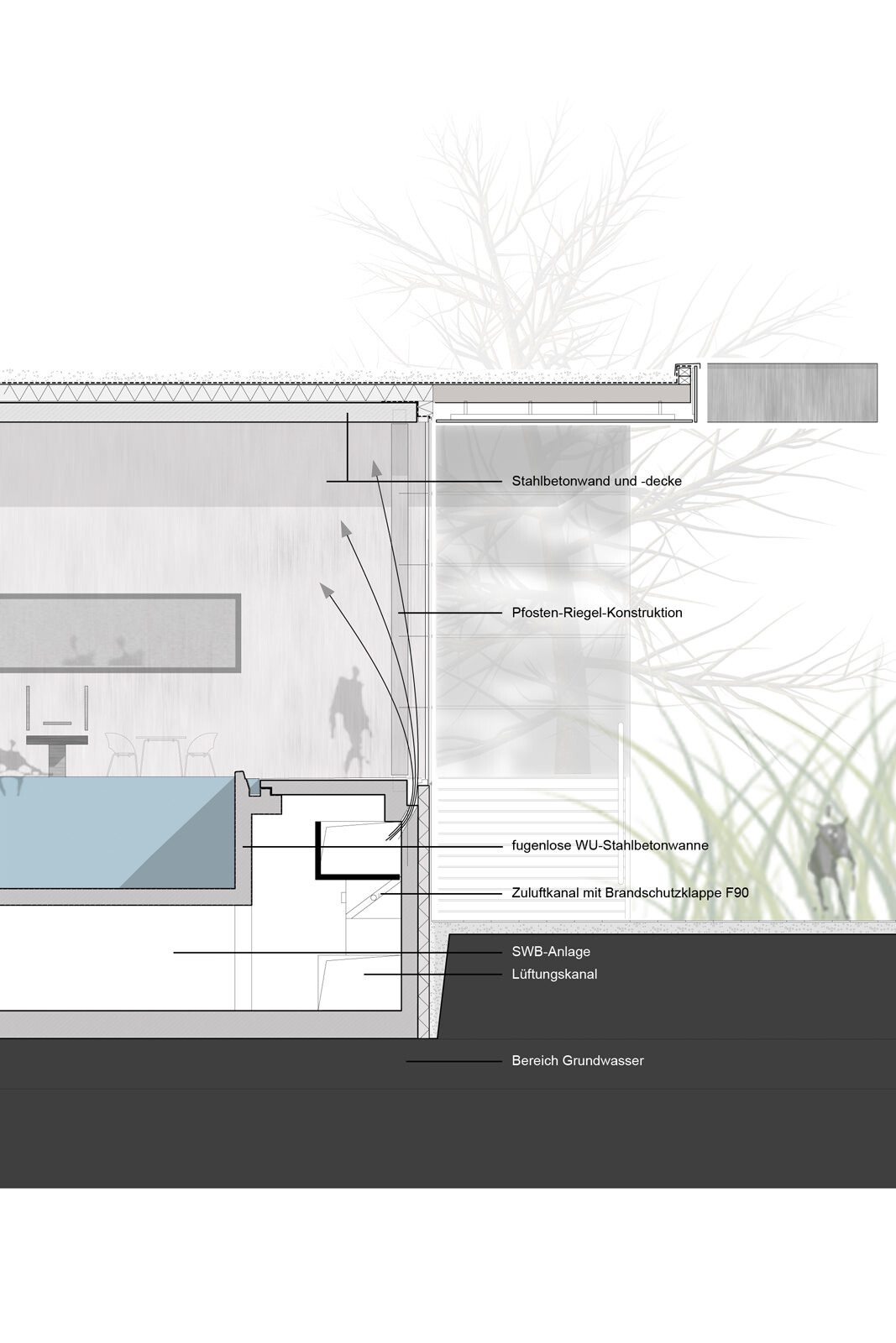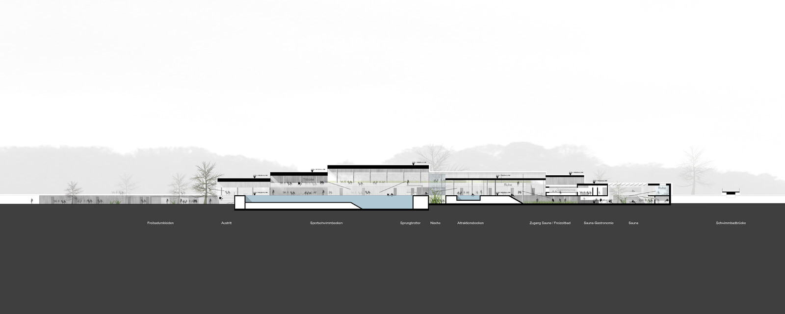 The new sports and leisure baths contain a competition-level sports pool, a learners' and a non-swimmers' pool, a landscaped bathing area for families with a recreational and a children's pool, a children's playground, catering and a sauna landscape. Thanks to the location of the plot in the beautiful surroundings of the water-meadow landscape along the River Fulda, the design connects the new building and its associated outdoor facilities with the water meadows and the river. In the area where a retaining wall once stood, a new "wall" has been built from which the roofs, the geometry of the ground plan and the outdoor facilities develop towards the river and gradually dissolve. Elements of the river and landscape are likewise drawn as far as possible into the building, allowing the interior and the exterior to merge into one another. Leading away from the generously proportioned entrance area, which also offers a wide view across the bathing landscape as far as the Fulda, are the routes to the bathing, sauna and spectators' area.