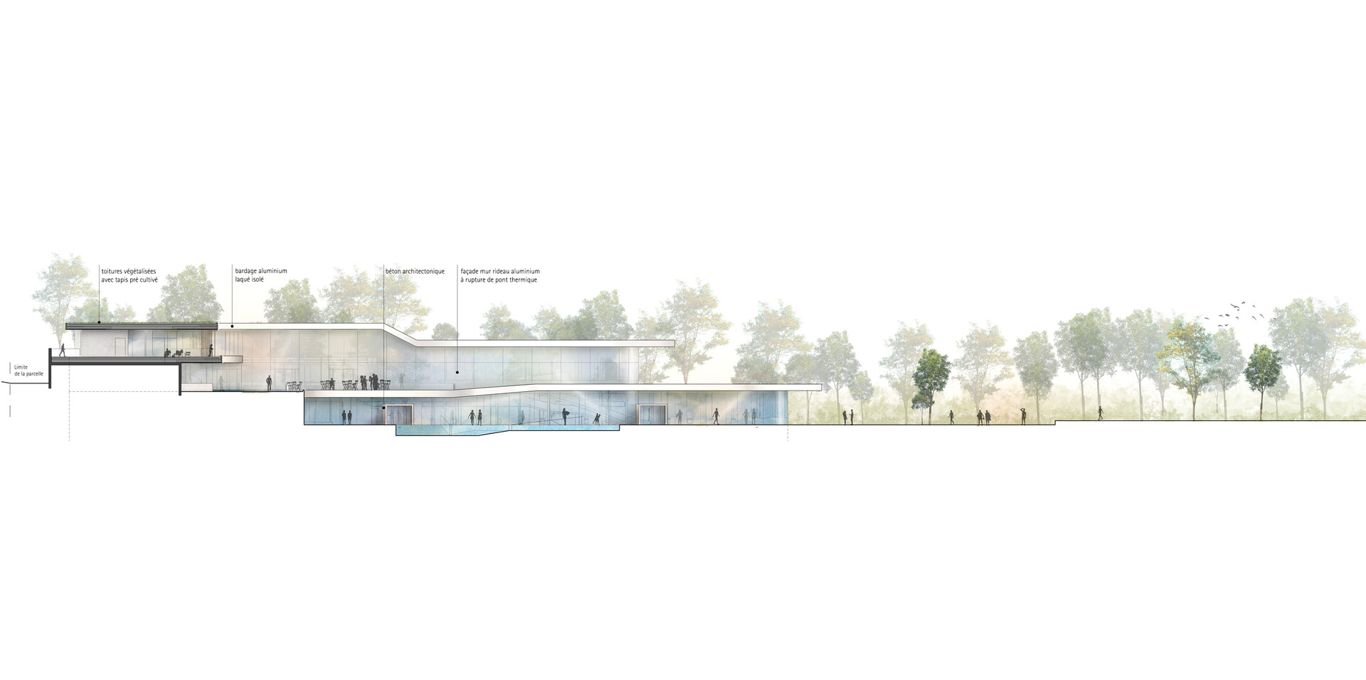 Carefully embedding the building into the landscape of the Parc de Sceaux was a key design element of the La Grenouillère swimming pool complex in the French commune of Antony. The aquatic centre covers an area of around 9,600 m², running in a sickle shape to the west of the extensive grounds along the plot boundary. This gives rise to a protective back towards the adjacent avenue Sully-Prudhomme. The remaining area remains structurally untouched and can be arranged as an attractive outdoor area for visitors.