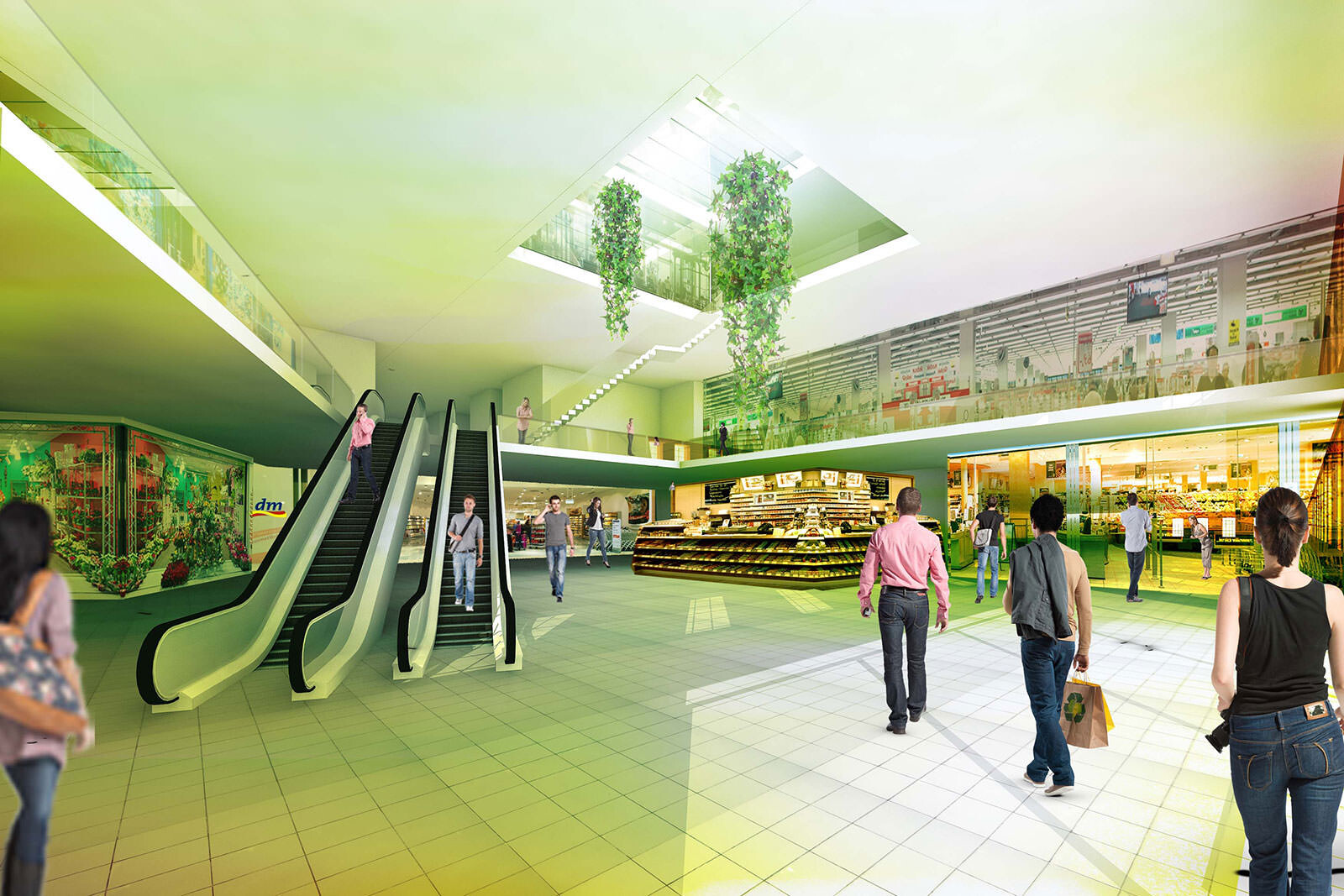 The Russian town of Ozery, once shaped by the textile industry, is situated 120 kilometres south of Moscow in a picturesque region on the banks of the river Oka. The centrally located industrial area is currently being restructured and embellished. Several of the various buildings, some of which have a very appealing brick architecture, have already been redeveloped and are now in use by small industrial firms. An very attractive red-brick building on the southwest corner of the area, located on the access road to Ozery, is to be converted into a shopping centre. Along with small and medium-sized businesses, the spatial programme also incorporates a large specialist market, a food market, a fast-food restaurant and two movie theatres. The proposal requires that the long brick façade of the building be preserved in order to lend character and charm to the building. The core of the actual building behind will either be extensively removed or will be replaced with new components as it is in part in a very poor structural state of repair. This will make it unnecessary for elaborate redevelopment measures to be carried out on the existing concrete structure, and there are also no functional restrictions brought about by the already close positioning of the pillars or by the thickness of the brick walls. A further advantage lies in the fact that the new sections of the building allow the interior brick façade to be disengaged from, enabling the old façade to be experienced also from the inside via galleries and air spaces. As a statement within the urban context and to emphasise the entrance situation, located in the middle of the long brick façade is a gold-coloured structure on the roof, which projects slightly over the existing building. This structure accommodates a restaurant that appears like a visual magnet, enhancing the appeal of the entire shopping centre. In the summer, a spacious terrace invites visitors to spend time and enjoy the panoramic views of the river and the surrounding countryside.