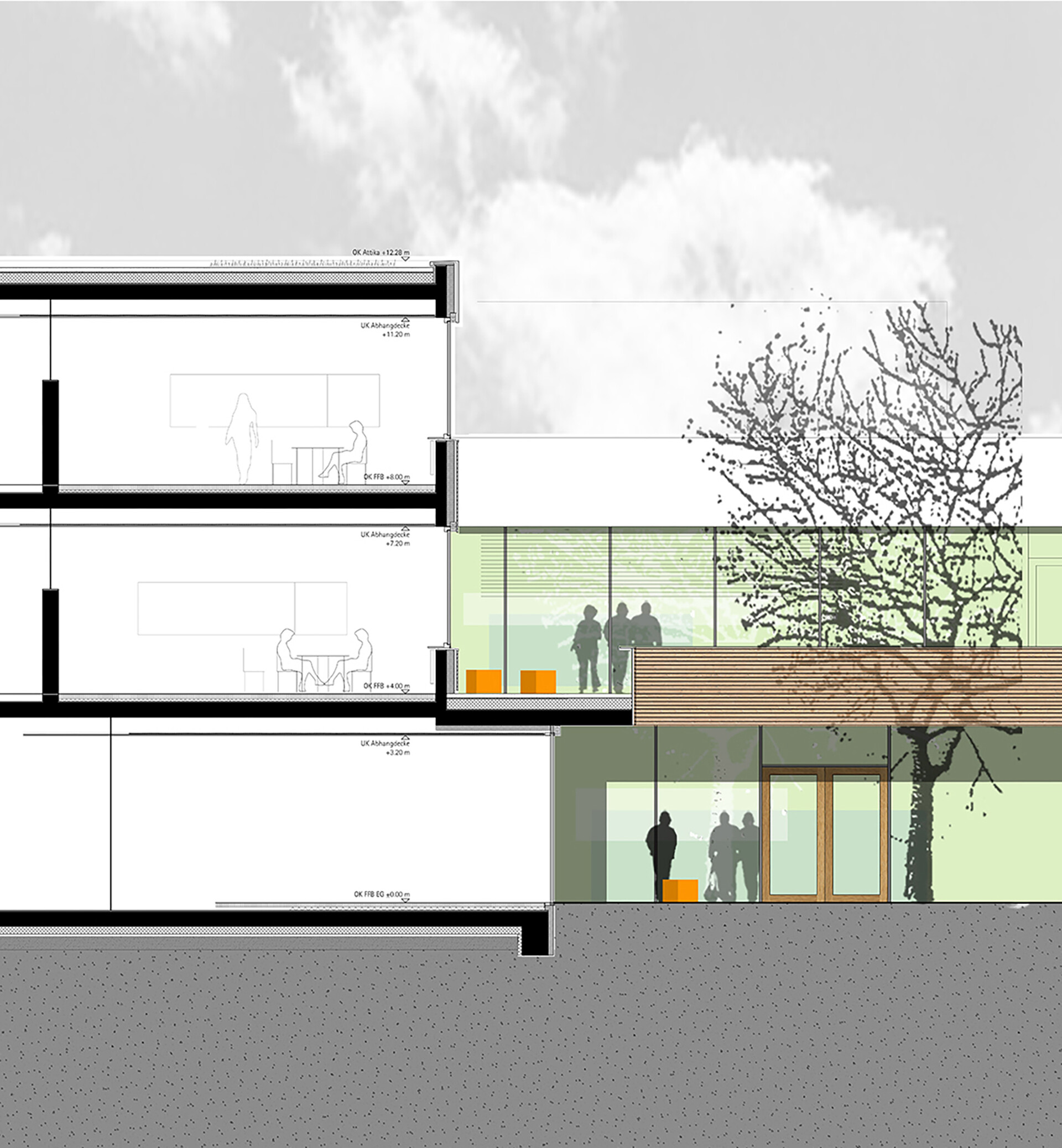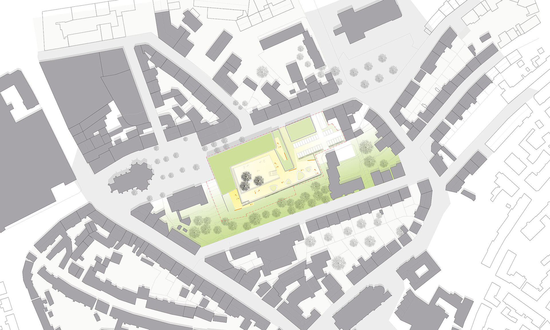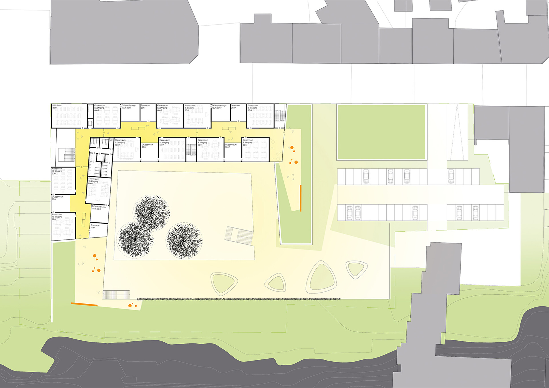 Durch die Haupterschließung von Westen über den Marktplatz entsteht eine offene und starke Adresse in Richtung des öffentlichen Lebens. Die Einbettung in die topographischen Gegebenheiten und städtebaulichen Strukturen erfolgt durch einen kompakten Baukörper, der aus einem Sockelgeschoss mit Innenhof und darüber liegenden U-förmigen Volumen besteht. Der dreigeschossige Gebäudeteil positioniert sich mit klarer räumlicher Kante in Richtung Marktplatz und entlang der Lutherstraße und nimmt die Höhen der benachbarten Gebäude auf. Der zweigeschossige, U-förmige Baukörper öffnet sich nach Süden und Osten in Richtung Hang und springt geschossweise zurück. Daraus ergeben sich begehbare Dachflächen, die als terrassierte Freiflächen genutzt werden. Durch die Verbindung der verschiedenen Ebenen mit Treppenanlagen entstehen, ausgehend vom Innenhof im Erdgeschoss, miteinander verbundene Pausenflächen für Schüler sowie eine direkte Verbindung zwischen Schulgebäude und PKW-Stellplätzen. Über den zum Marktplatz hin ausgerichteten Haupteingang gelangen Schüler, Lehrer und Besucher unmittelbar in die Aula, die als Knotenpunkt dient und Ausblicke auf die Freiflächen sowie den Verwaltungs- und Fachklassenbereich bietet. Die vertikale, zentrale Haupterschließung erfolgt über eine offene Treppenanlage in einem dreigeschossigen Luftraum. Ein Aufzug erschließt die Geschosse barrierefrei. Nutzungen und Verkehrs- bzw. Aufenthaltsflächen formen den zentralen Innenhof, in dem wertvoller Baumbestand erhalten bleibt.