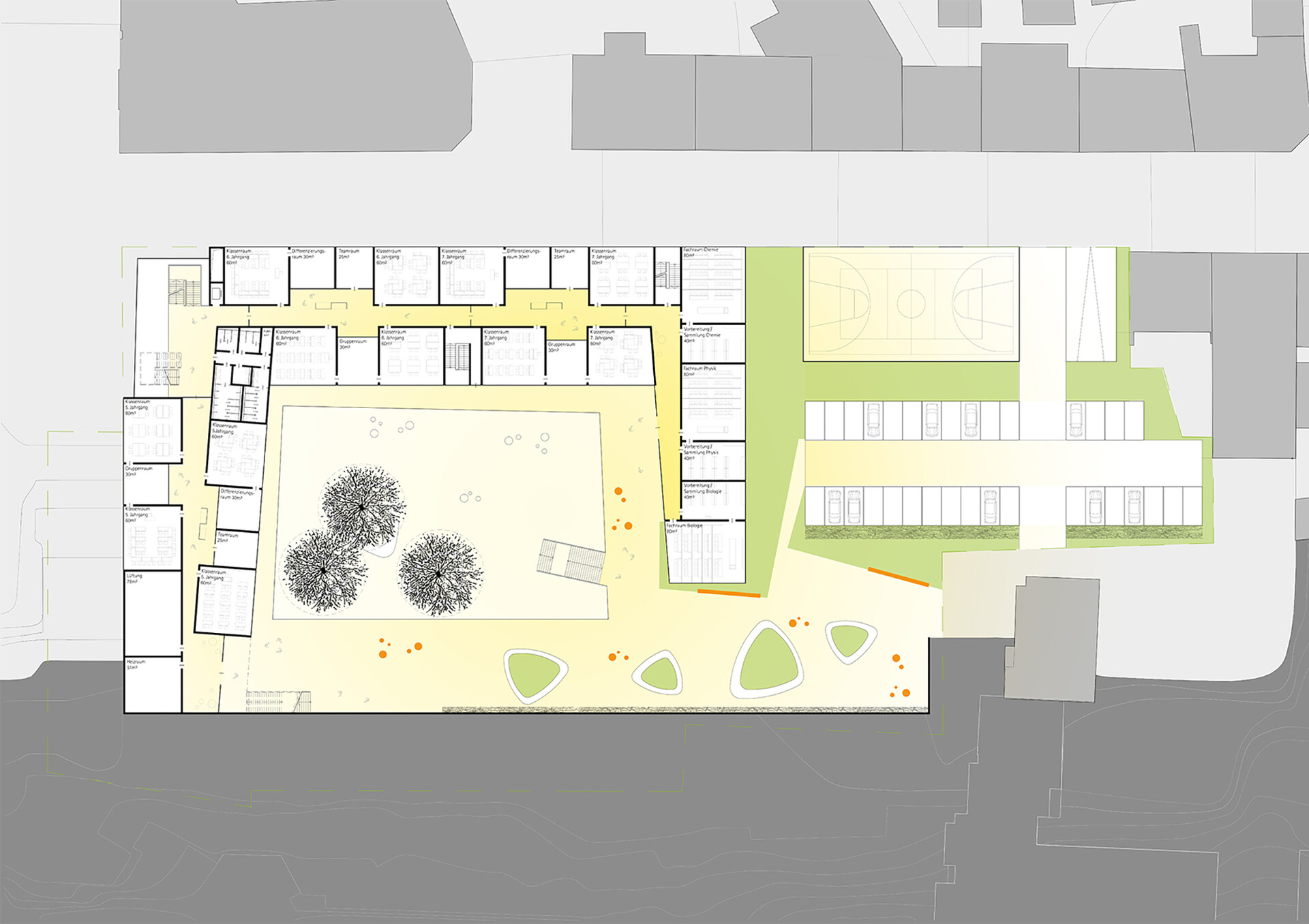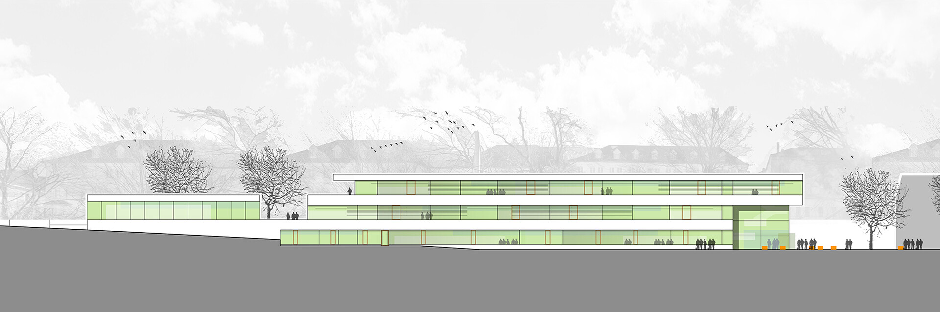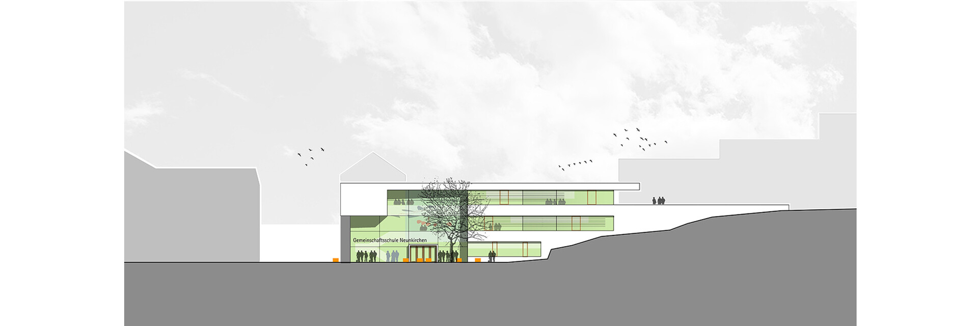 Der Wettbewerbsentwurf sieht einen Neubau vor. Ziel ist es, ein Gebäude zu schaffen, das sich nach außen hin öffnet und in den städtebaulichen Kontext einfügt sowie im Grundriss die räumlichen Anforderungen für die Umsetzung einer zeitgemäßen Schulpädagogik erfüllt. Dabei soll es Teil einer neuen Mitte sein, die mit der Umgebung kommuniziert und Ein- und Ausblicke erlaubt. Eine offene Erschließung des Komplexes über alle Ebenen und Funktionsbereiche hinweg steht für ein transparentes und flexibles Miteinander.