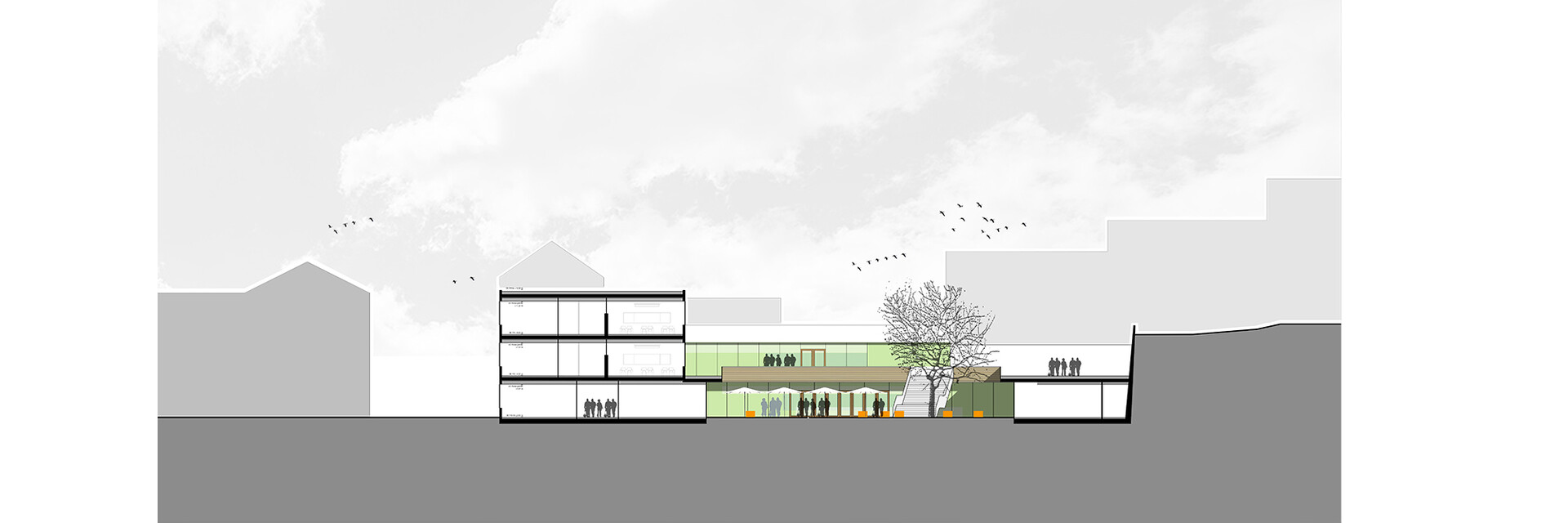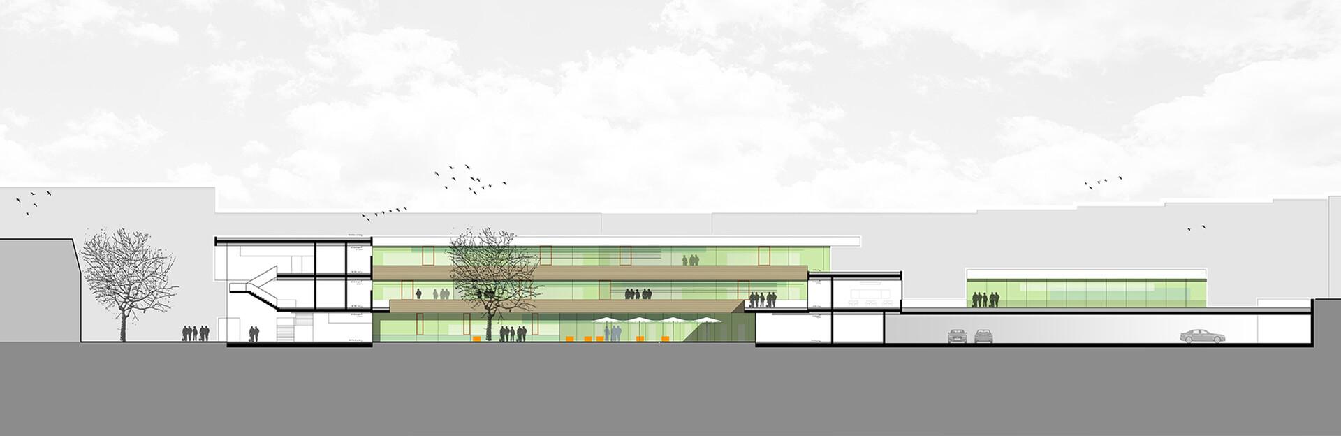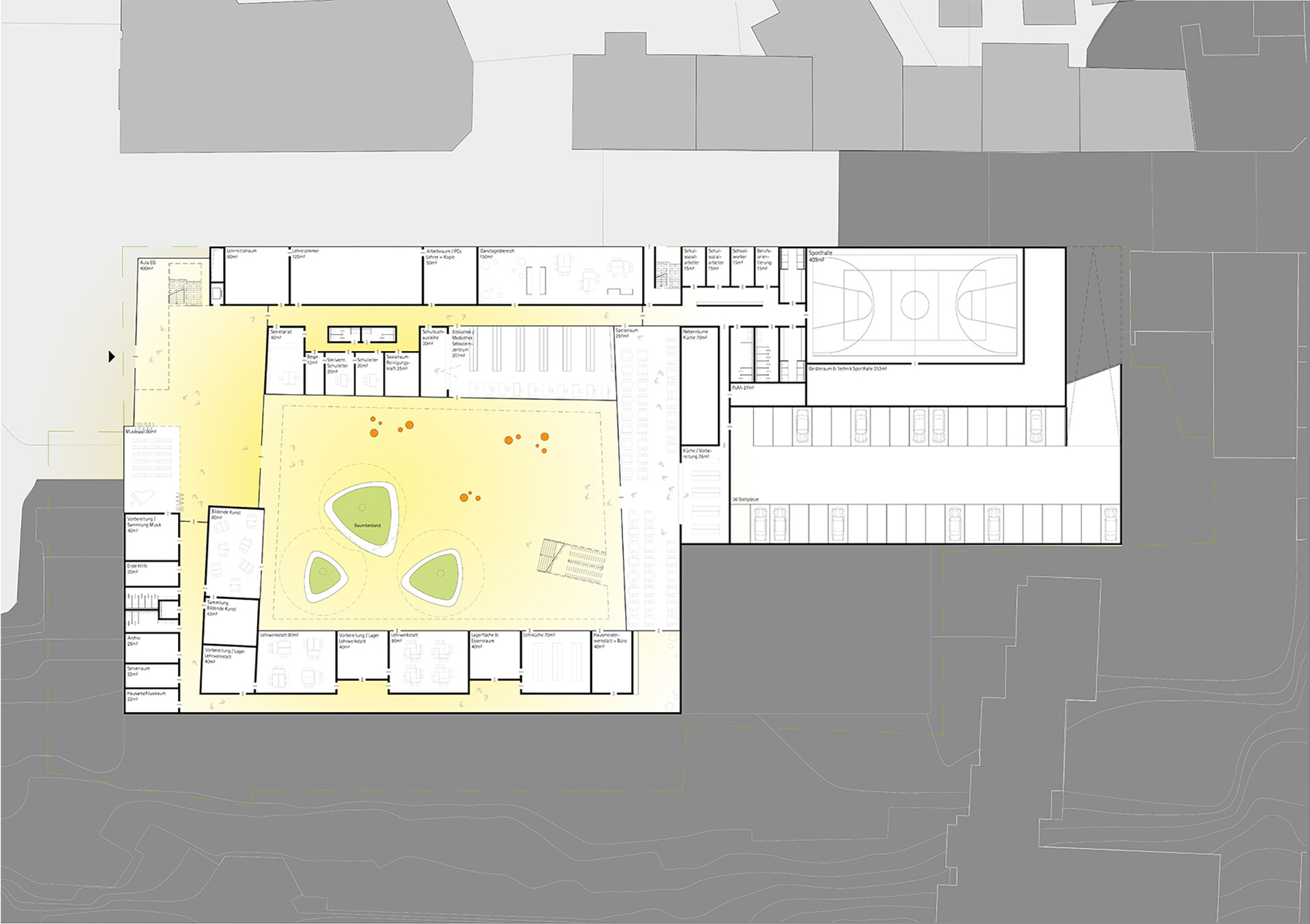 Der Wettbewerbsentwurf sieht einen Neubau vor. Ziel ist es, ein Gebäude zu schaffen, das sich nach außen hin öffnet und in den städtebaulichen Kontext einfügt sowie im Grundriss die räumlichen Anforderungen für die Umsetzung einer zeitgemäßen Schulpädagogik erfüllt. Dabei soll es Teil einer neuen Mitte sein, die mit der Umgebung kommuniziert und Ein- und Ausblicke erlaubt. Eine offene Erschließung des Komplexes über alle Ebenen und Funktionsbereiche hinweg steht für ein transparentes und flexibles Miteinander.