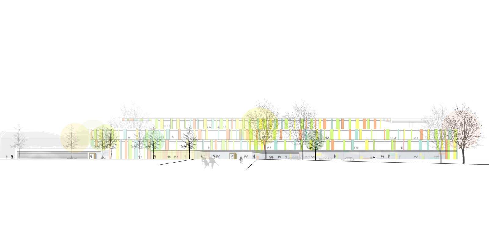 The site of the project is a part of the International School Campus. The terrain elevates from south to the north. The form of the building evolves out of the conditions of the site and the organization of the school program. The site is maximized by placing the building parallel to the southern site boundary. This arrangement provides a sound barrier from the busy street to the south and creates a large, protected exterior space to the north with a visual connection to the hillside and the Music Conservatory. The building conforms to the hillside and forms a natural transition to the landscape. The building is a unifying and balancing element with the existing school buildings and completes the street façade of the International School. On the internal side of the site, the building continues the existing courtyard structure of the existing school buildings. The building consists essentially of three wings which converge into a centrally located circulation area from where the different departments of the building are easily accessible. The main entrance plaza and the drop of area extend to the south from the central circulation area.