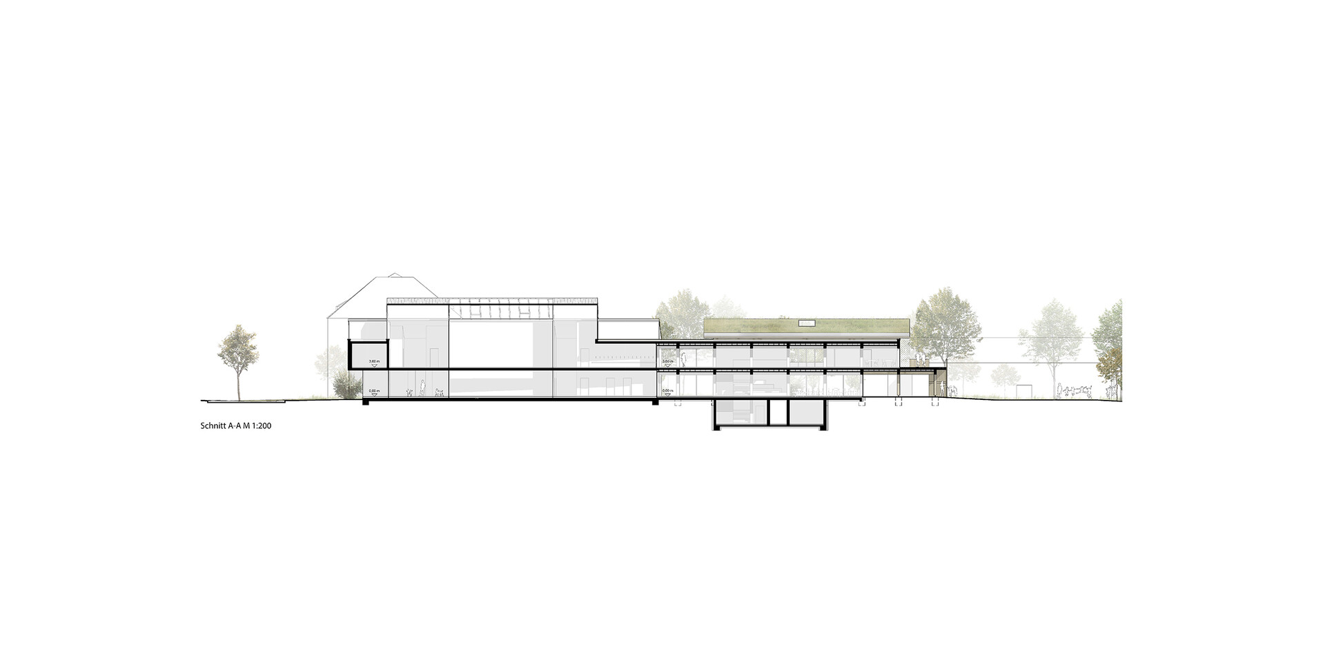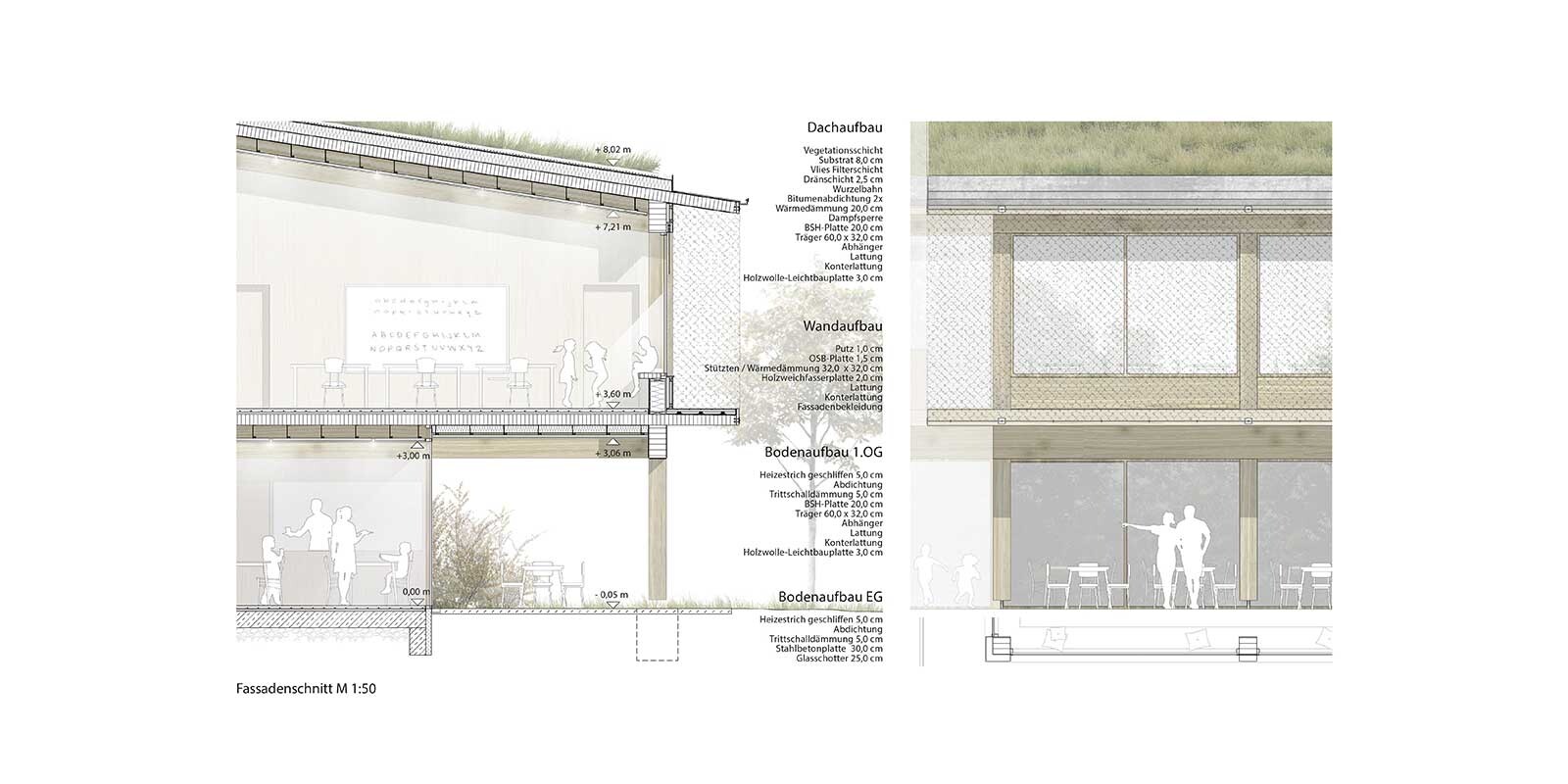 Overall, the design creates a versatile open school space that, in addition to specific activities, also allows pupils to play freely and appropriate the space. The newly created elements form a natural connection with the existing building and allow for spatial synergies. For example, the school gardens to the north of the green classroom allow environmental education aspects to be integrated into the school concept.