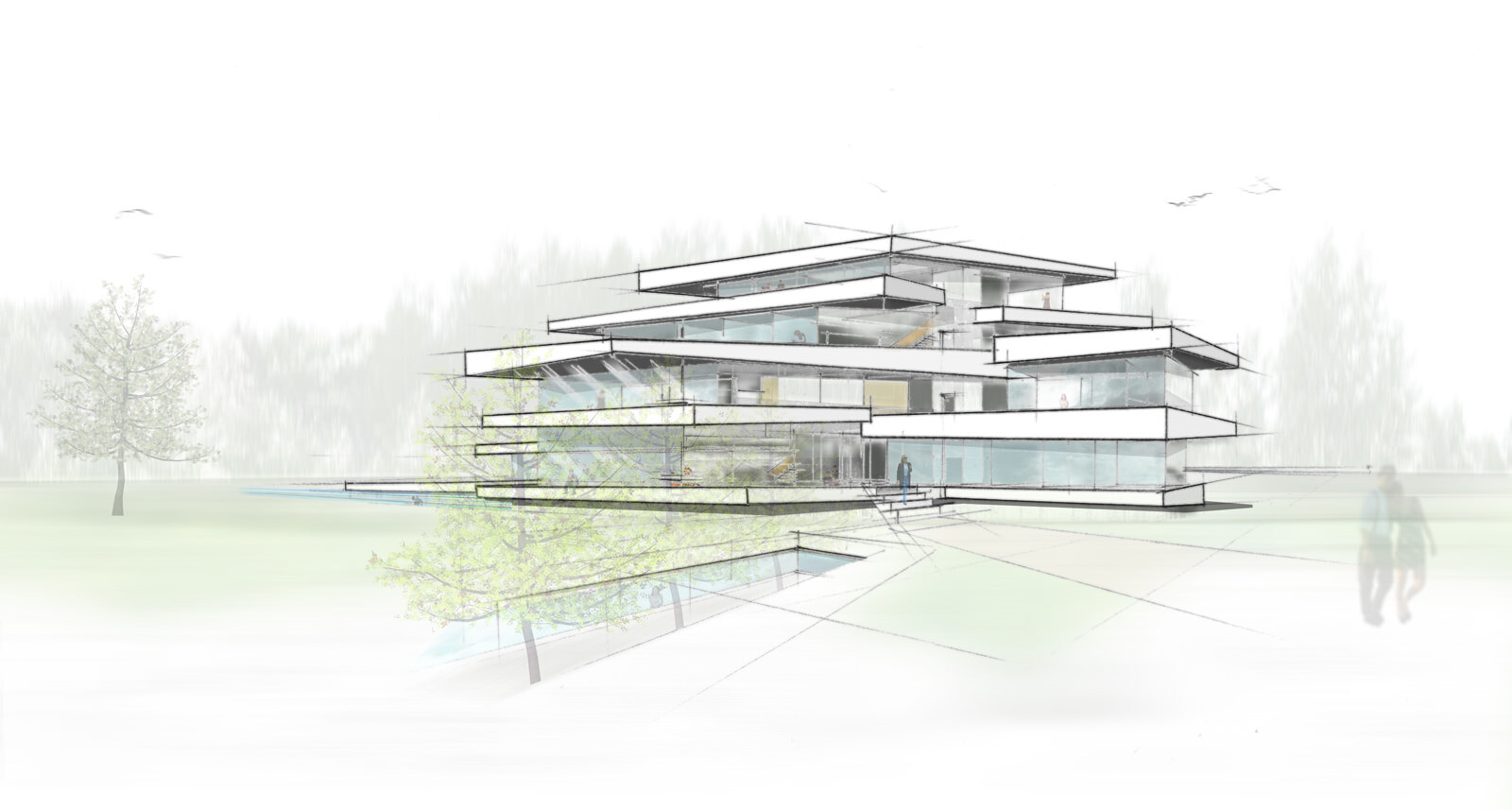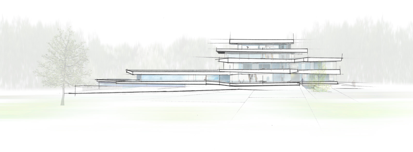 An exclusives country house is to be built in a quiet location just outside Moscow. The design concept for the multi-storey building relies on spacious, well-lit spaces. These are superimposed in expansive, horizontal levels. Large window surfaces enable interesting views in and out. Very different spatial situations present themselves for living, leisure and recreation both inside and outside the building. Three underground storeys accommodate a wellness and spa area along with rooms for bowling and a home cinema.