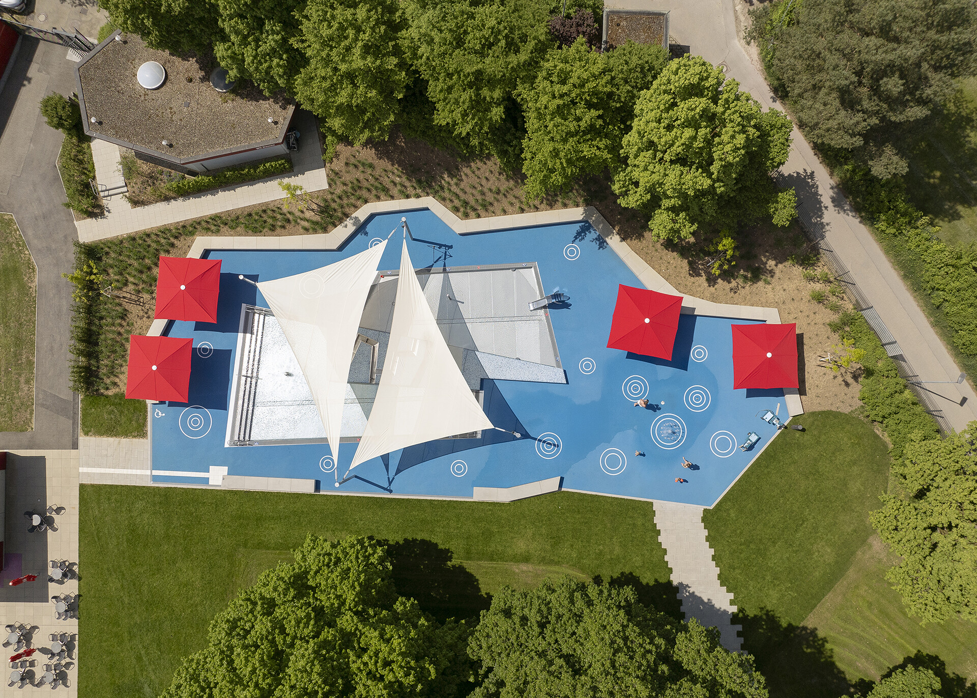 Pünktlich zum Start der Freibadsaison wird im Freibad Kirchheim unter Teck ein neuer Kinderbereich eröffnet. Die von 4a Architekten geplante Erweiterung schafft einen Erlebnisraum mit zwei flachen Becken, die unterschiedliche Wasserzonen und -tiefen bieten. Der von altem Baumbestand umgebene Bereich lädt zum Planschen, Spielen und Verweilen ein. Weit gespannte Sonnensegel schützen Becken und Aufenthaltsbereiche vor Sonne und Regen und sorgen für angenehme Bedingungen auch an heißen Tagen.