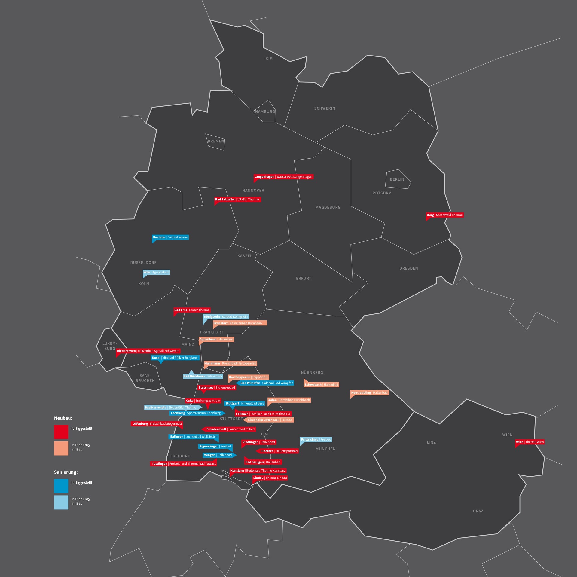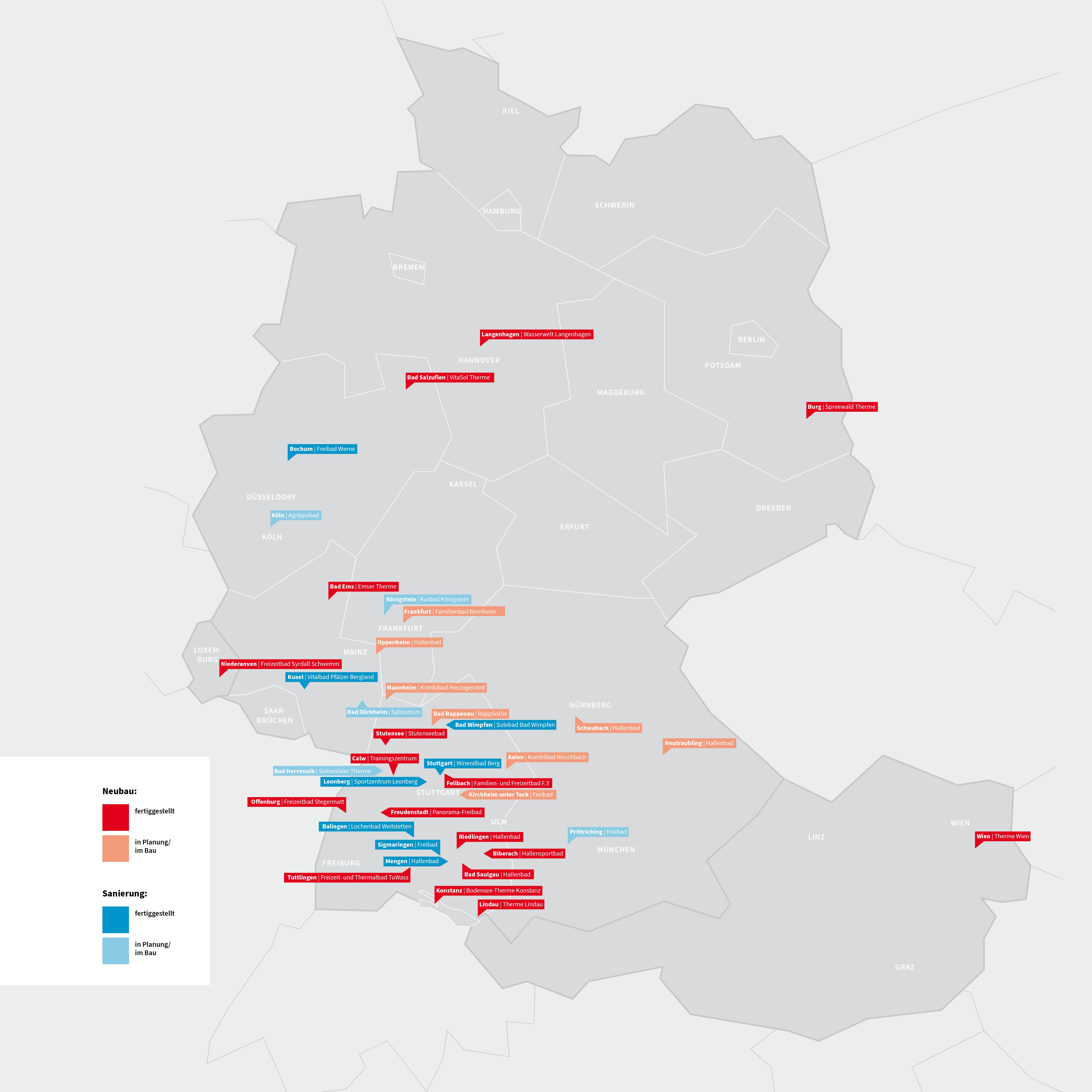 Bäderprojekte bis 2024 Übersichtskarte mit realisierten und laufenden Neubauprojekten und Sanierungen bis 2024.