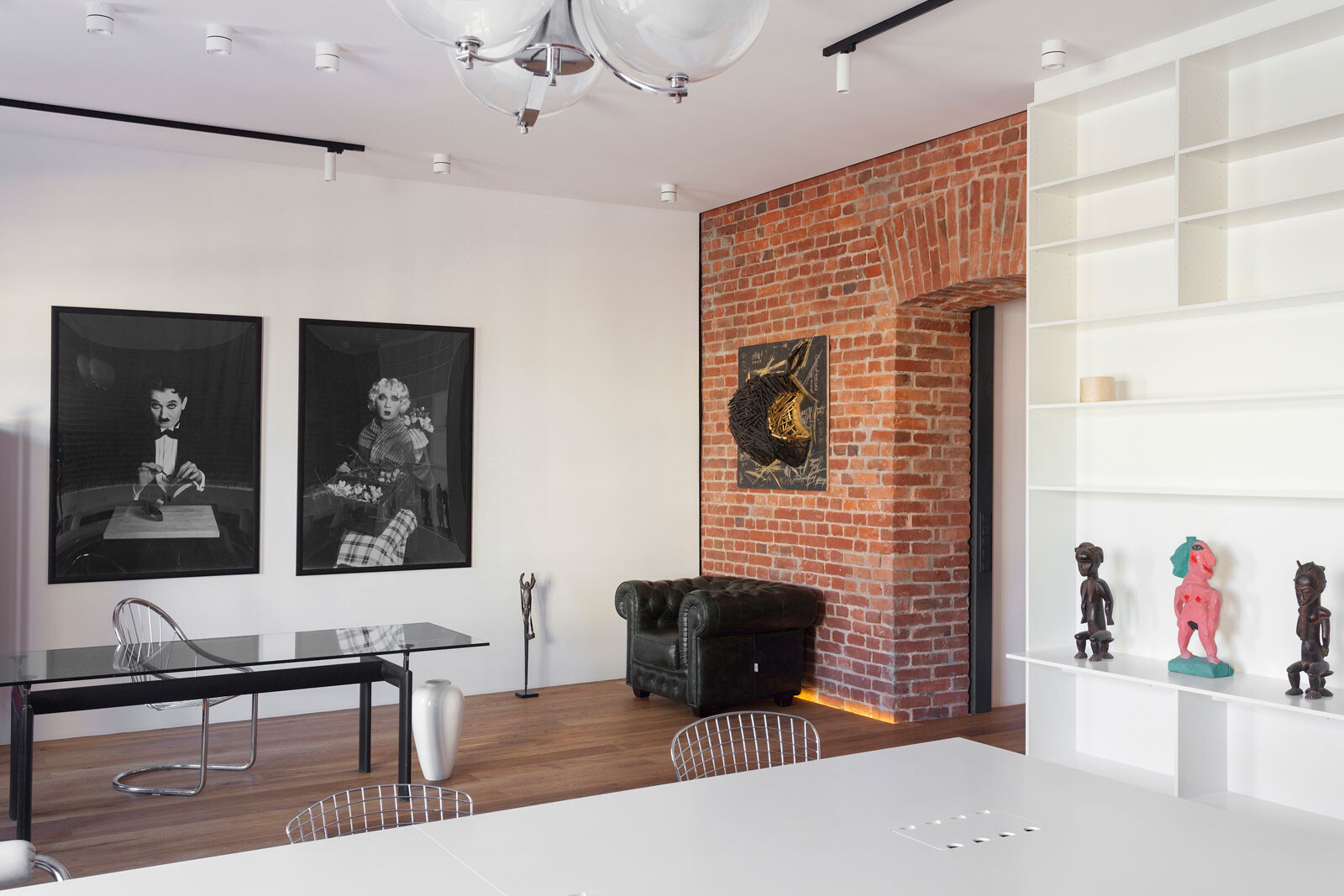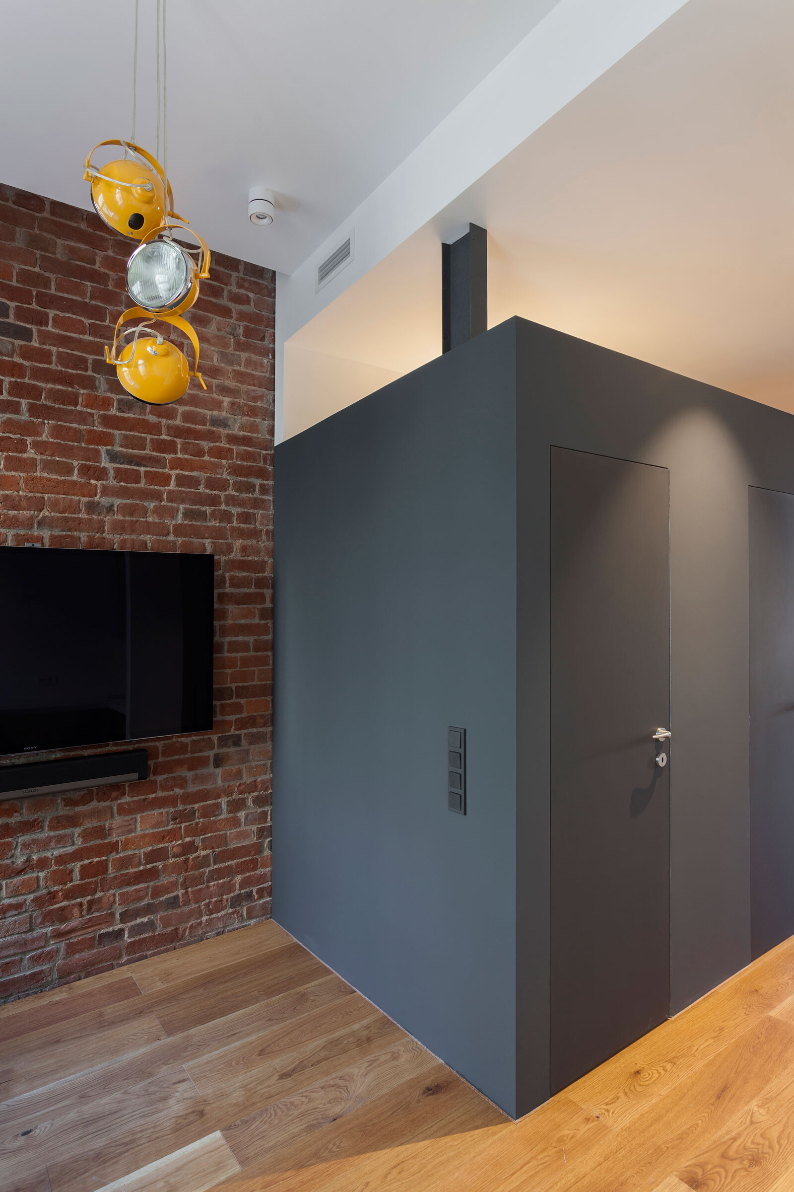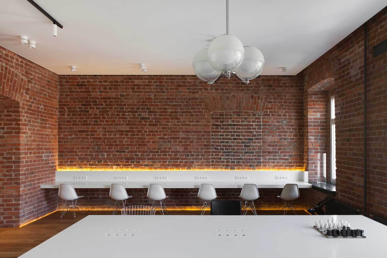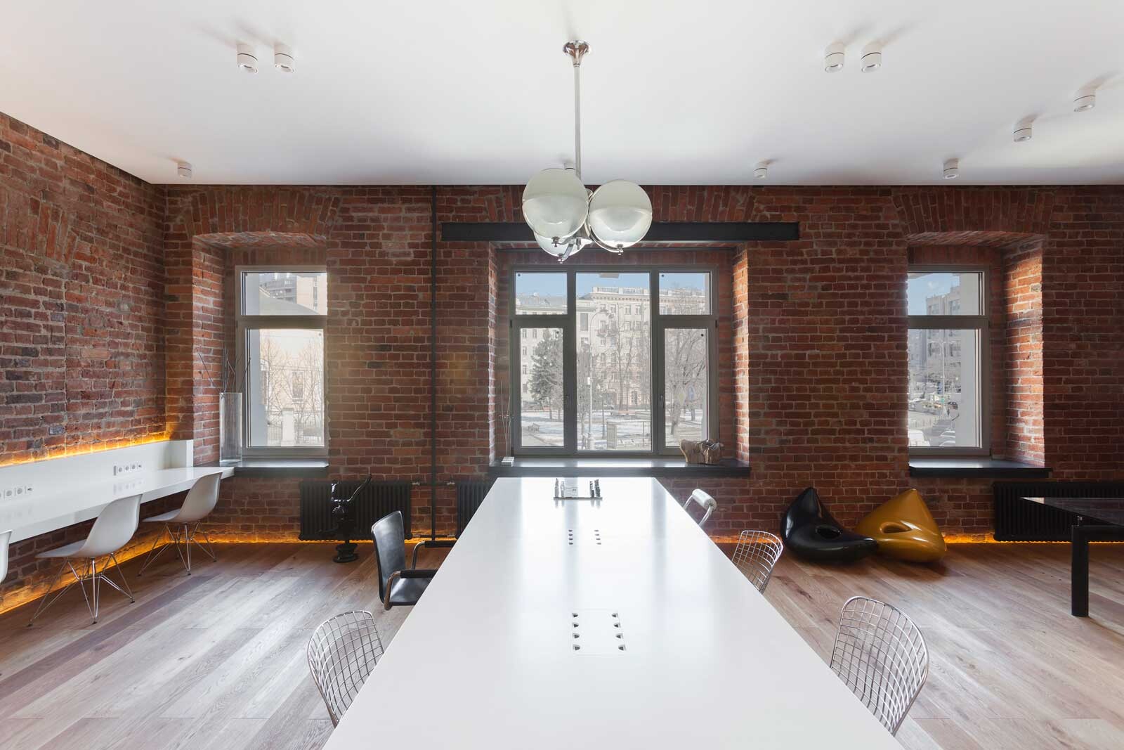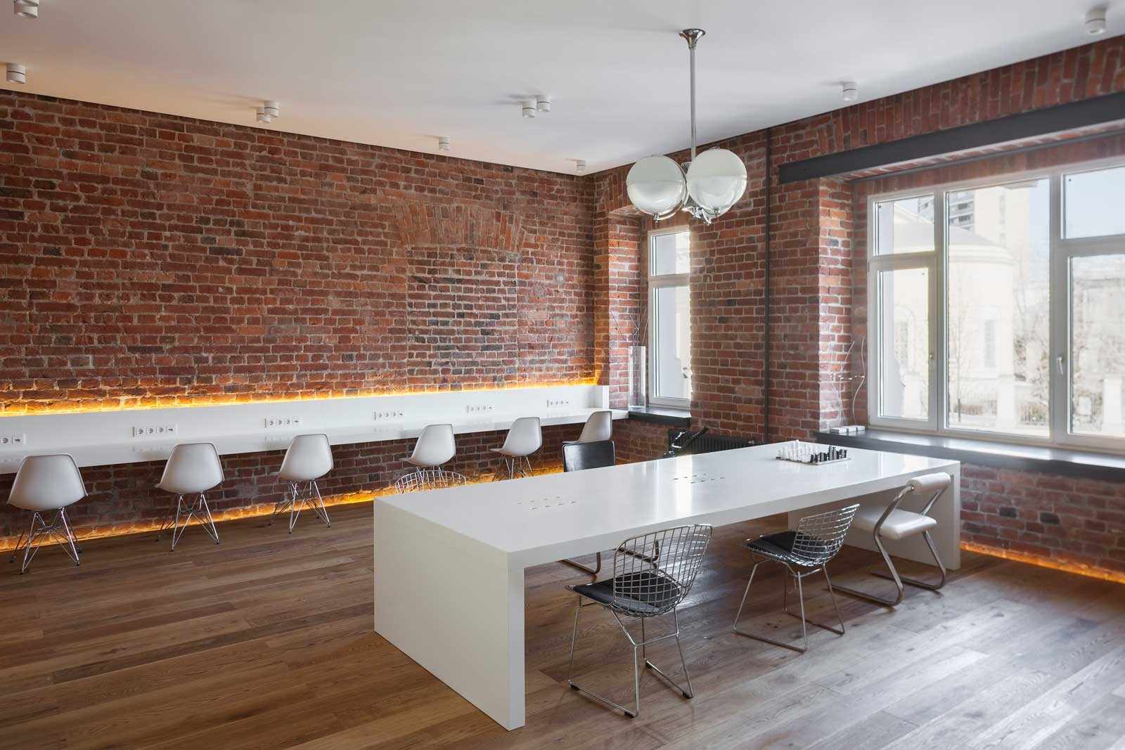 Die Büroetage befindet sich in einem denkmalgeschützten Wohn-und Geschäftshaus aus dem Jahr 1903 im Zentrum von Moskau. Im Zuge des Umbaus sollten die Räume für eine Eventagentur möglichst großzügig und repräsentativ umgestaltet werden. So wurde das Büro, das eine Grundfläche von 85 m² umfasst, als „Open Space“ mit 15 Arbeitsplätzen konzipiert. Ein offener Grundriss, fließende Übergänge und eine schlichte Farb- und Materialwahl verleihen den Räumen den Charakter eines Bürolofts. In Kombination mit den freigelegten Ziegelwänden entsteht ein ganz besonderes Ambiente. Um eine optimale Raumnutzung zu ermöglichen, wurde die Inneneinrichtung von 4a Architekten entworfen und auf die speziellen Anforderungen zugeschnitten. Darüber hinaus umfasste die Architektenleistung bei diesem Projekt die technische Ausstattung der Büroräume bis hin zur Auswahl der Kunstgegenstände. Diese stammen aus der Privatsammlung des Bauherrn und wurden in Absprache mit 4a Architekten ausgewählt.