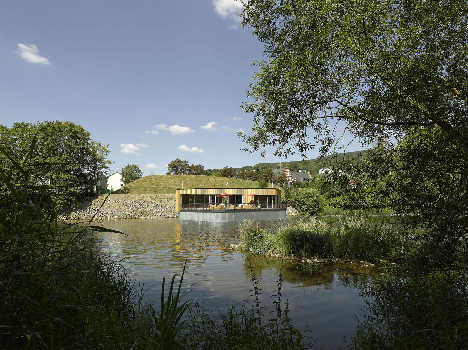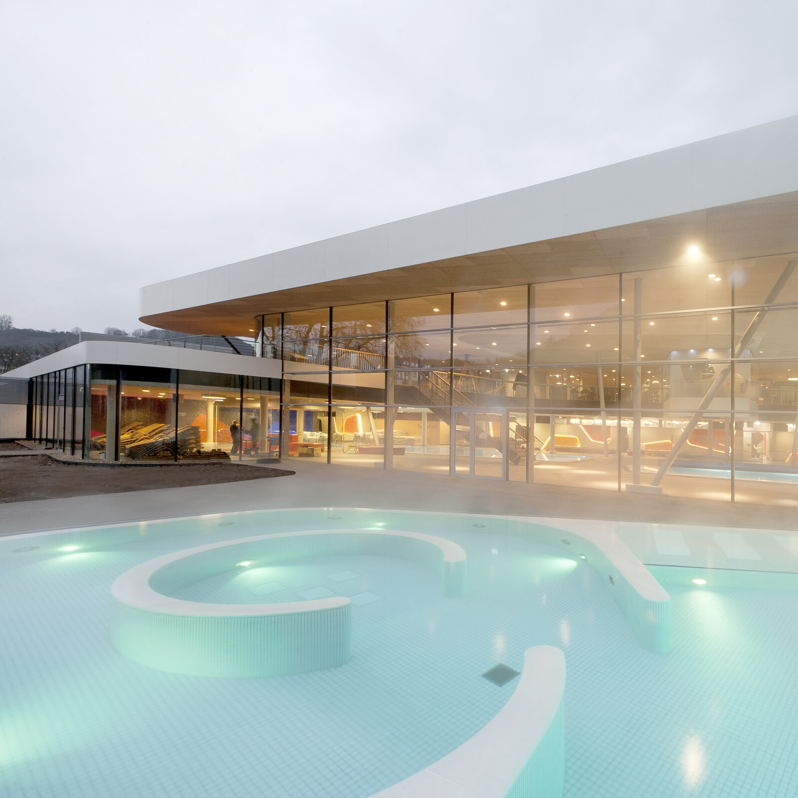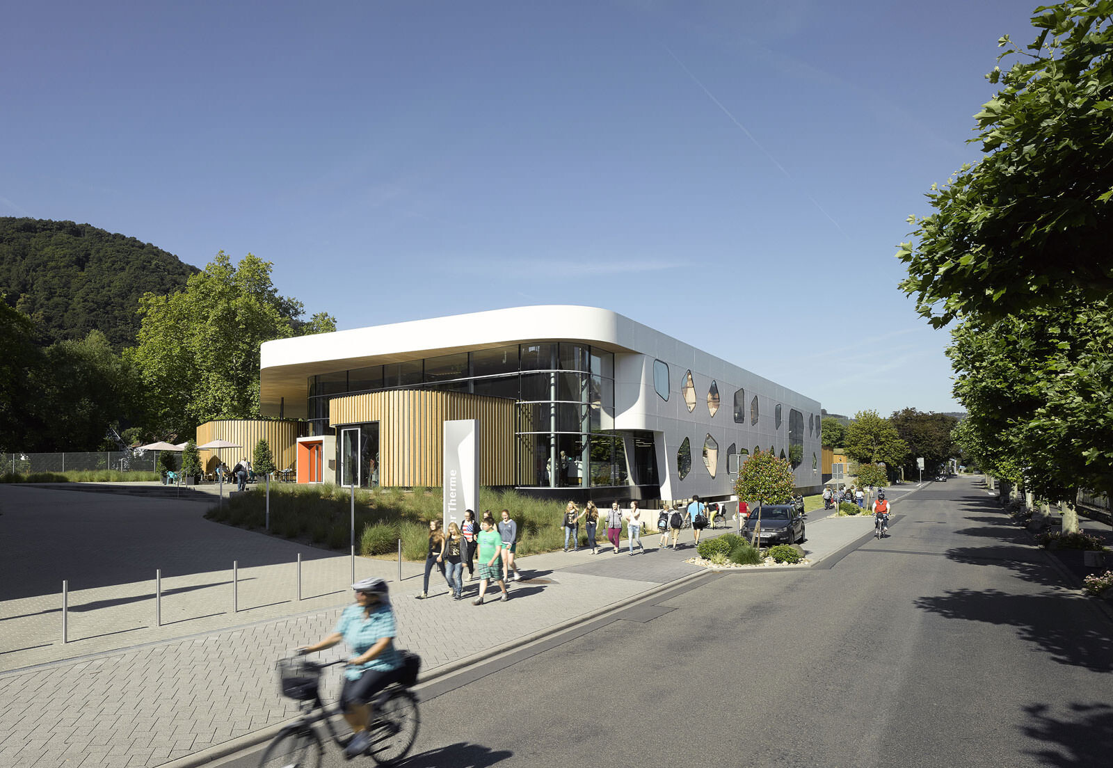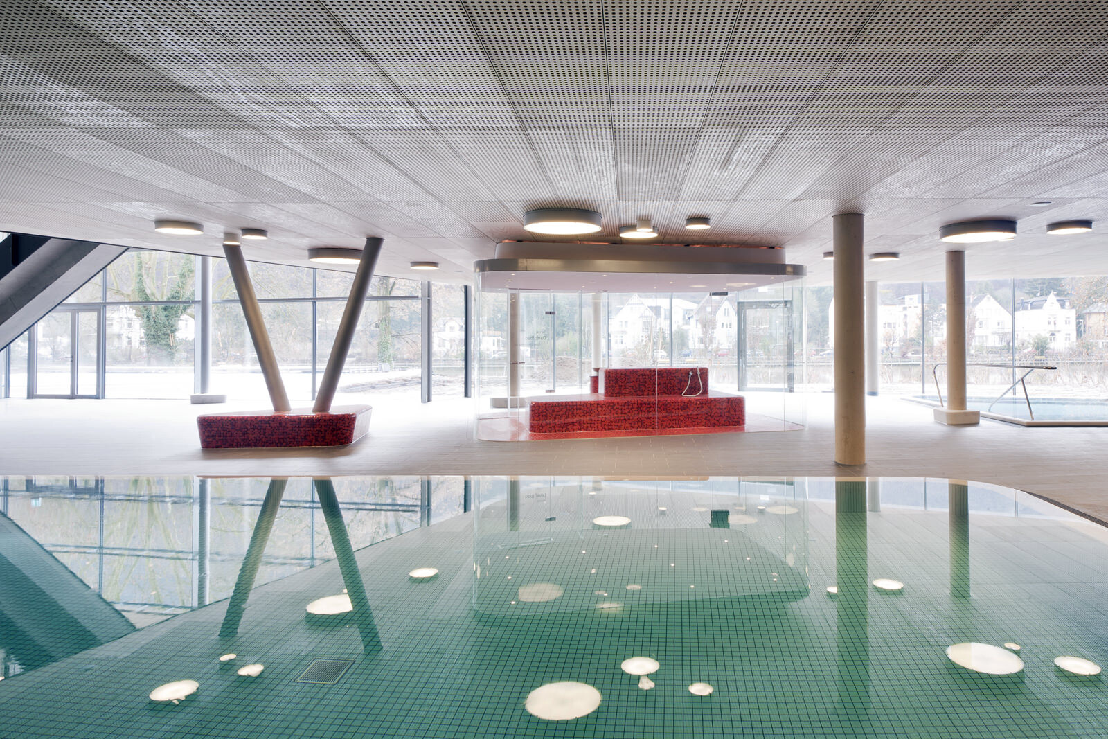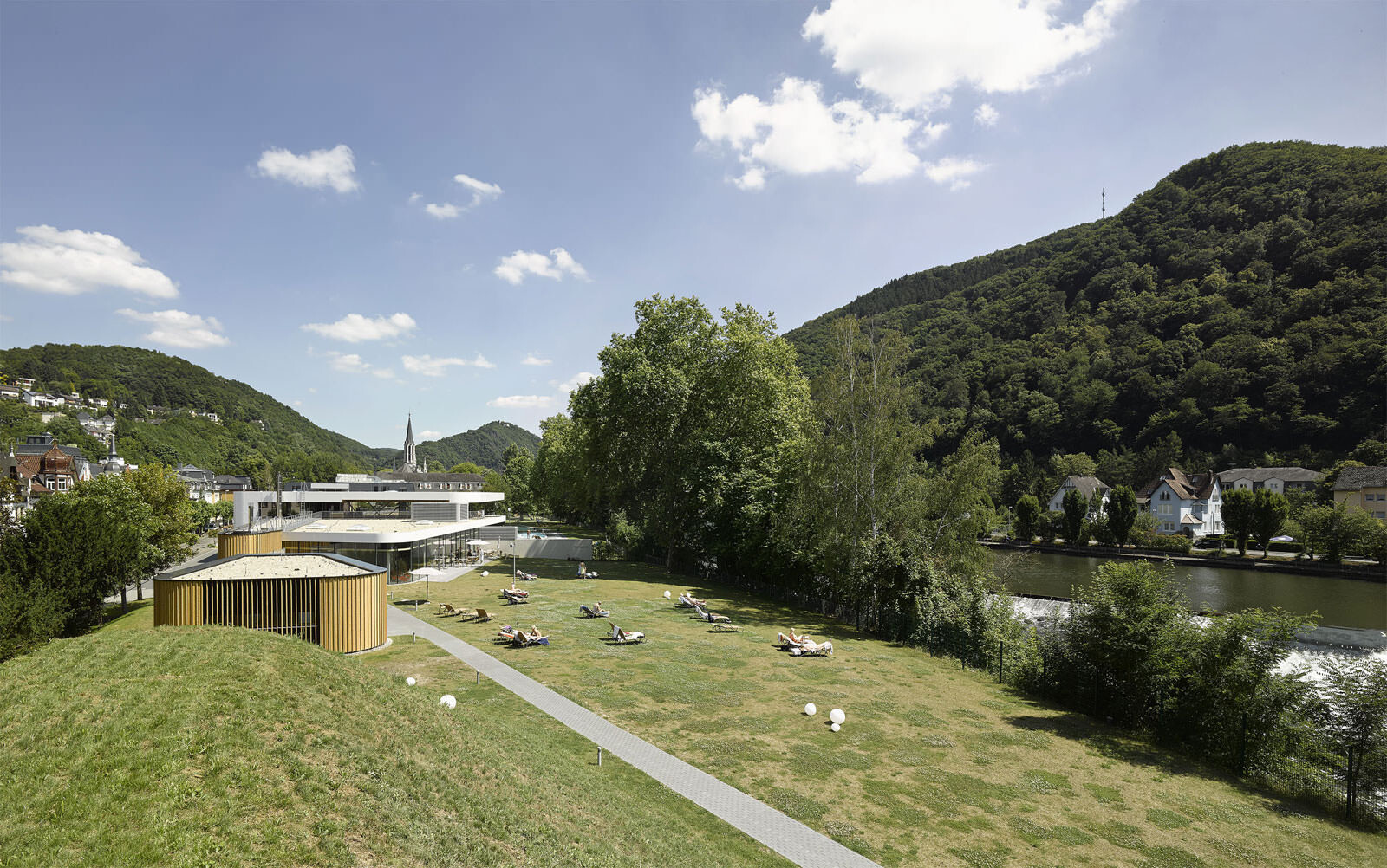 Ein wiederkehrendes Thema bei der Gestaltung der Therme ist der Flusskiesel, wie er auch am Ufer der Lahn vorzufinden ist. Dieser zeigt sich in der Formgebung der einzelnen Baukörper, der Schwimmbecken sowie bei den Fassadenöffnungen und auch bei der Wandgestaltung im Innenraum. Darüber hinaus greift die Therme auch in ihrer Materialität die Charakteristik von Kieselsteinen auf. Die einzelnen Baukörper formen mit ihrem Volumen unterschiedliche Steine, die ähnlich wie Kieselsteine am Flussufer geschichtet sind und sich einander überlagern. Im Zentrum befindet sich die Badehalle – weiträumig und großzügig gestaltet bildet sie das größte Element. Der Saunatrakt schließt nach Westen an. Mit markanter Kieselform schieben sich die zwei Baukörper, welche Gastronomiebereich und Shop beherbergen, in das Gesamtvolumen der Badehalle. Ein besonderer Blickfang sind die kieselförmigen Ausschnitte in der Nordfassade. Die asymmetrischen Öffnungen verleihen dem Baukörper auf der innerstädtisch zugewandten Seite ein lebendiges und heiteres Erscheinungsbild.