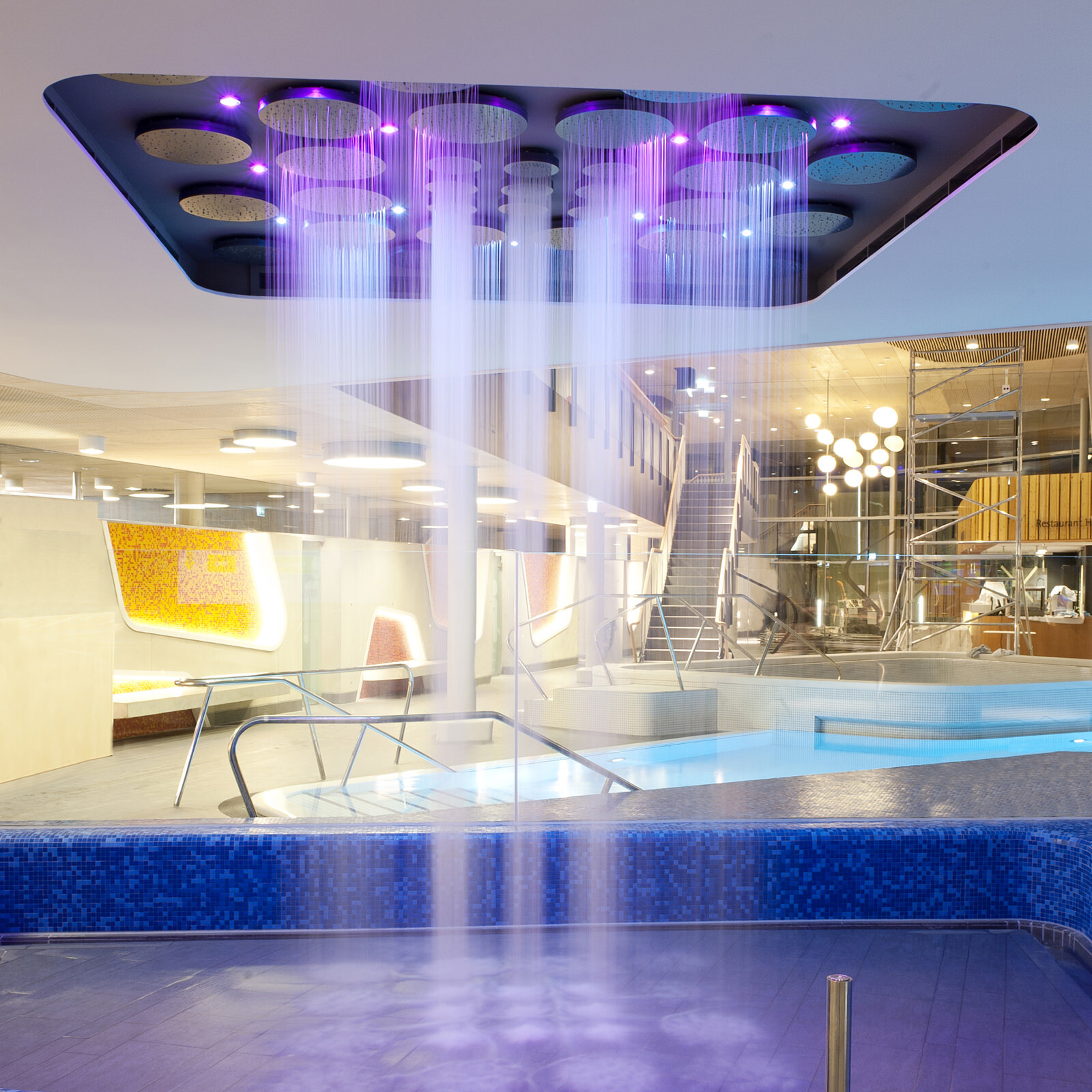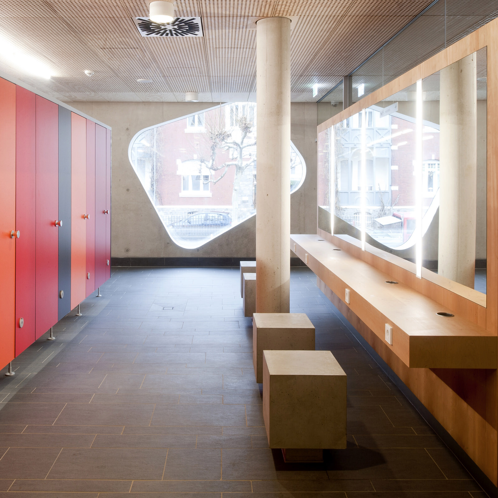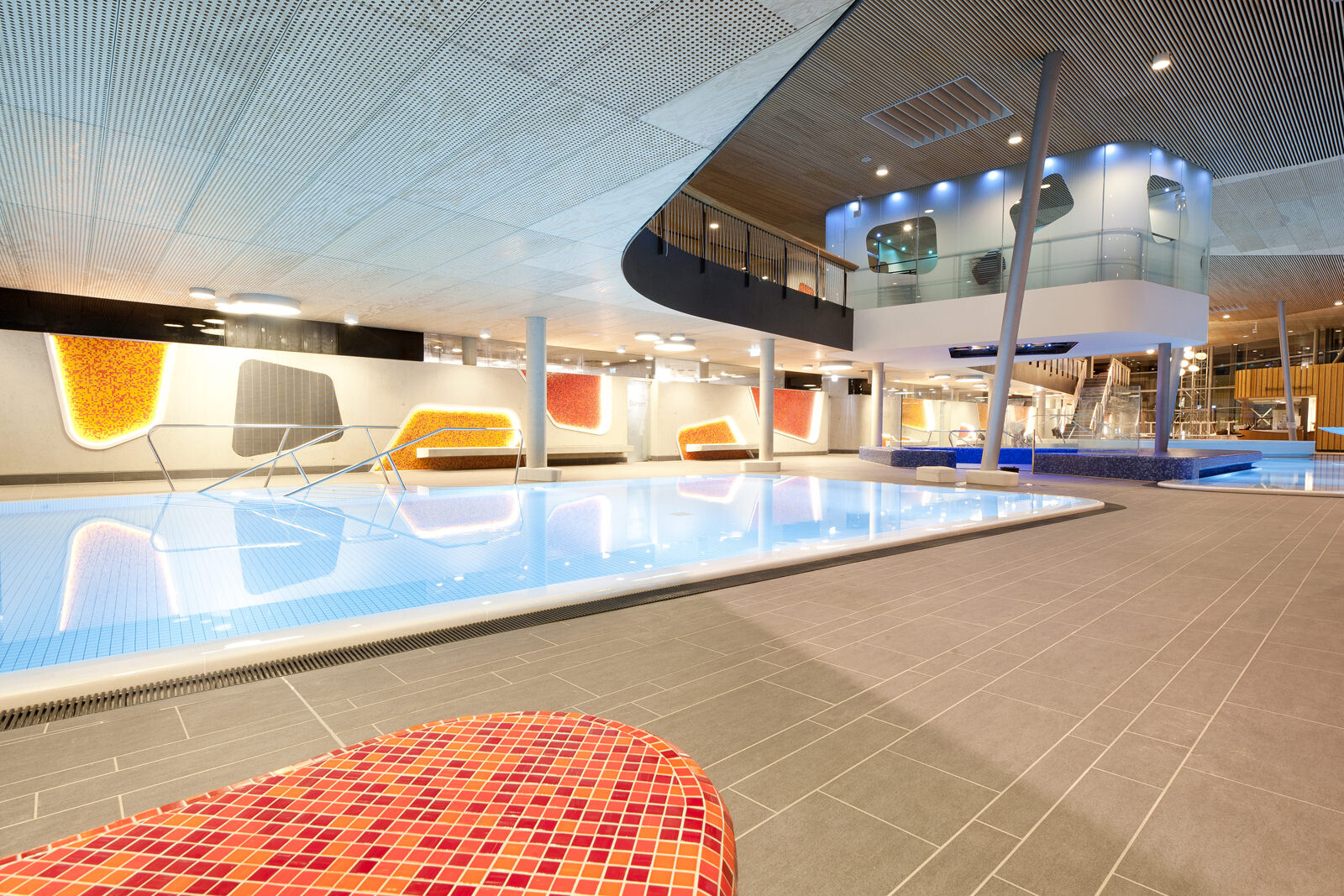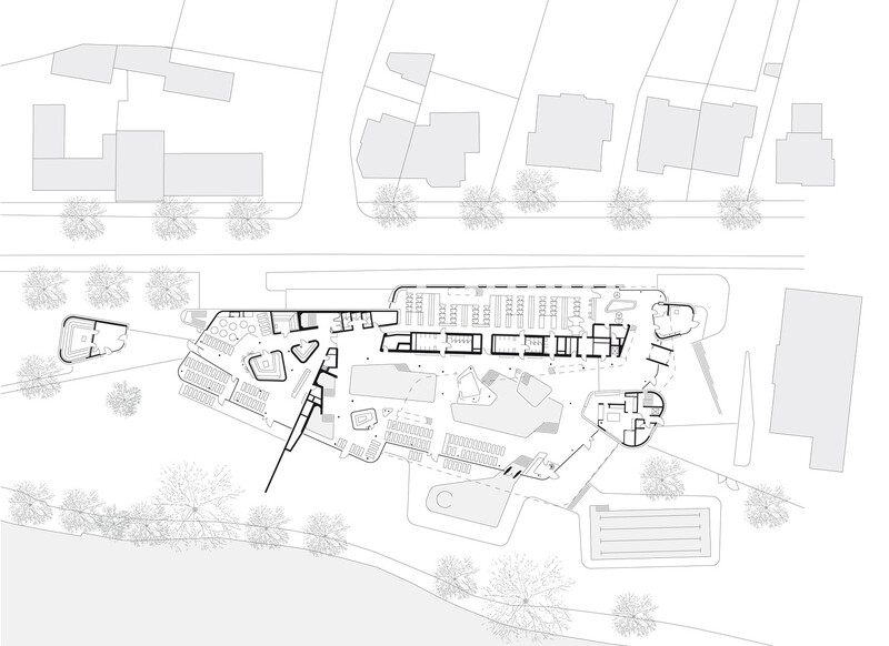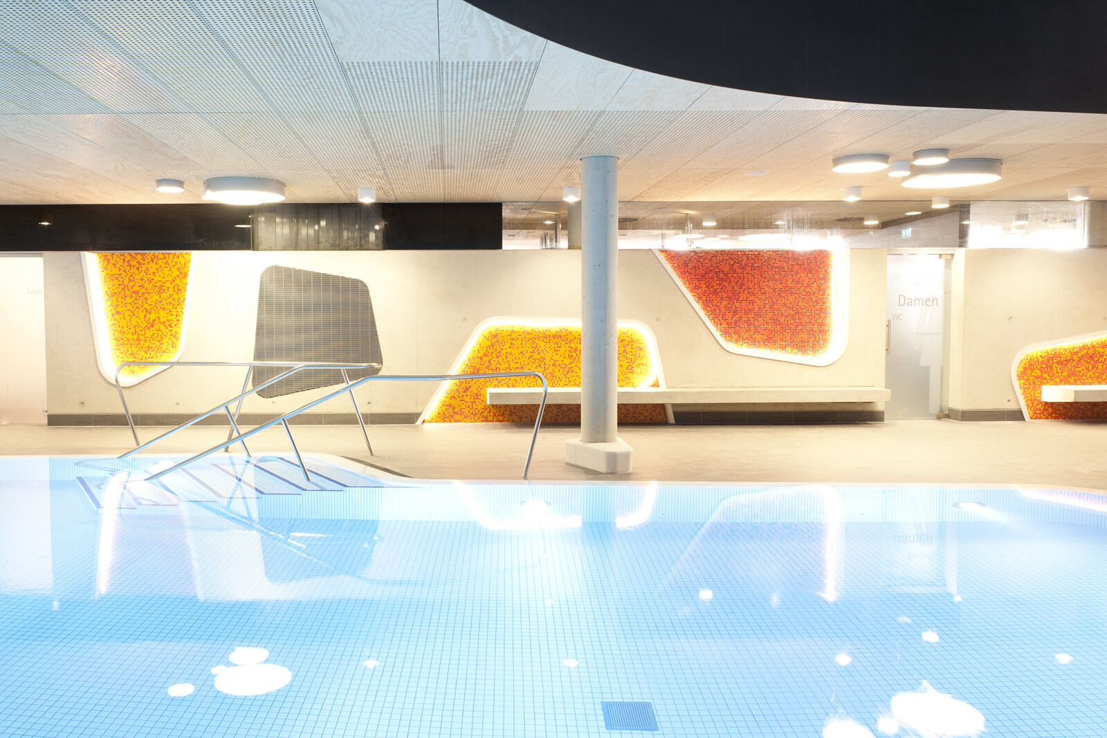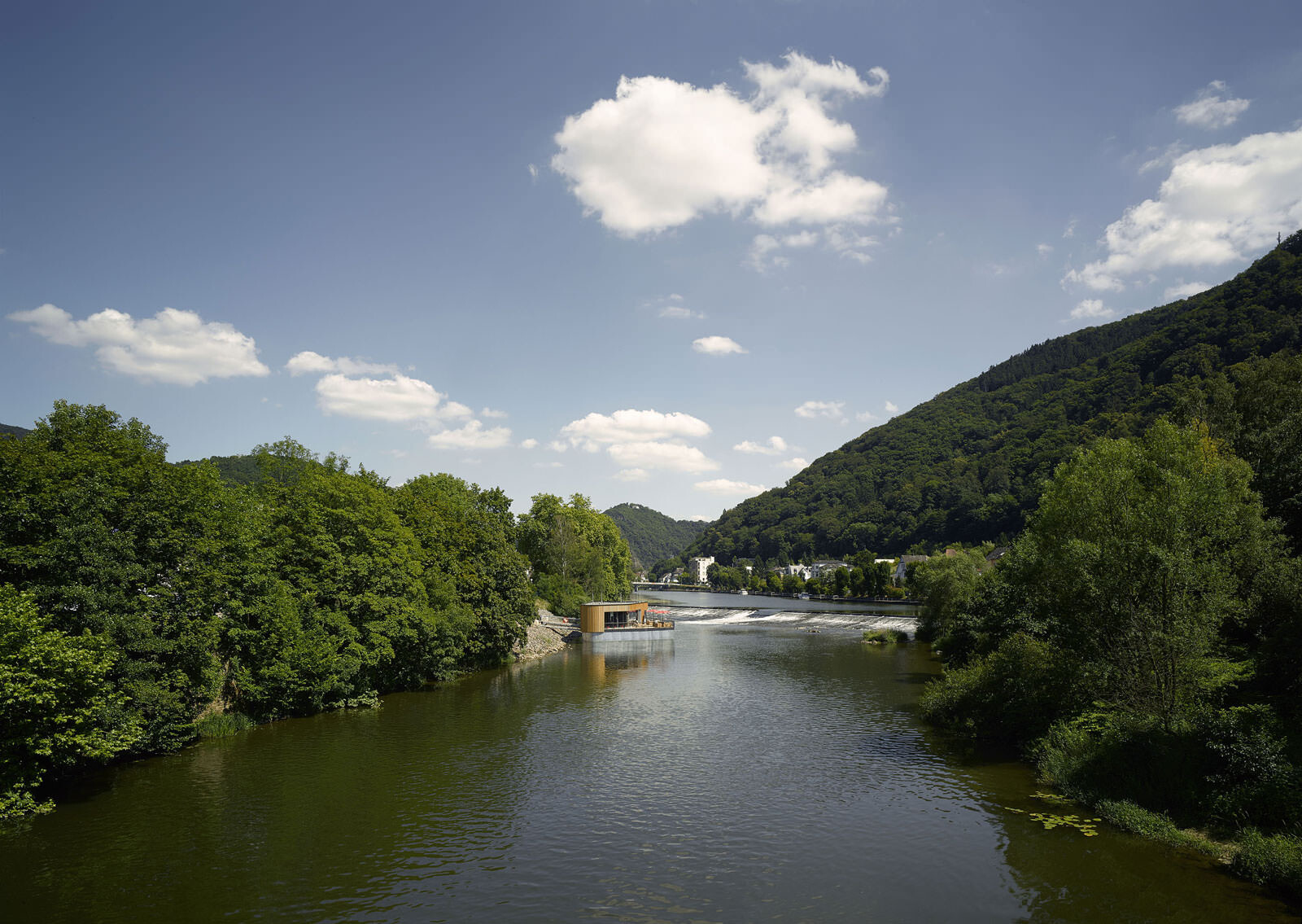 Ein wiederkehrendes Thema bei der Gestaltung der Therme ist der Flusskiesel, wie er auch am Ufer der Lahn vorzufinden ist. Dieser zeigt sich in der Formgebung der einzelnen Baukörper, der Schwimmbecken sowie bei den Fassadenöffnungen und auch bei der Wandgestaltung im Innenraum. Darüber hinaus greift die Therme auch in ihrer Materialität die Charakteristik von Kieselsteinen auf. Die einzelnen Baukörper formen mit ihrem Volumen unterschiedliche Steine, die ähnlich wie Kieselsteine am Flussufer geschichtet sind und sich einander überlagern. Im Zentrum befindet sich die Badehalle – weiträumig und großzügig gestaltet bildet sie das größte Element. Der Saunatrakt schließt nach Westen an. Mit markanter Kieselform schieben sich die zwei Baukörper, welche Gastronomiebereich und Shop beherbergen, in das Gesamtvolumen der Badehalle. Ein besonderer Blickfang sind die kieselförmigen Ausschnitte in der Nordfassade. Die asymmetrischen Öffnungen verleihen dem Baukörper auf der innerstädtisch zugewandten Seite ein lebendiges und heiteres Erscheinungsbild.