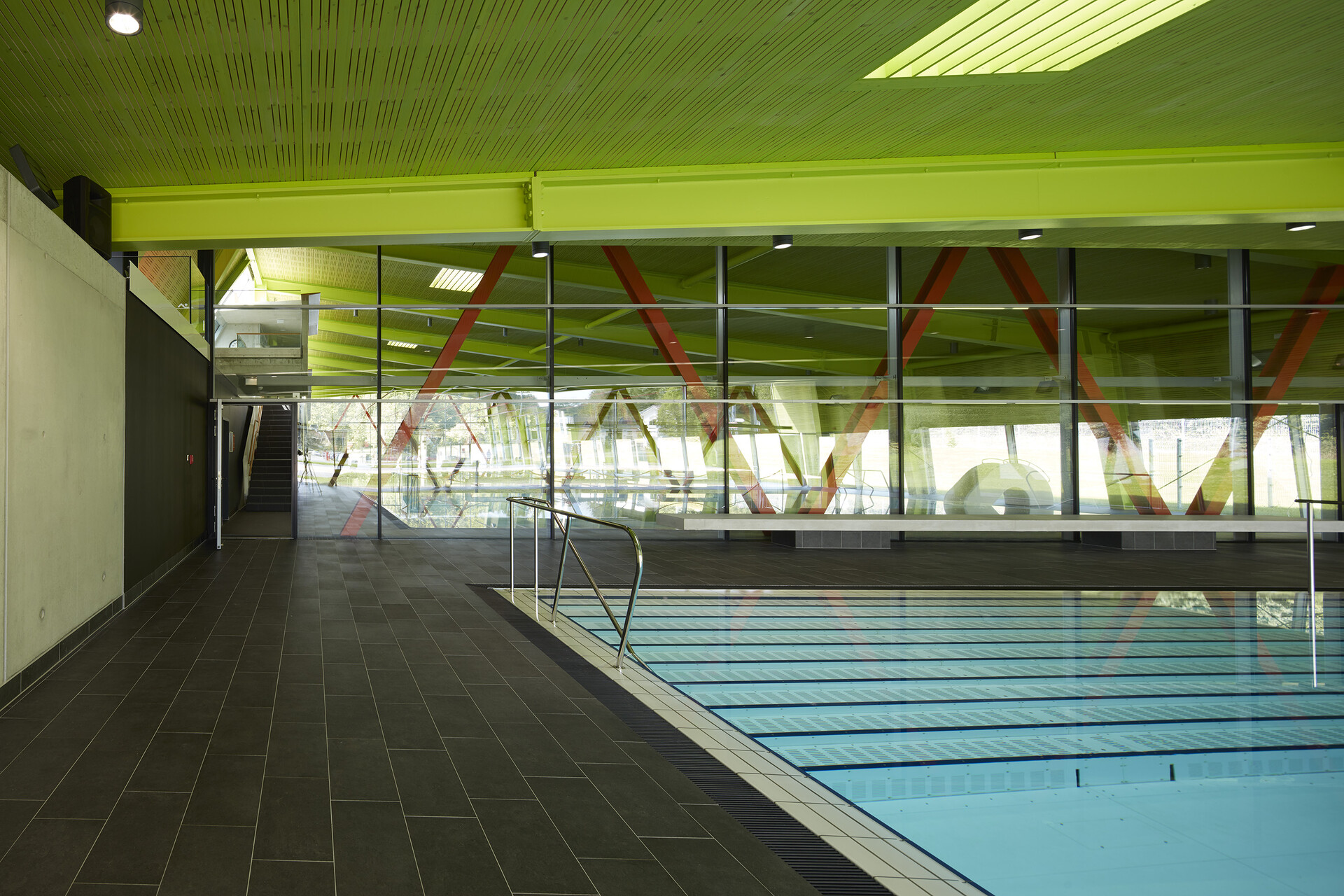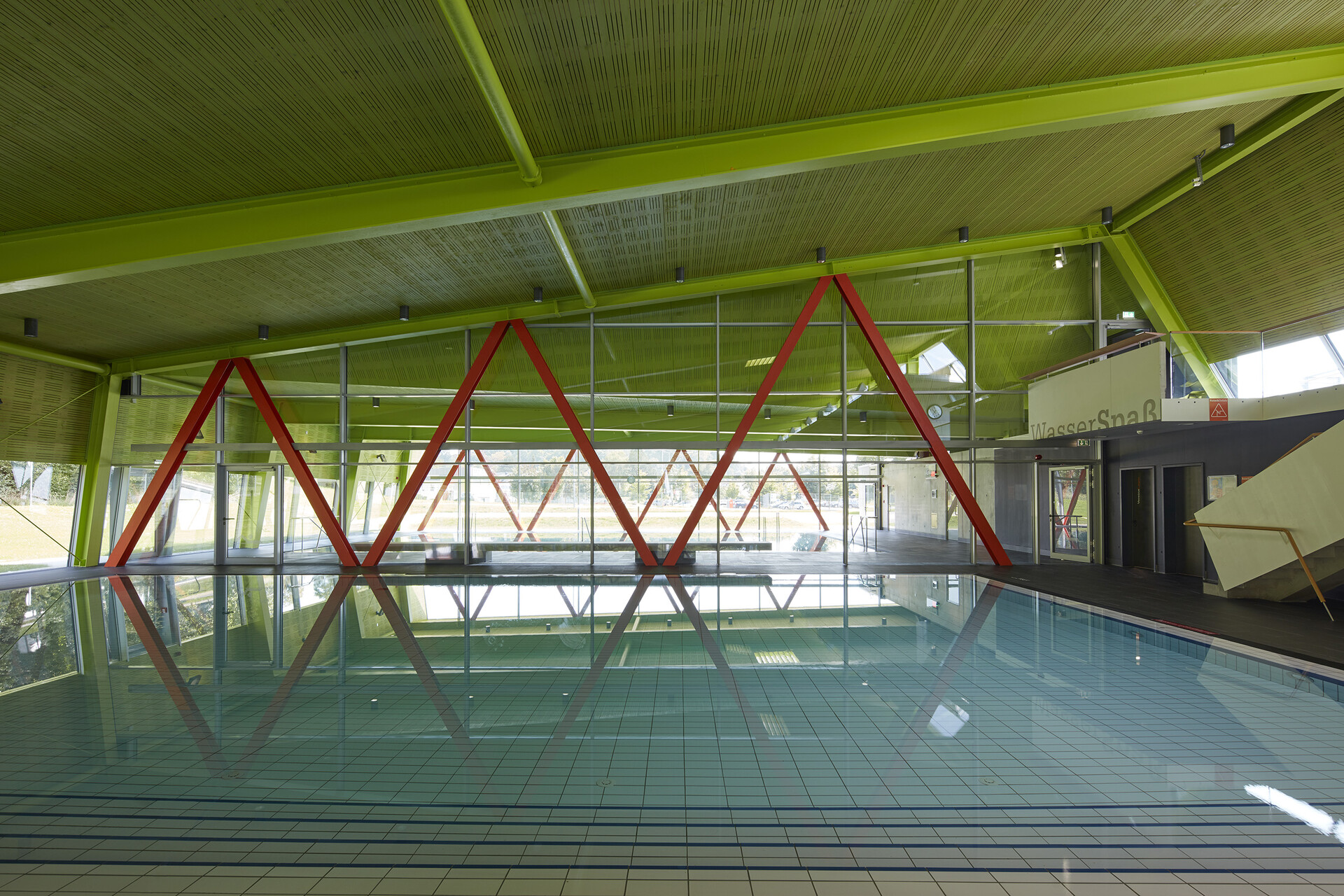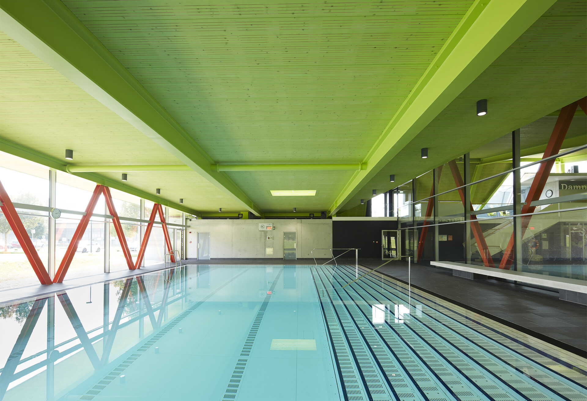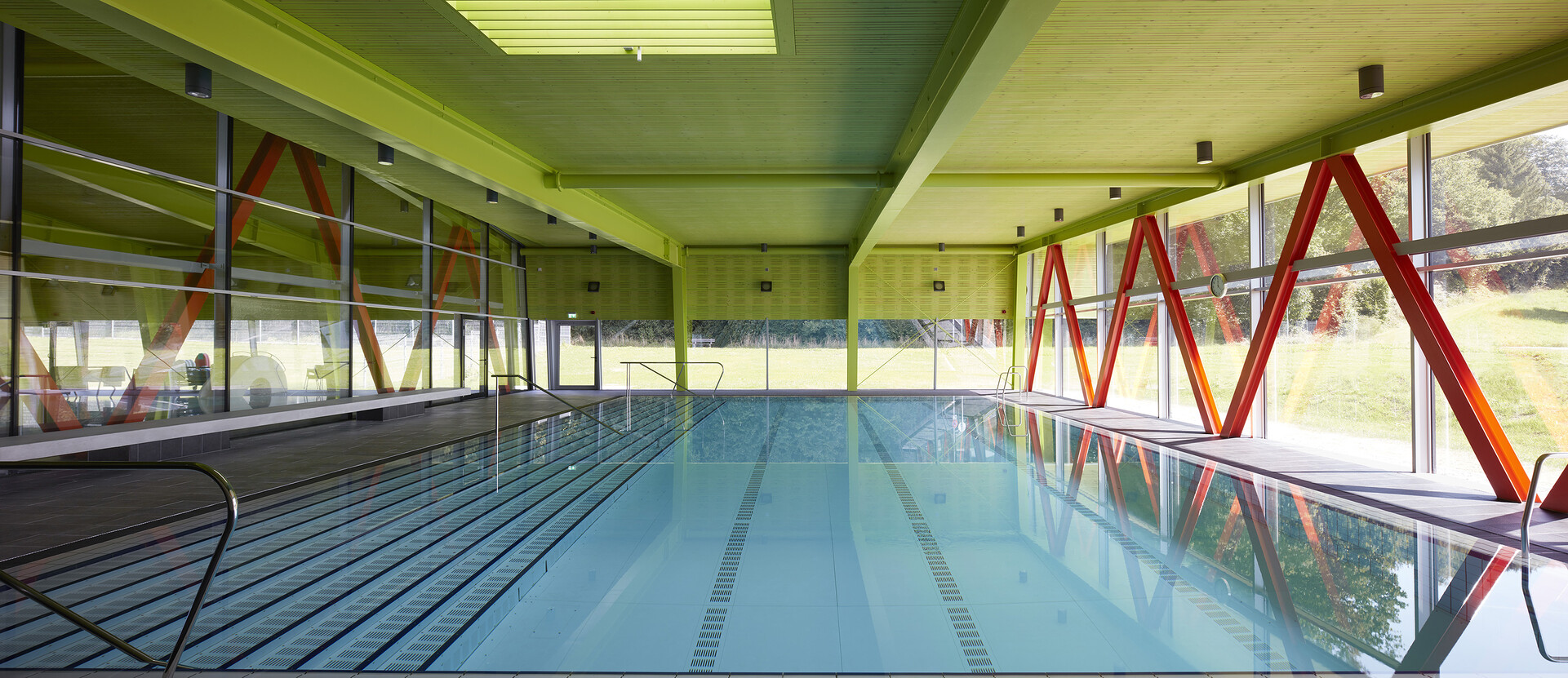 Im Laufe von zehn Betriebsjahren hat sich die Nutzung im Biberacher Sportbad – insbesondere durch den gesteigerten Schulsport – enorm verändert. Deshalb wurde das bestehende Hallenbad mit Schwimmer- und Lehrschwimmbecken, das 4a Architekten bereits im Jahr 2008 errichtet haben, erweitert. Der Anbau erfolgte in Längsrichtung und schließt nach Süden an das Bestandsgebäude an. Er umfasst im Erdgeschoss ein neues Lehrschwimmbecken mit Hubboden sowie Sanitärräume, das Obergeschoss wurde um zwei Sammelumkleiden erweitert. Bei der Planung wurde besonderer Wert darauf gelegt, Bestand und Neubau als architektonische Einheit auszubilden, sowohl konstruktiv als auch hinsichtlich der Materialität. Die Faltung der bestehenden Dachlandschaft wurde aufgegriffen und so raffiniert fortgeführt, dass das Gebäude im Außenraum noch ausdrucksstärker wirkt. Der Clou dabei: Die bestehende Außenfassade blieb erhalten und wurde in das Konzept integriert. Sie dient im Innenraum als akustische Trennwand und gewährleistet so einen ungestörten Schulsportbetrieb.