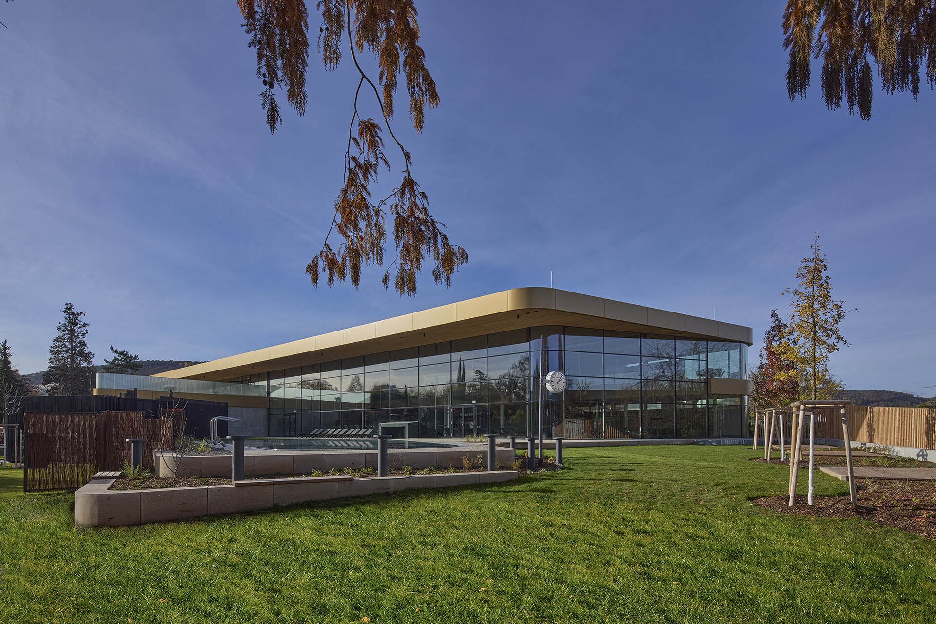 Die neue Außenverkleidung greift ein zentrales Motiv der Region auf. Ihre Farbgebung orientiert sich an der goldenen Tönung eines gereiften Rieslings und übersetzt die lokale Weintradition in eine architektonische Sprache. Umlaufende Fassadenbänder fassen den Thermenbereich zusammen und machen zugleich das Zusammenspiel von Bestand und Neubau klar ablesbar.