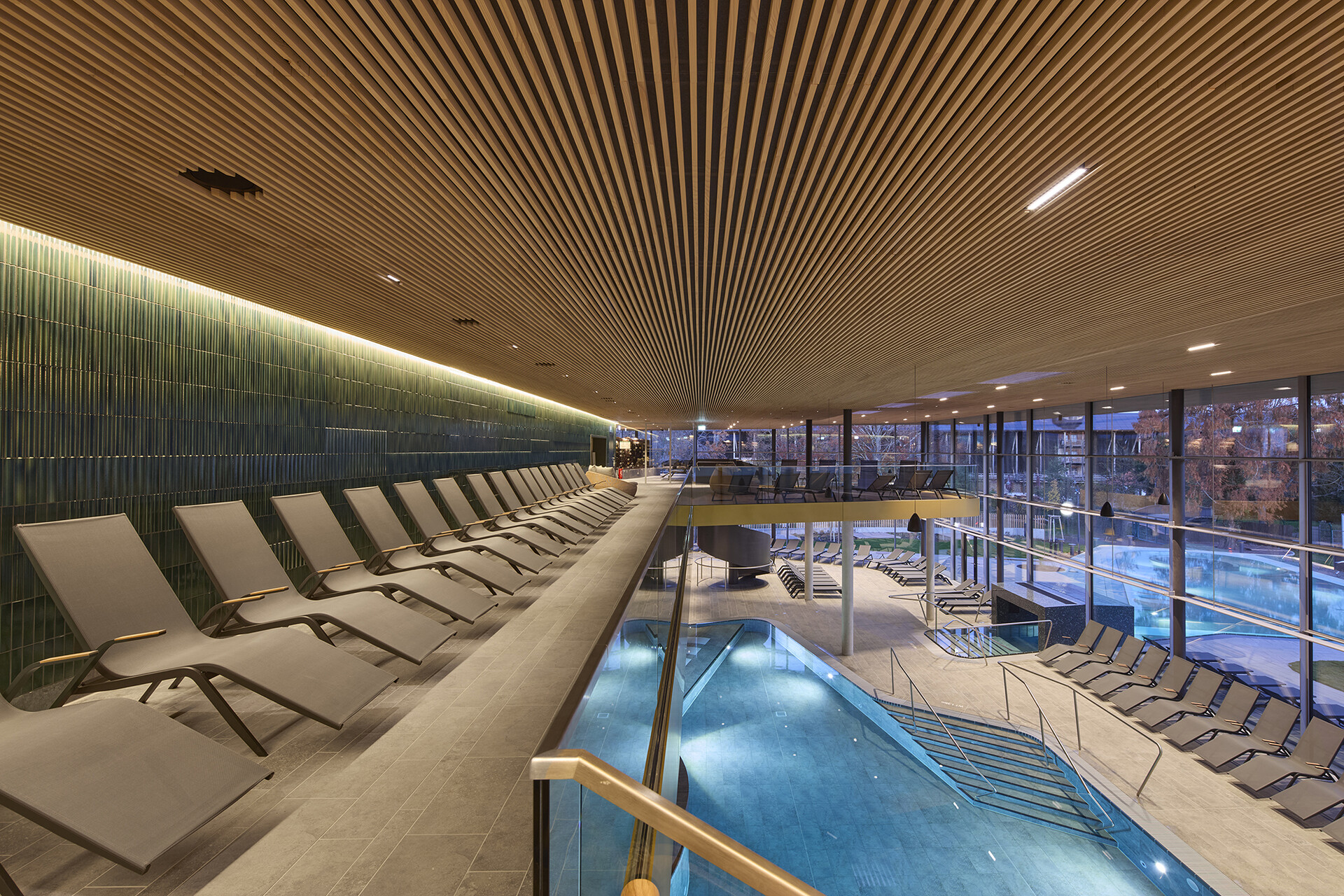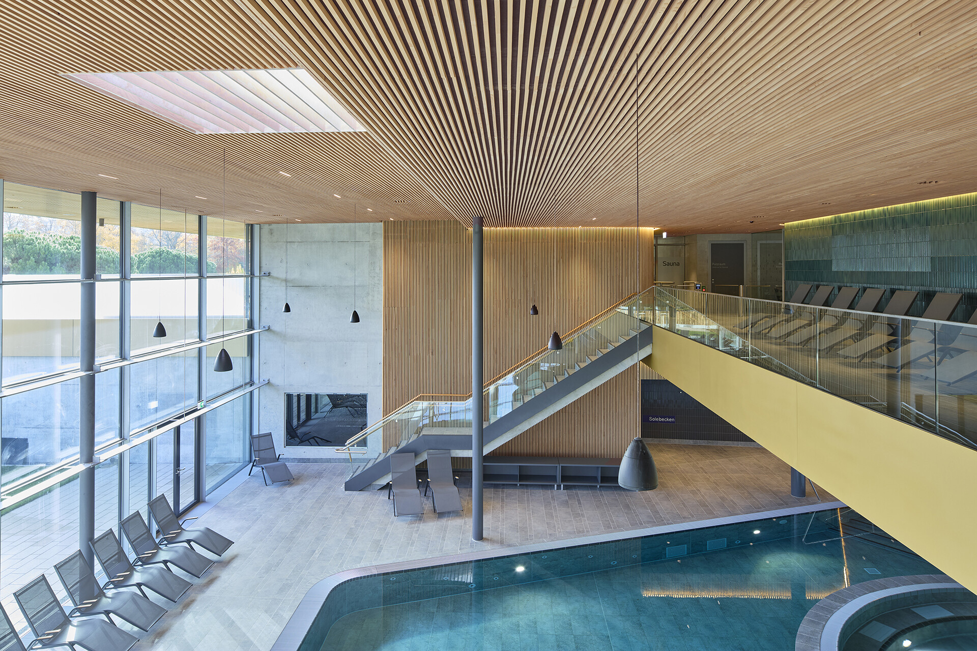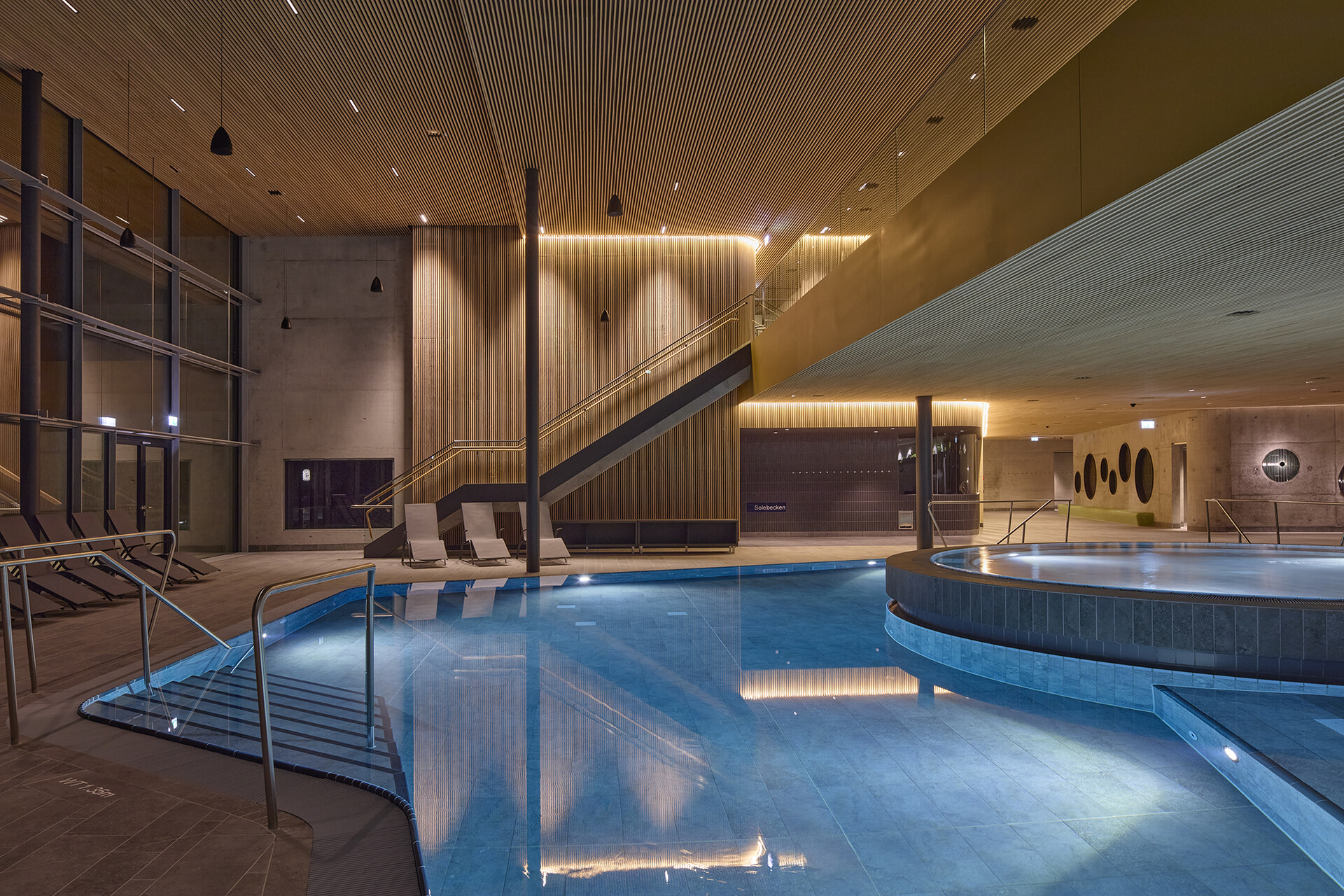 Gestalterisch zeigt sich die Therme bewusst ruhiger und klassischer als das Freizeitbad. Ziel war es, eine zeitlose Atmosphäre mit hoher Dauerhaftigkeit zu schaffen. Warme Materialien wie Holzlamellen, Feinsteinzeug und keramische Beläge in gedeckten Farbtönen prägen die Innenräume. Auch die Becken sind grau gefliest – eine bewusste Entscheidung, die den ruhigen, gediegenen Charakter der Anlage unterstreicht. Die Lichtgestaltung ist integraler Bestandteil des architektonischen Konzepts. Während die Grundbeleuchtung zurückhaltend eingesetzt wird, akzentuieren präzise gesetzte Lichtlinien ausgewählte architektonische Elemente und unterstützen die räumliche Orientierung.