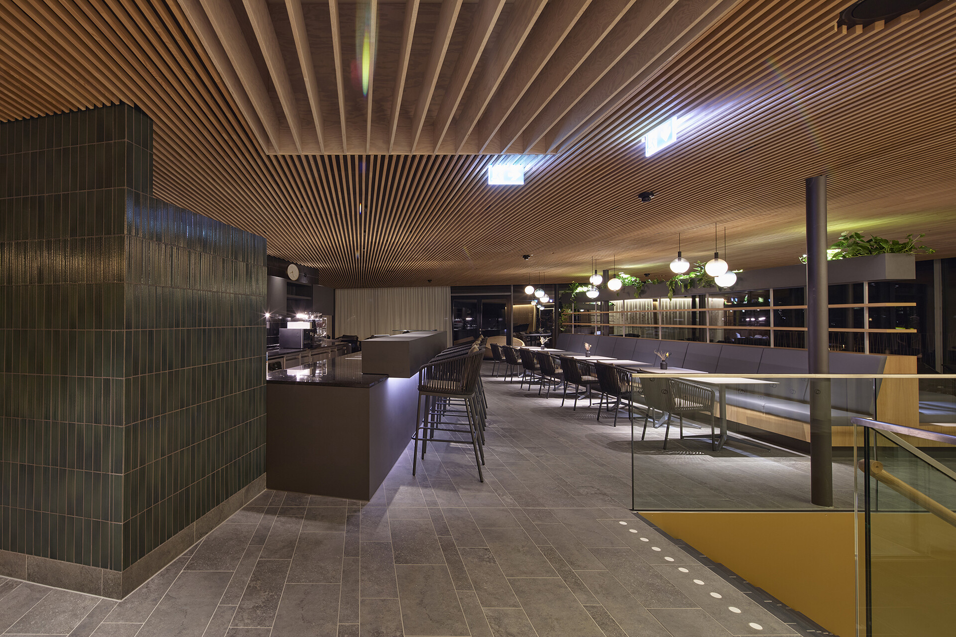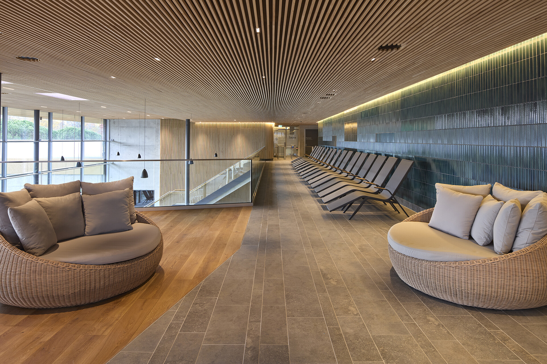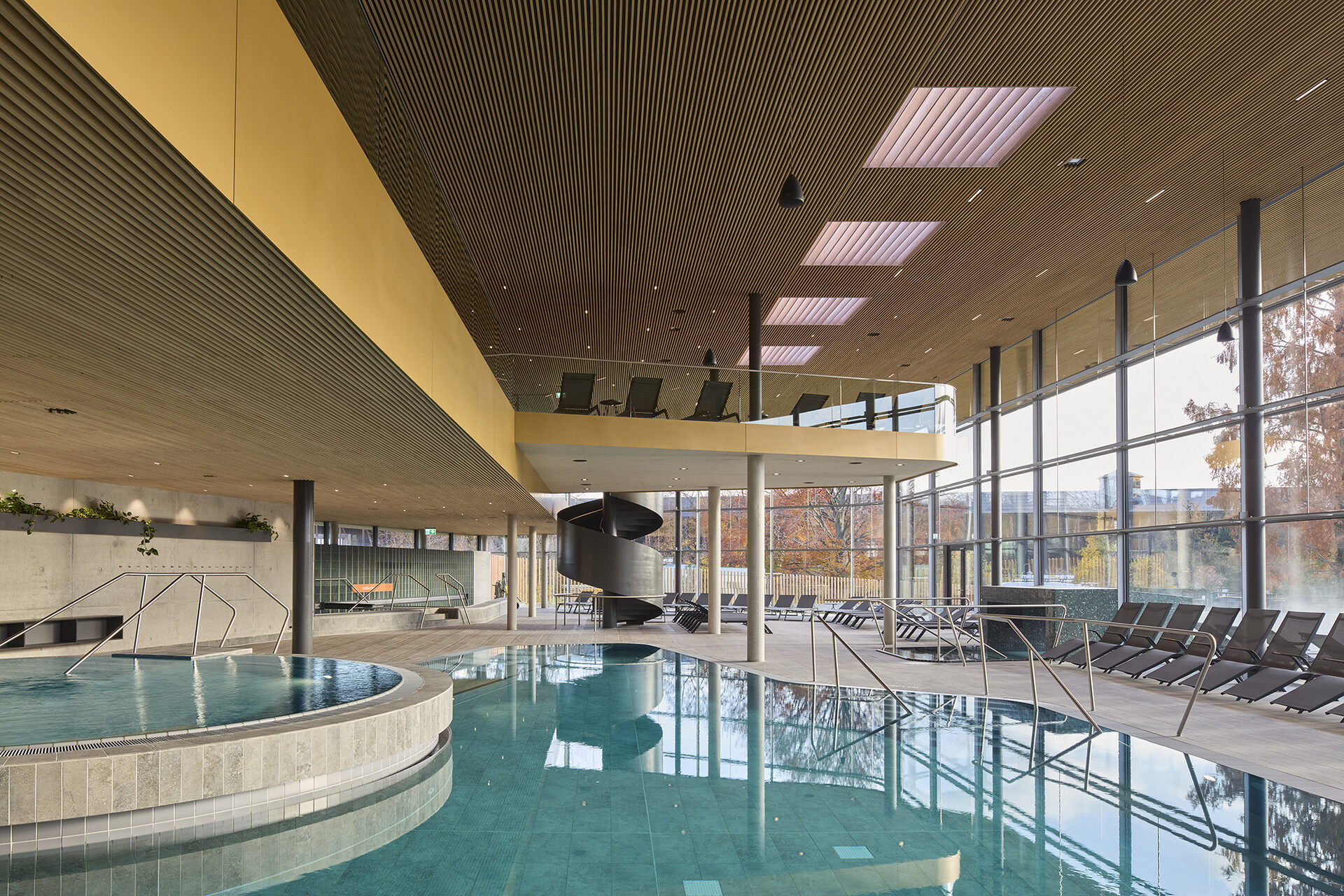 Gestalterisch zeigt sich die Therme bewusst ruhiger und klassischer als das Freizeitbad. Ziel war es, eine zeitlose Atmosphäre mit hoher Dauerhaftigkeit zu schaffen. Warme Materialien wie Holzlamellen, Feinsteinzeug und keramische Beläge in gedeckten Farbtönen prägen die Innenräume. Auch die Becken sind grau gefliest – eine bewusste Entscheidung, die den ruhigen, gediegenen Charakter der Anlage unterstreicht. Die Lichtgestaltung ist integraler Bestandteil des architektonischen Konzepts. Während die Grundbeleuchtung zurückhaltend eingesetzt wird, akzentuieren präzise gesetzte Lichtlinien ausgewählte architektonische Elemente und unterstützen die räumliche Orientierung.