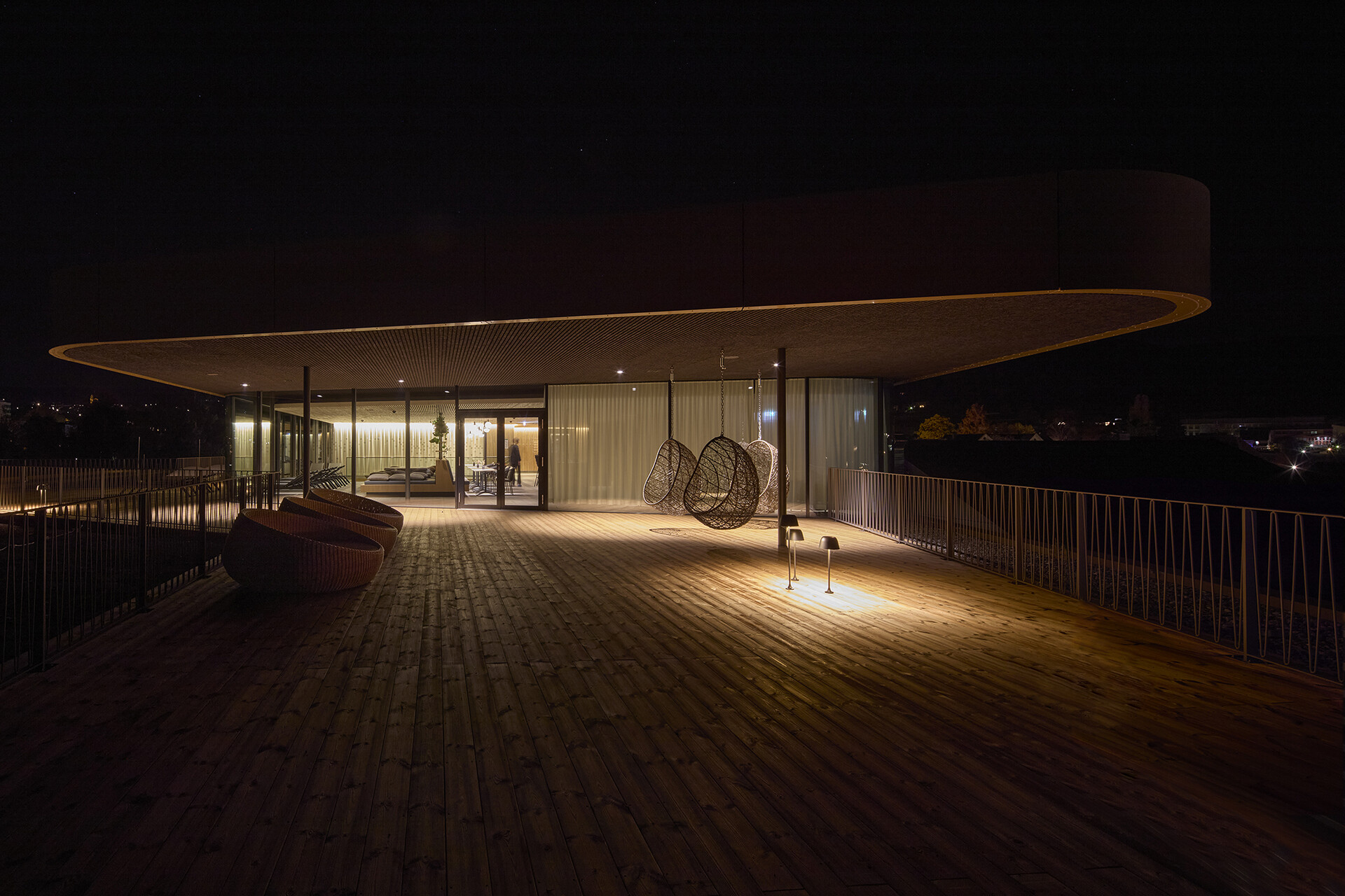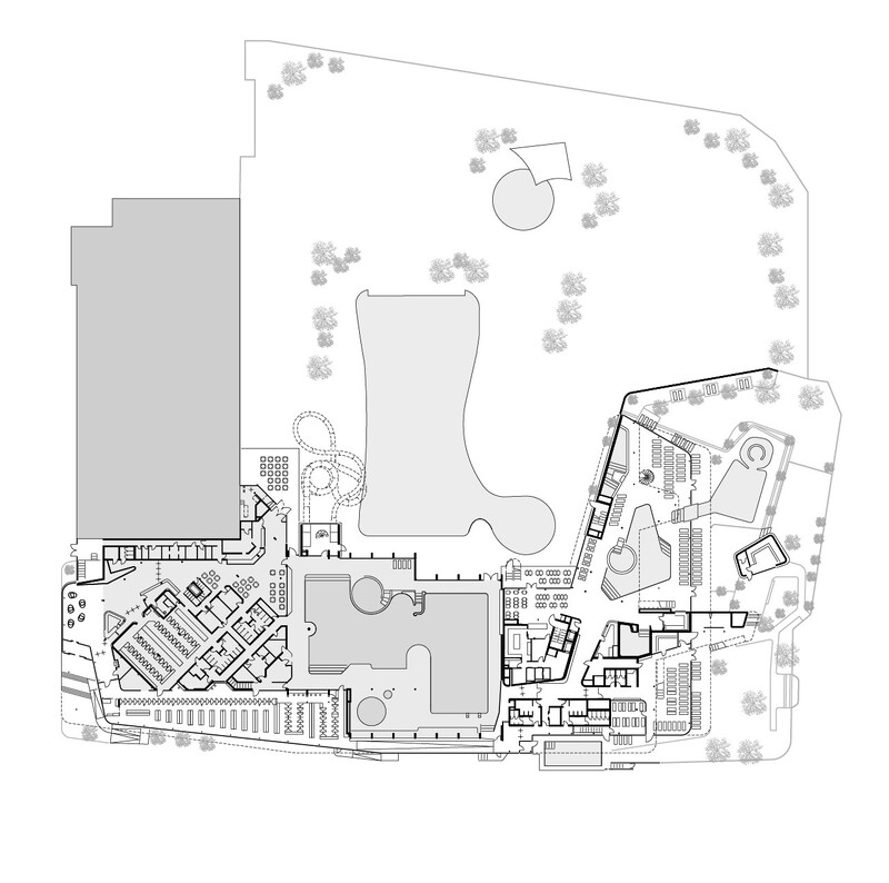 Der Thermenbereich selbst ist von geschwungenen Formen geprägt, die fließende Raumsequenzen erzeugen und eine intuitive Orientierung unterstützen. Der Neubau erstreckt sich über drei Ebenen. Die Saunalandschaft entwickelt sich über alle Geschosse hinweg und bietet eine große thematische Vielfalt. Auf jeder Ebene ergänzen gastronomische Angebote mit unterschiedlichen Aufenthaltsqualitäten das Raumprogramm: ein Restaurant im Erdgeschoss, eine Kaminlounge im ersten Obergeschoss sowie großzügige Liegebereiche im zweiten Obergeschoss mit Blick auf Park und Stadt. Alle Ebenen öffnen sich zudem ins Freie. Ein Saunagarten mit Außensaunen, ein an die Thermalhalle angeschlossener Freibereich sowie eine Dachterrasse erweitern das Angebot und verknüpfen Innen- und Außenräume.
