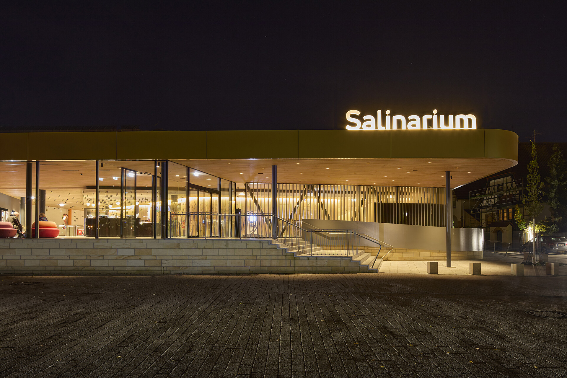 Das Salinarium liegt in unmittelbarer Nähe des Kurparks im Zentrum von Bad Dürkheim. Mit der Erweiterung des bestehenden Freizeitbads um einen Thermen- und Saunabereich haben 4a Architekten das Ensemble behutsam weiterentwickelt und zugleich architektonisch neu gefasst. Ziel der Planung war es, den Neubau sorgfältig in die vorhandenen Strukturen von Freizeit- und Freibad einzubinden und das Gesamtbild des Salinariums deutlich aufzuwerten – ohne den laufenden Betrieb zu unterbrechen. Den architektonischen Auftakt bildet ein neu gestalteter Eingangsbereich mit weit auskragendem Dach. Mit seiner offenen Geste empfängt er die Besucherinnen und Besucher und verleiht dem Salinarium ein zeitgemäßes, prägnantes Gesicht nach außen.