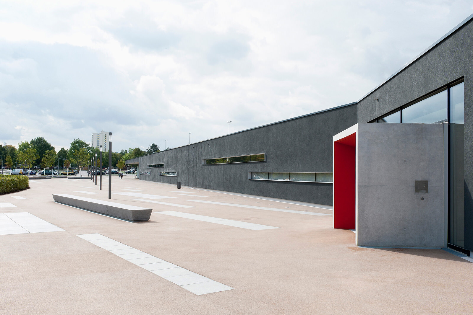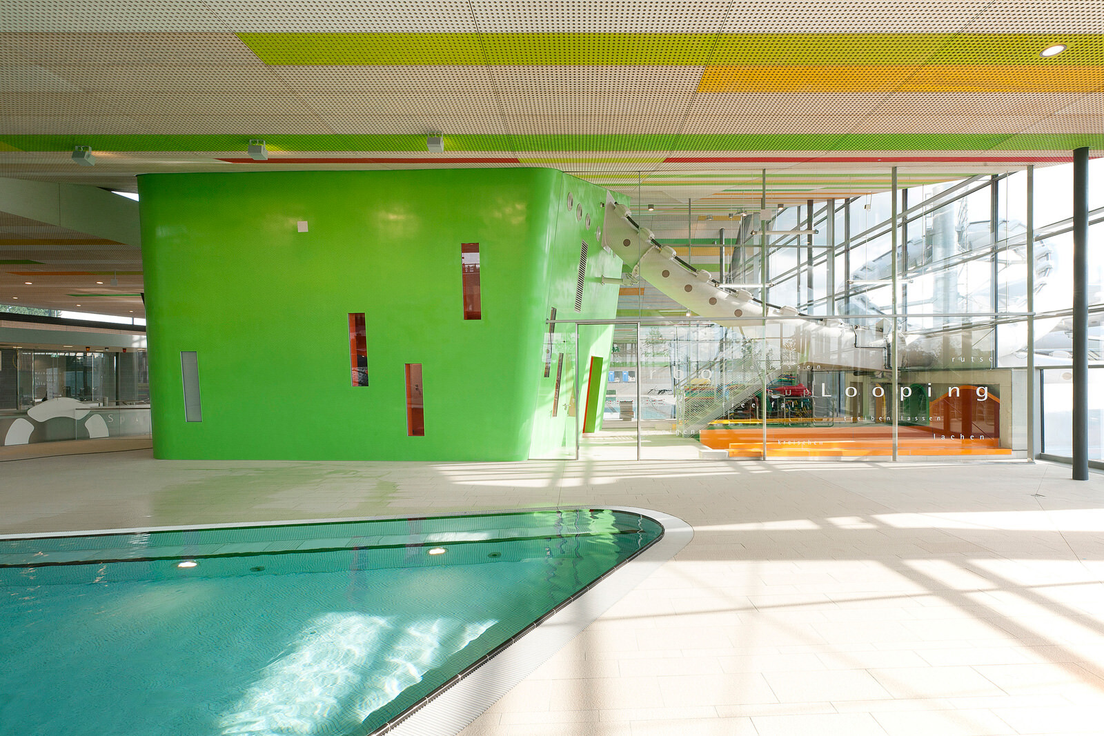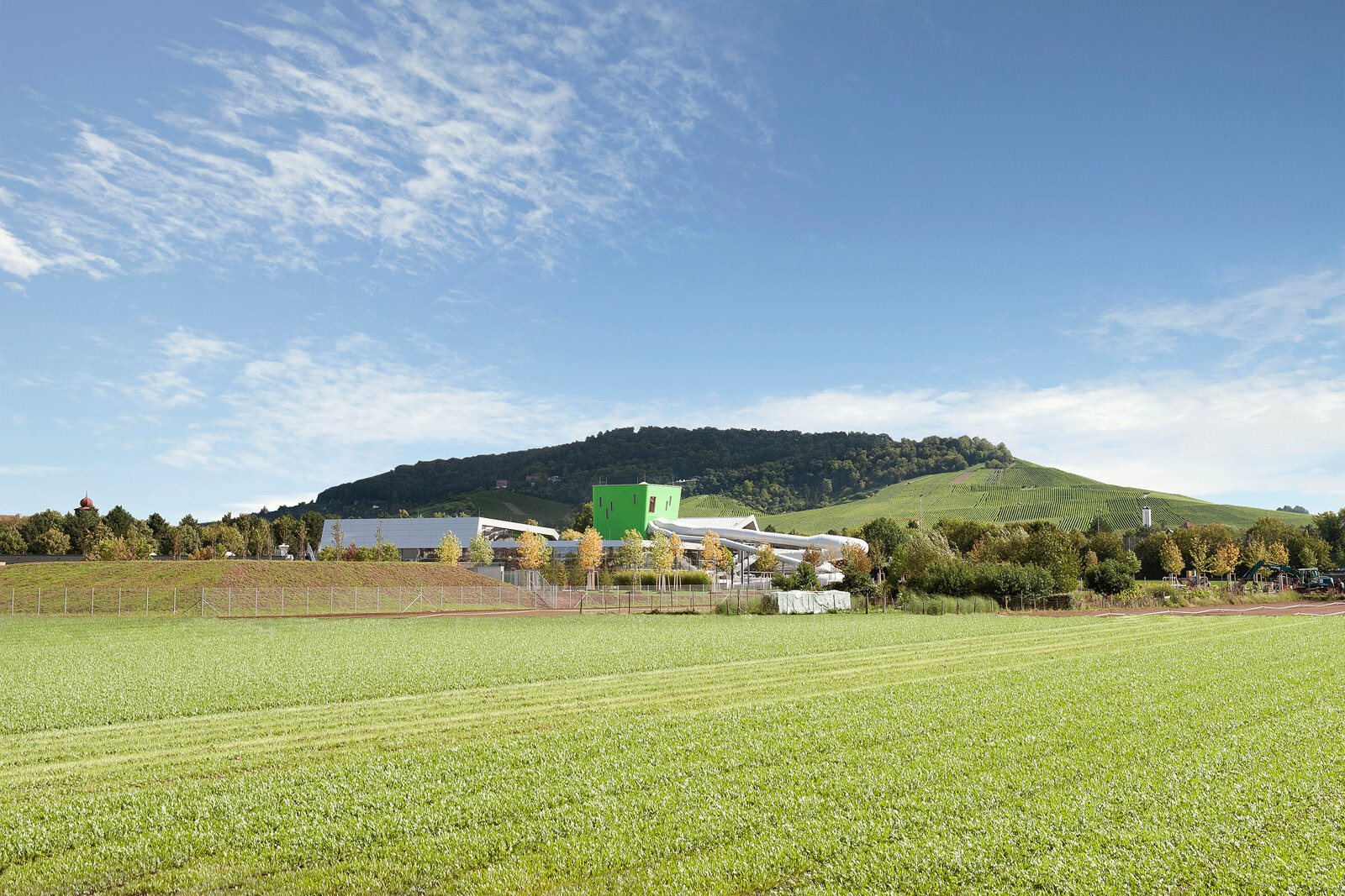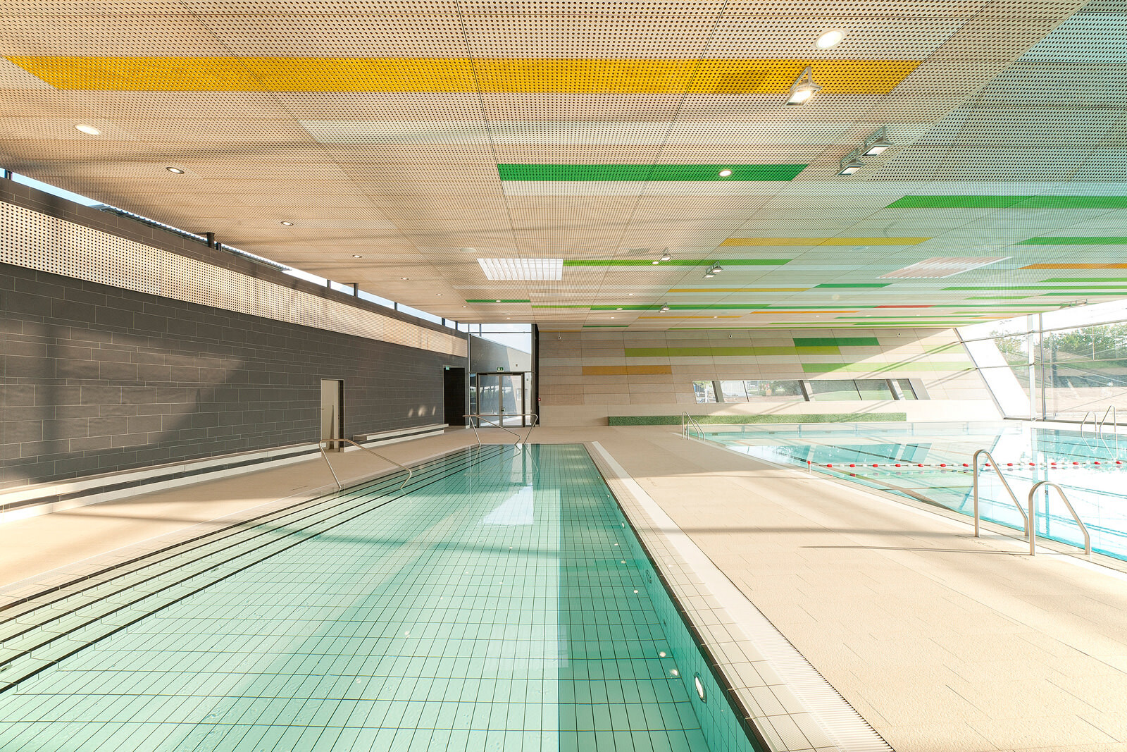 Das Familien- und Freizeitbad F.3 umfasst drei unterschiedliche Bereiche – Sportbereich mit Hallenbad und Freibad, Erlebnisbecken und Saunawelt. Diese wurden in eine fließende Form überführt, welche sich sanft in den Landschaftsraum einbettet und sowohl formal als auch gestalterisch regionale Aspekte aufgreift. Ausgangspunkt und Leitmotiv bei Form- und Gestaltgebung des Bades war die Lage am westlichen Stadtrand von Fellbach nahe des Kappelbergs. Als einer der bekannten Weinberge in der Region lieferte dieser Berg und mit ihm das Thema Wein die Grundlage für das architektonische Konzept. Für die formale Einbindung des Gebäudes in die Landschaft wurden die linearen Weinbergstrukturen als Felder auf das Grundstück gelegt. Die Material- und Farbgestaltung erfolgte ebenfalls in Anlehnung an das architektonische Leitbild. Zentrales Gestaltungselement sind Mosaikfliesen, welche den Wechsel der Jahreszeiten farblich aufgreifen.