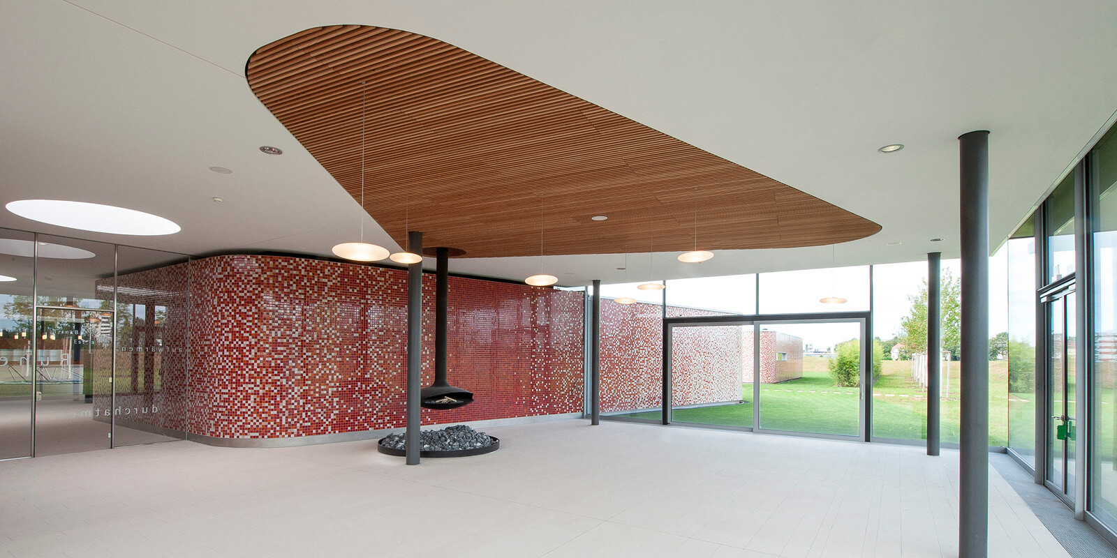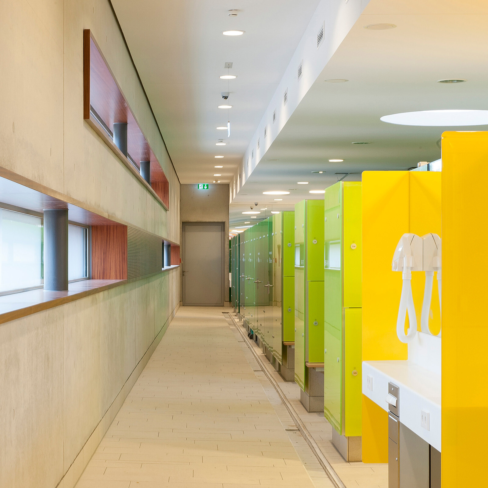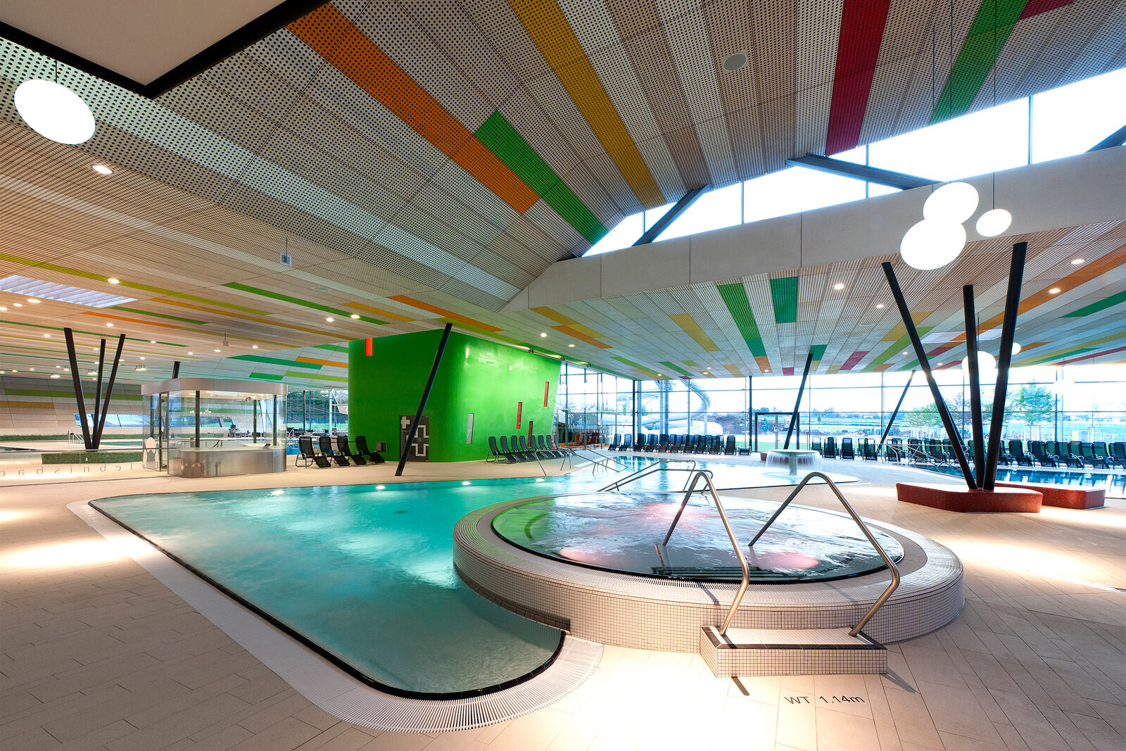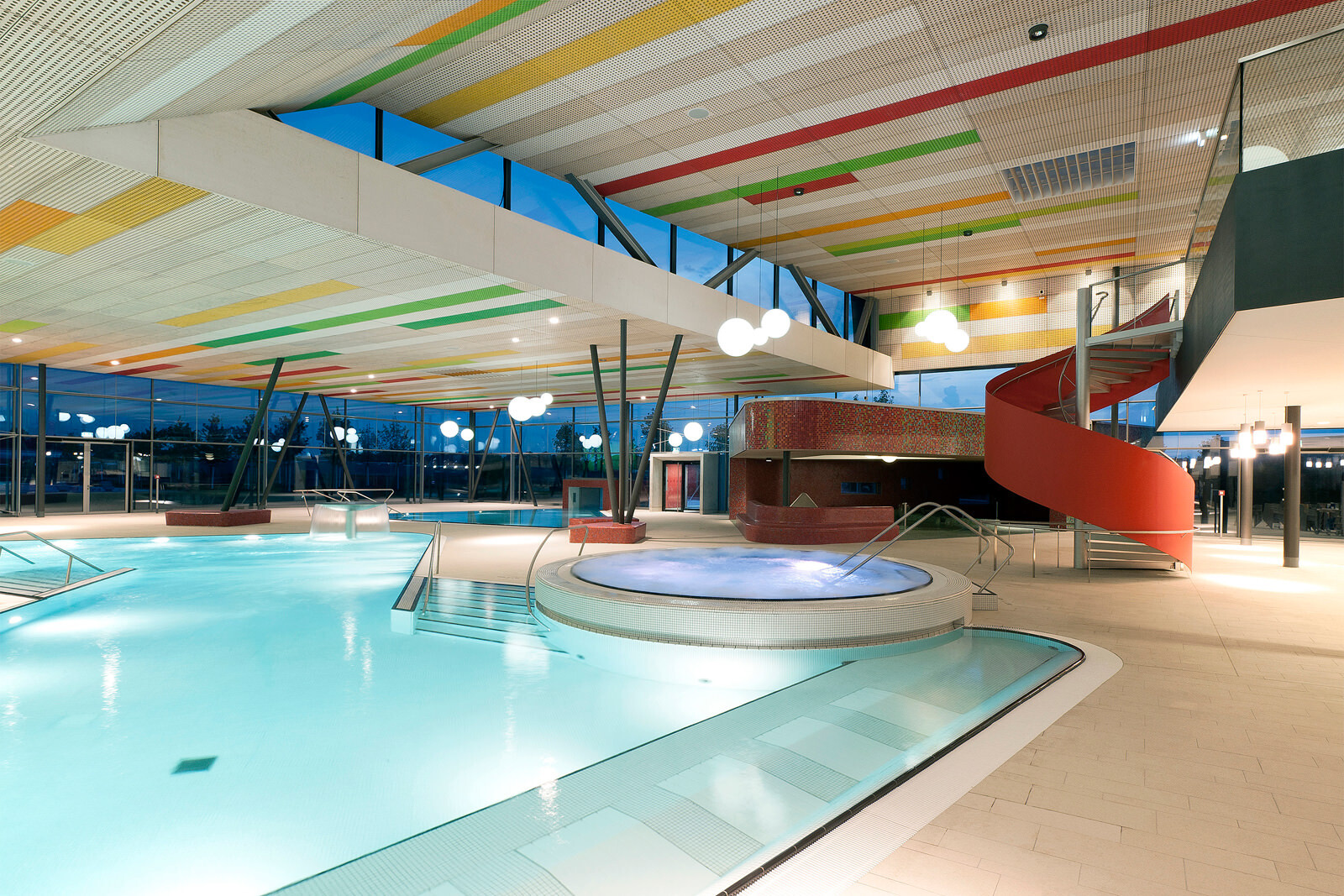 Das Familien- und Freizeitbad F.3 umfasst drei unterschiedliche Bereiche – Sportbereich mit Hallenbad und Freibad, Erlebnisbecken und Saunawelt. Diese wurden in eine fließende Form überführt, welche sich sanft in den Landschaftsraum einbettet und sowohl formal als auch gestalterisch regionale Aspekte aufgreift. Ausgangspunkt und Leitmotiv bei Form- und Gestaltgebung des Bades war die Lage am westlichen Stadtrand von Fellbach nahe des Kappelbergs. Als einer der bekannten Weinberge in der Region lieferte dieser Berg und mit ihm das Thema Wein die Grundlage für das architektonische Konzept. Für die formale Einbindung des Gebäudes in die Landschaft wurden die linearen Weinbergstrukturen als Felder auf das Grundstück gelegt. Die Material- und Farbgestaltung erfolgte ebenfalls in Anlehnung an das architektonische Leitbild. Zentrales Gestaltungselement sind Mosaikfliesen, welche den Wechsel der Jahreszeiten farblich aufgreifen.