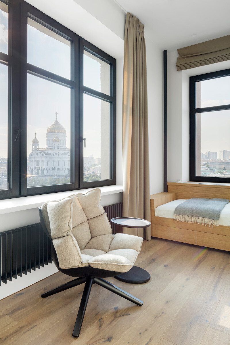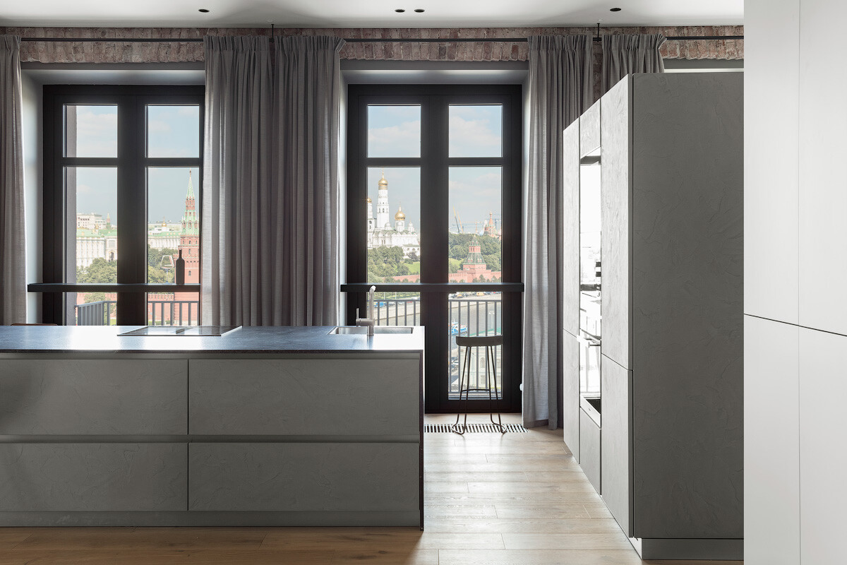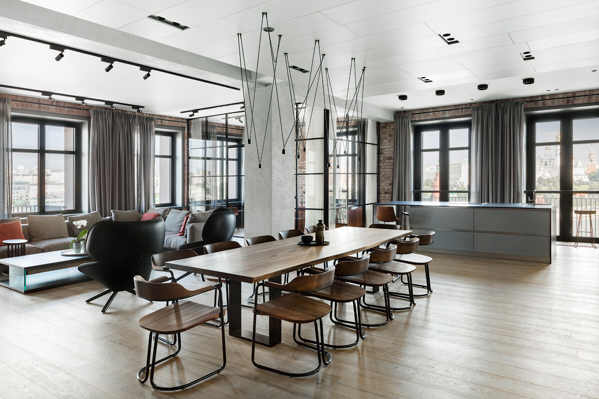 In wohnlicher Atmosphäre einen exklusiven Blick auf dem Kreml genießen, diese Möglichkeit bietet sich den Bewohnern des rund 230 m² großen Appartements seit dem Umbau durch 4a Architekten Moskau. Weiträumigkeit und Behaglichkeit standen im Vordergrund der Neugestaltung. Für ein besonderes Raumgefühl sorgen ein offener Grundriss, großzügige Verglasungen, warme Naturtöne in Kombination mit Sichtmauerwerk sowie ein ausgewähltes Mobiliar.