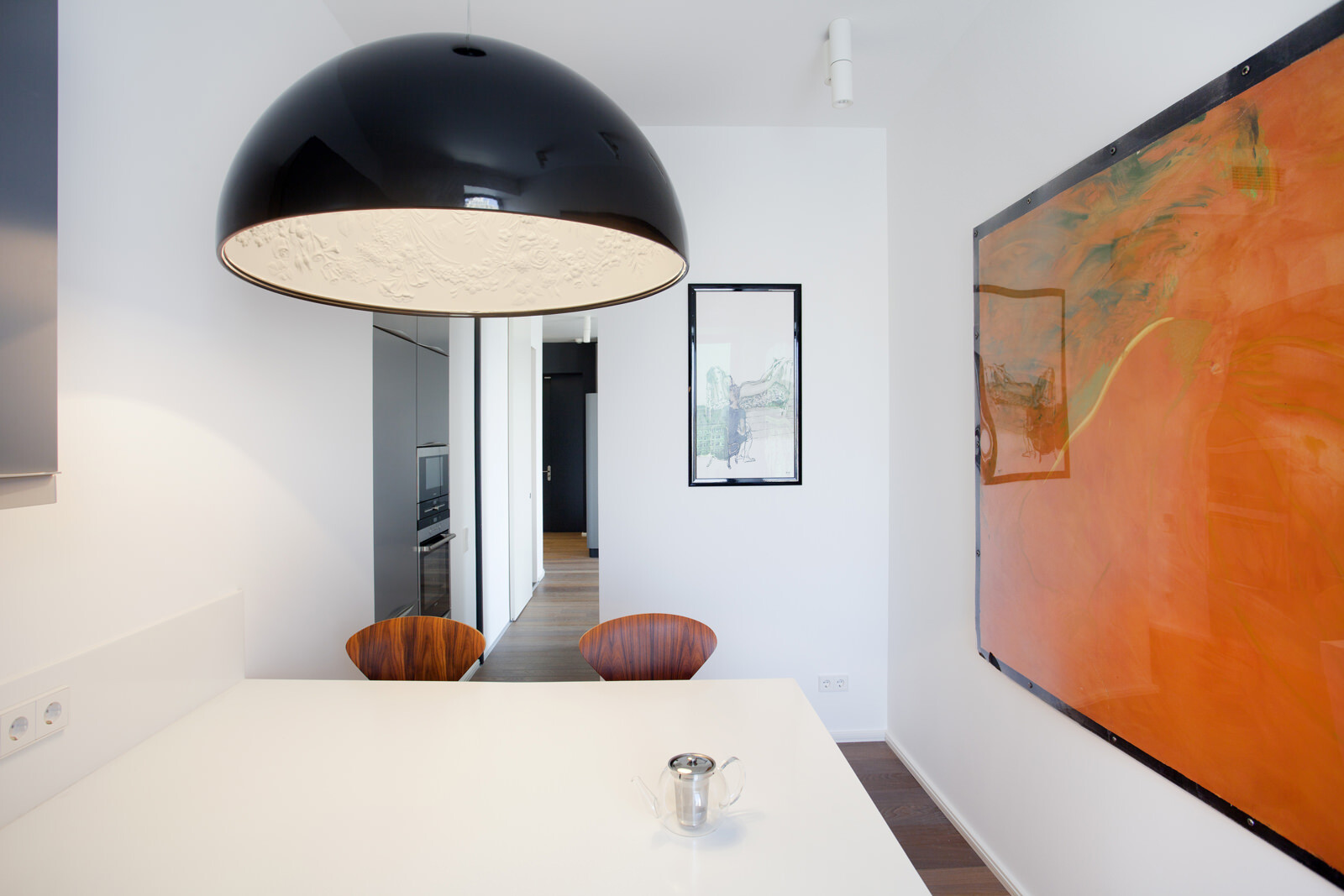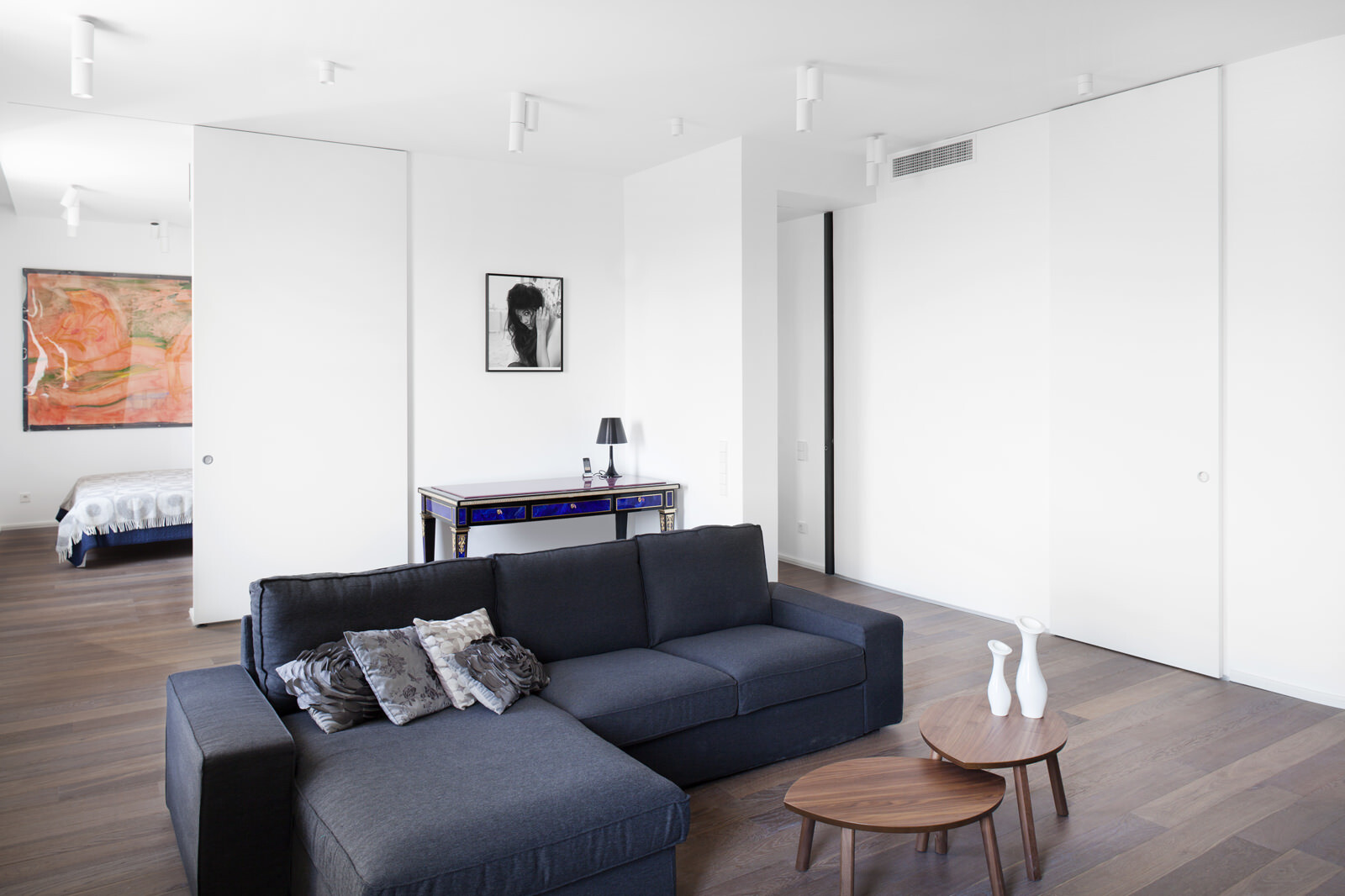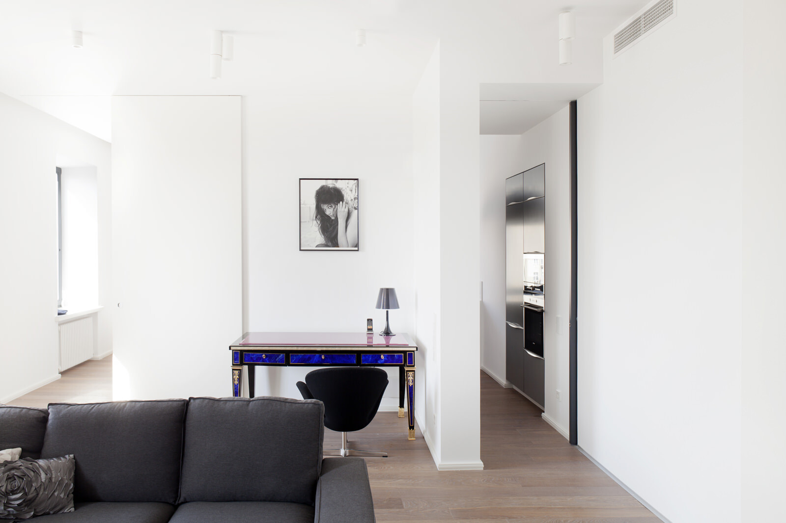Die Wohnung befindet sich in einem bestehenden Gebäude im Zentrum von Moskau mit Blick auf einen Park. Das typische Moskauer Altstadthaus hat eine Geschosshöhe von rund 3,30 Metern. Der bestehende Grundriss der Wohnung mit Wohnzimmer, Schlafzimmer, Küche und Bad/WC blieb weitestgehend erhalten. Für größtmögliche Bewegungsfreiheit und Flexibilität wurden raumhohe Schiebetüren eingebaut. Sie verleihen der Wohnung ein großzügiges Raumgefühl und repräsentativen Charakter. Geöffnet treten die Türen in den Hintergrund und sorgen für fließende Übergänge zwischen den Räumen. Dabei bleibt die Außenwand raumübergreifend als durchgängige Fensterfront erhalten. Eine Voutenbeleuchtung entlang der Fensterfront unterstreicht diesen besonderen Eindruck. Im Wohnzimmer bietet ein Einbauschrank Stauraum und definiert zugleich die Eingangssituation – über Eck eingebaut dient er als Trennwand zwischen Wohnraum und Eingang und bildet einen geschützten Eingangsbereich. Dieses Einbauelement wie auch die Einbauwand in Bad und WC und die Küche wurde nach Entwürfen von 4a Architekten gebaut. In der Küche geht die Arbeitsplatte aus Corian nahtlos in einen Esstisch über. Das ermöglicht eine optimale Nutzung der zur Verfügung stehenden Fläche und greift die klare Gestaltungslinie auf.