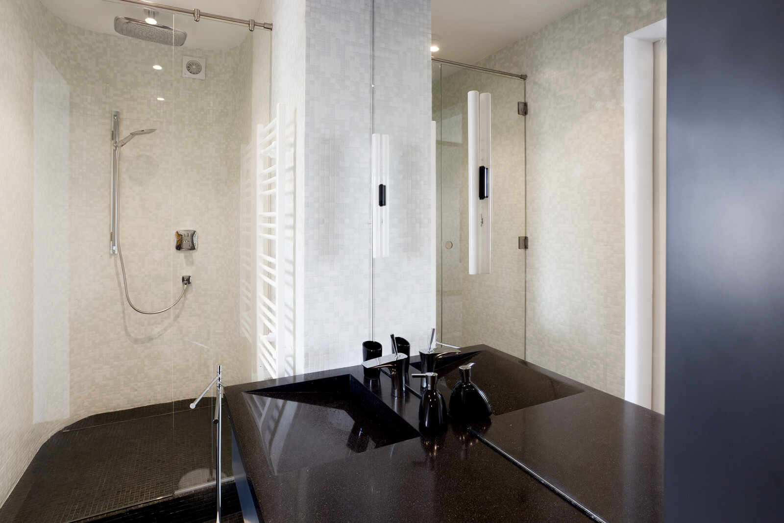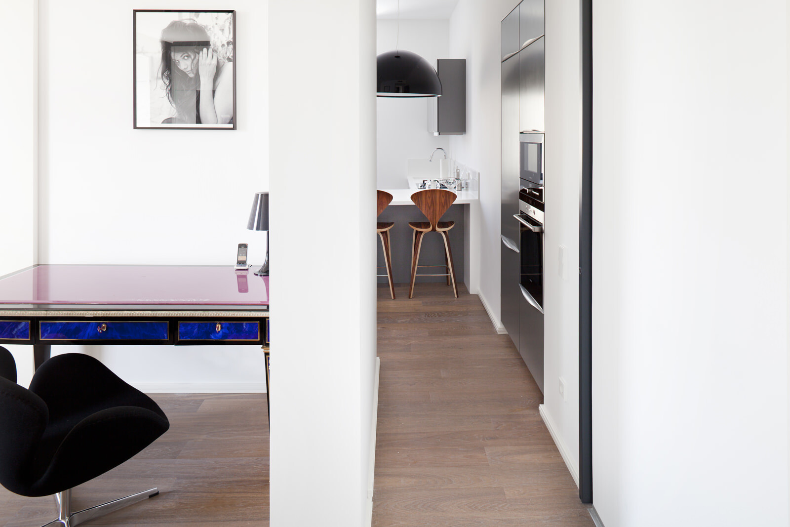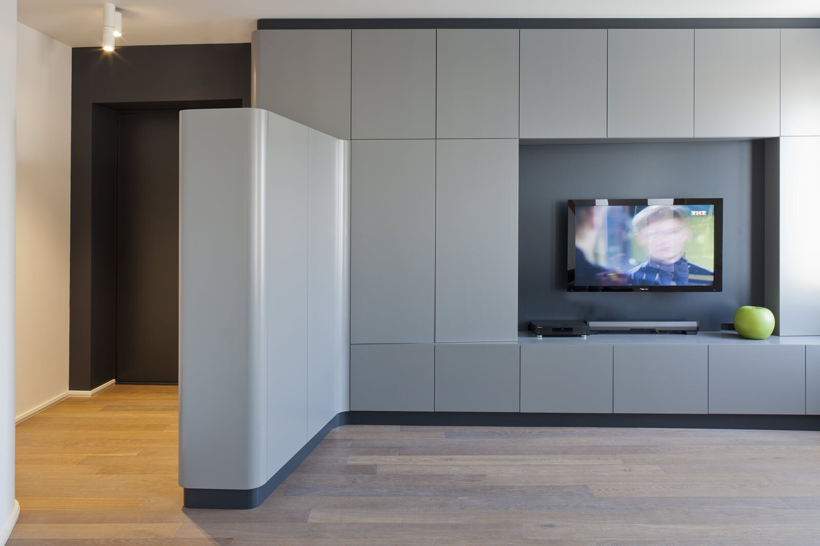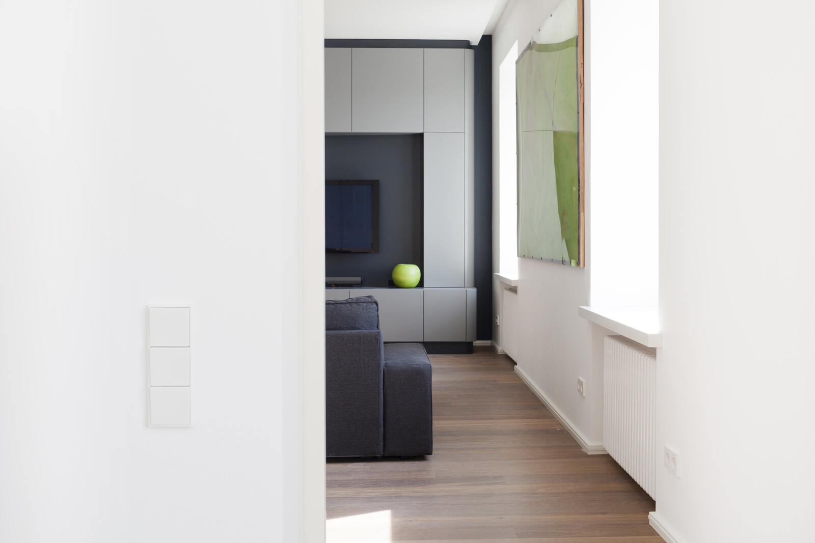 Die Wohnung befindet sich in einem bestehenden Gebäude im Zentrum von Moskau mit Blick auf einen Park. Das typische Moskauer Altstadthaus hat eine Geschosshöhe von rund 3,30 Metern. Der bestehende Grundriss der Wohnung mit Wohnzimmer, Schlafzimmer, Küche und Bad/WC blieb weitestgehend erhalten. Für größtmögliche Bewegungsfreiheit und Flexibilität wurden raumhohe Schiebetüren eingebaut. Sie verleihen der Wohnung ein großzügiges Raumgefühl und repräsentativen Charakter. Geöffnet treten die Türen in den Hintergrund und sorgen für fließende Übergänge zwischen den Räumen. Dabei bleibt die Außenwand raumübergreifend als durchgängige Fensterfront erhalten. Eine Voutenbeleuchtung entlang der Fensterfront unterstreicht diesen besonderen Eindruck. Im Wohnzimmer bietet ein Einbauschrank Stauraum und definiert zugleich die Eingangssituation – über Eck eingebaut dient er als Trennwand zwischen Wohnraum und Eingang und bildet einen geschützten Eingangsbereich. Dieses Einbauelement wie auch die Einbauwand in Bad und WC und die Küche wurde nach Entwürfen von 4a Architekten gebaut. In der Küche geht die Arbeitsplatte aus Corian nahtlos in einen Esstisch über. Das ermöglicht eine optimale Nutzung der zur Verfügung stehenden Fläche und greift die klare Gestaltungslinie auf.