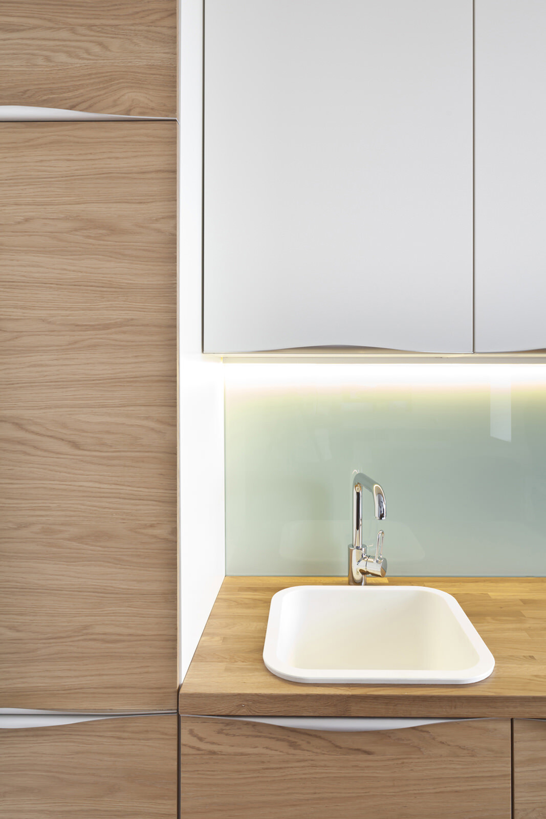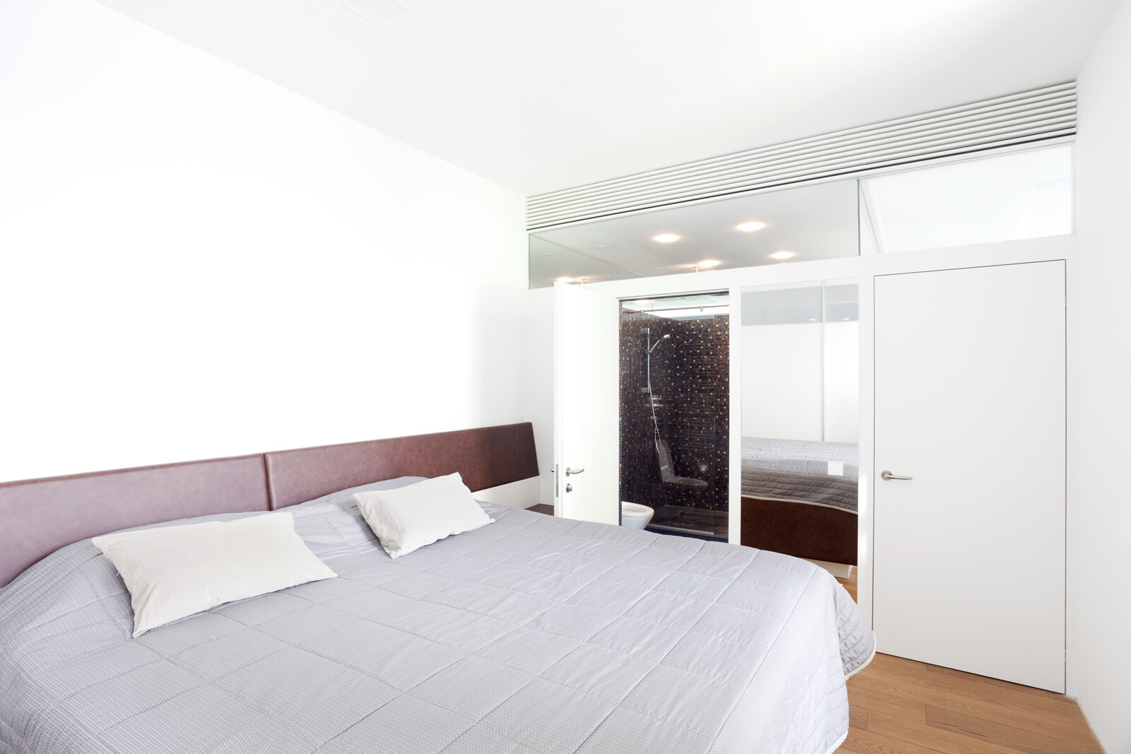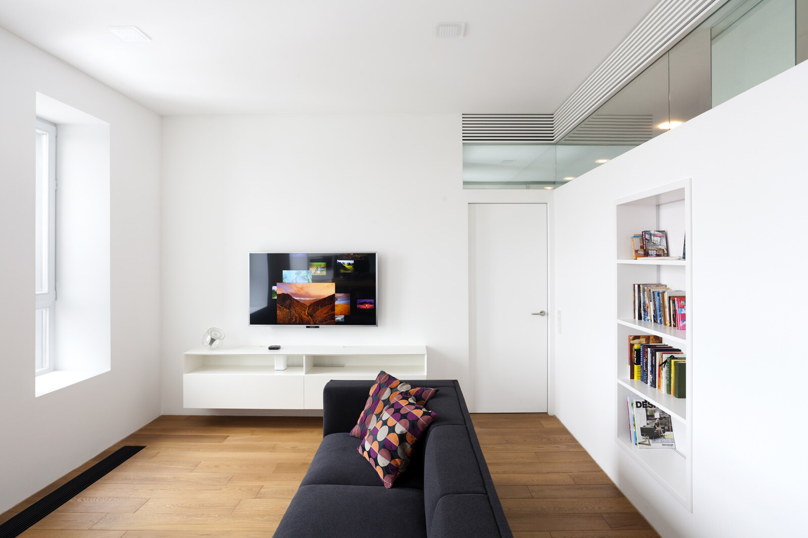 Die rund 60 m² große Wohnung befindet sich im 38. Stock des Wohnhochhauses Villange in Moskau, für das 4a Architekten die Fassadengestaltung übernommen haben. Bereits während der Bauphase wurde die Raumaufteilung an die speziellen Anforderungen des Bauherrn angepasst. Bad, Gäste-WC und Abstellraum bilden einen Kern, um den der zentrale Wohn- und Essraum mit Küchenzeile und das Schlafzimmer angeordnet sind. Oberlichter sorgen für Tageslicht in den innen liegenden Räumen und fassen die Kernelemente optisch zu einer Einheit zusammen. Ein zentraler Entwurfsgedanke war, trotz der kleinen Grundfläche ein großzügiges Raumgefühl im Innenraum entstehen zu lassen. Dafür sorgen die rund 2,90 Meter hohen Decken im Wohn- und Schlafraum und die helle Gestaltung der Räume. Diese reduzierte Optik unterstreicht das großzügige Raumgefühl und ermöglicht dem Bauherrn größtmögliche Flexibilität und persönlichen Gestaltungsfreiraum. Sämtliche Innenausbauten wurden von 4a Architekten entworfen und vor Ort gebaut. Die speziell auf die Raumsituation abgestimmten Elemente unterstreichen die klare Formensprache. Eine abgehängte Decke im Bad ermöglicht den unsichtbaren Einbau der Klimatechnik, über Gitter an der Stirnseite erfolgt die Belüftung der innen liegenden Räume.