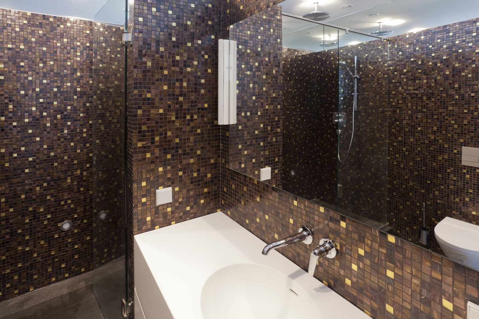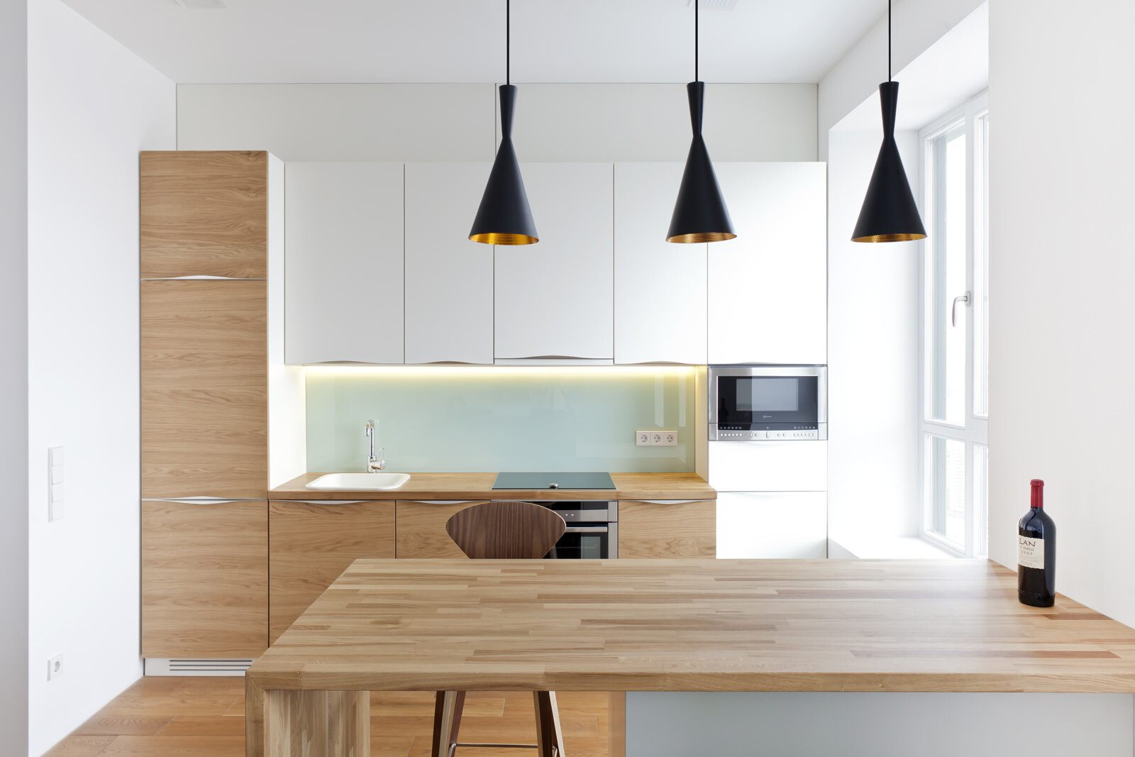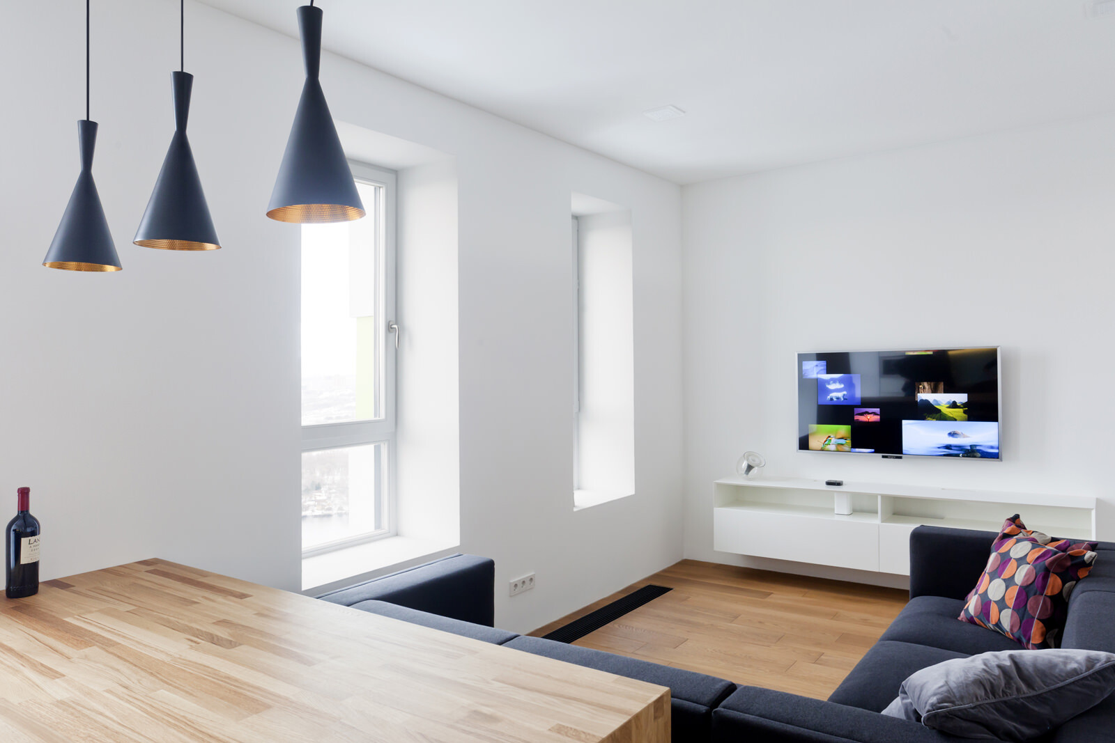 Die rund 60 m² große Wohnung befindet sich im 38. Stock des Wohnhochhauses Villange in Moskau, für das 4a Architekten die Fassadengestaltung übernommen haben. Bereits während der Bauphase wurde die Raumaufteilung an die speziellen Anforderungen des Bauherrn angepasst. Bad, Gäste-WC und Abstellraum bilden einen Kern, um den der zentrale Wohn- und Essraum mit Küchenzeile und das Schlafzimmer angeordnet sind. Oberlichter sorgen für Tageslicht in den innen liegenden Räumen und fassen die Kernelemente optisch zu einer Einheit zusammen. Ein zentraler Entwurfsgedanke war, trotz der kleinen Grundfläche ein großzügiges Raumgefühl im Innenraum entstehen zu lassen. Dafür sorgen die rund 2,90 Meter hohen Decken im Wohn- und Schlafraum und die helle Gestaltung der Räume. Diese reduzierte Optik unterstreicht das großzügige Raumgefühl und ermöglicht dem Bauherrn größtmögliche Flexibilität und persönlichen Gestaltungsfreiraum. Sämtliche Innenausbauten wurden von 4a Architekten entworfen und vor Ort gebaut. Die speziell auf die Raumsituation abgestimmten Elemente unterstreichen die klare Formensprache. Eine abgehängte Decke im Bad ermöglicht den unsichtbaren Einbau der Klimatechnik, über Gitter an der Stirnseite erfolgt die Belüftung der innen liegenden Räume.