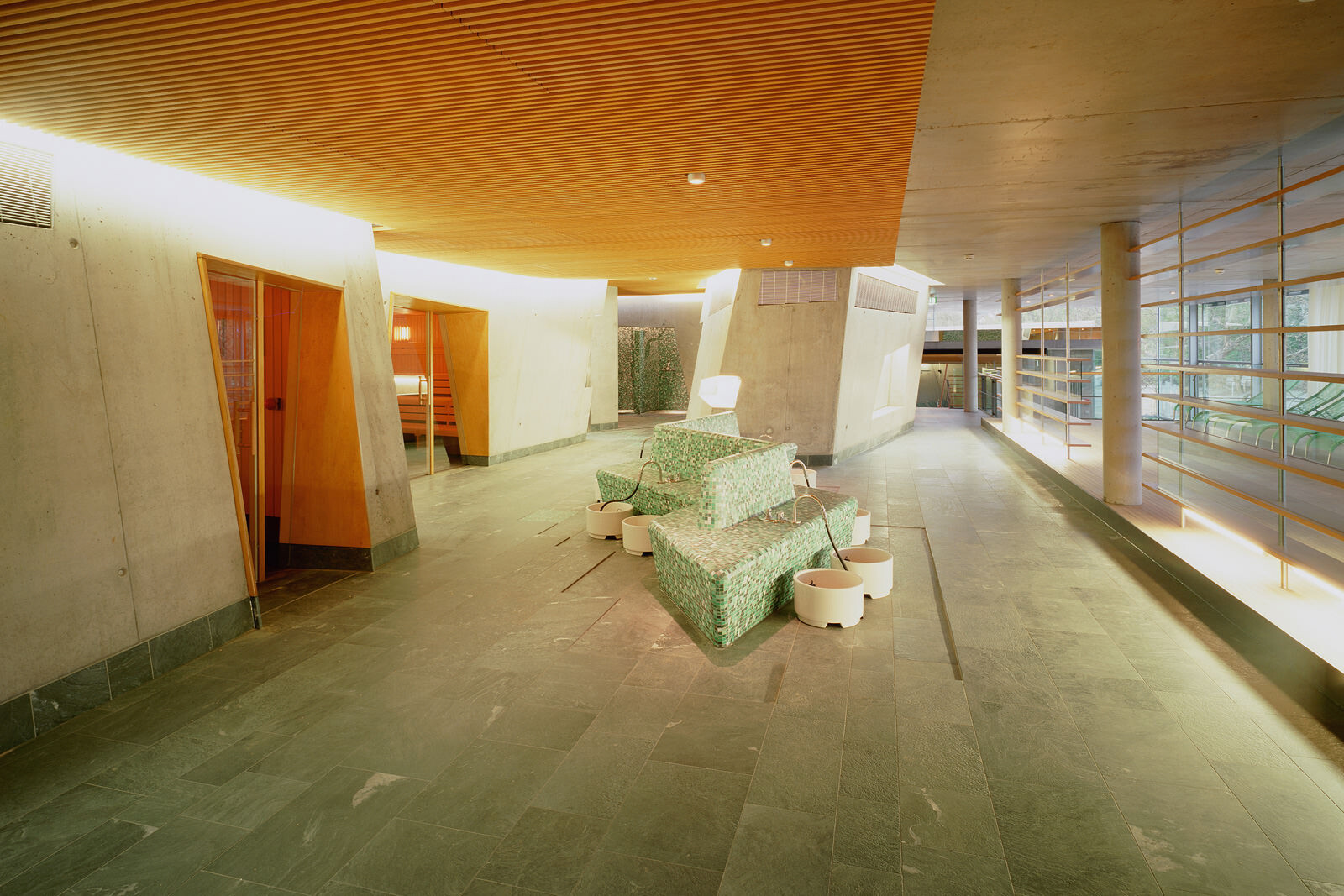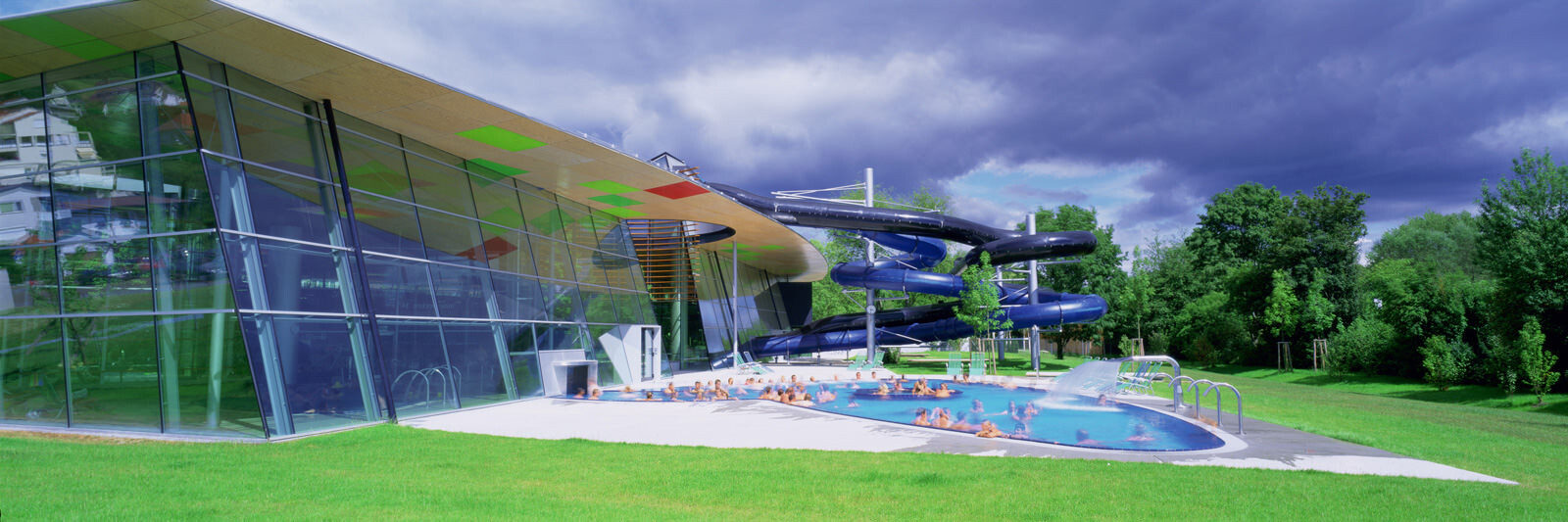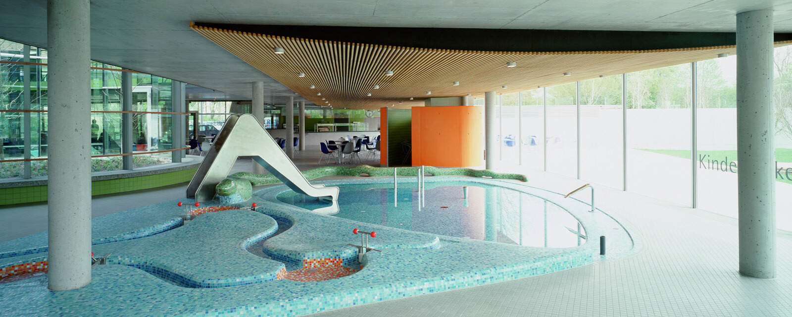 Das Leitbild des Freizeit- und Thermalbades wurde aus Themen der umgebenden Landschaft entwickelt: Quelltöpfe und Höhlen der Alb, steile Felswände des Donautals, große Bäume des Schwarzwaldes. Dabei wurde der Begriff „Badelandschaft“ nahezu wörtlich umgesetzt. Die graue Grundplatte im Außenbereich verwandelt sich innen in eine "steinerne" Seenplatte mit frei geformten blauen Becken. Zwischen den Becken stehen Bäume in Glaszylindern, die das Dach durchdringen. Über der Badelandschaft schwebt das große Dach. Grüntöne, Blau, Rot und Orange strahlen wie ein Blätterdach in den Raum. Das Farbkonzept zieht sich durch das gesamte Gebäude bis hin zu den farbig emaillierten Glaswänden der Umkleiden und den Spinden.